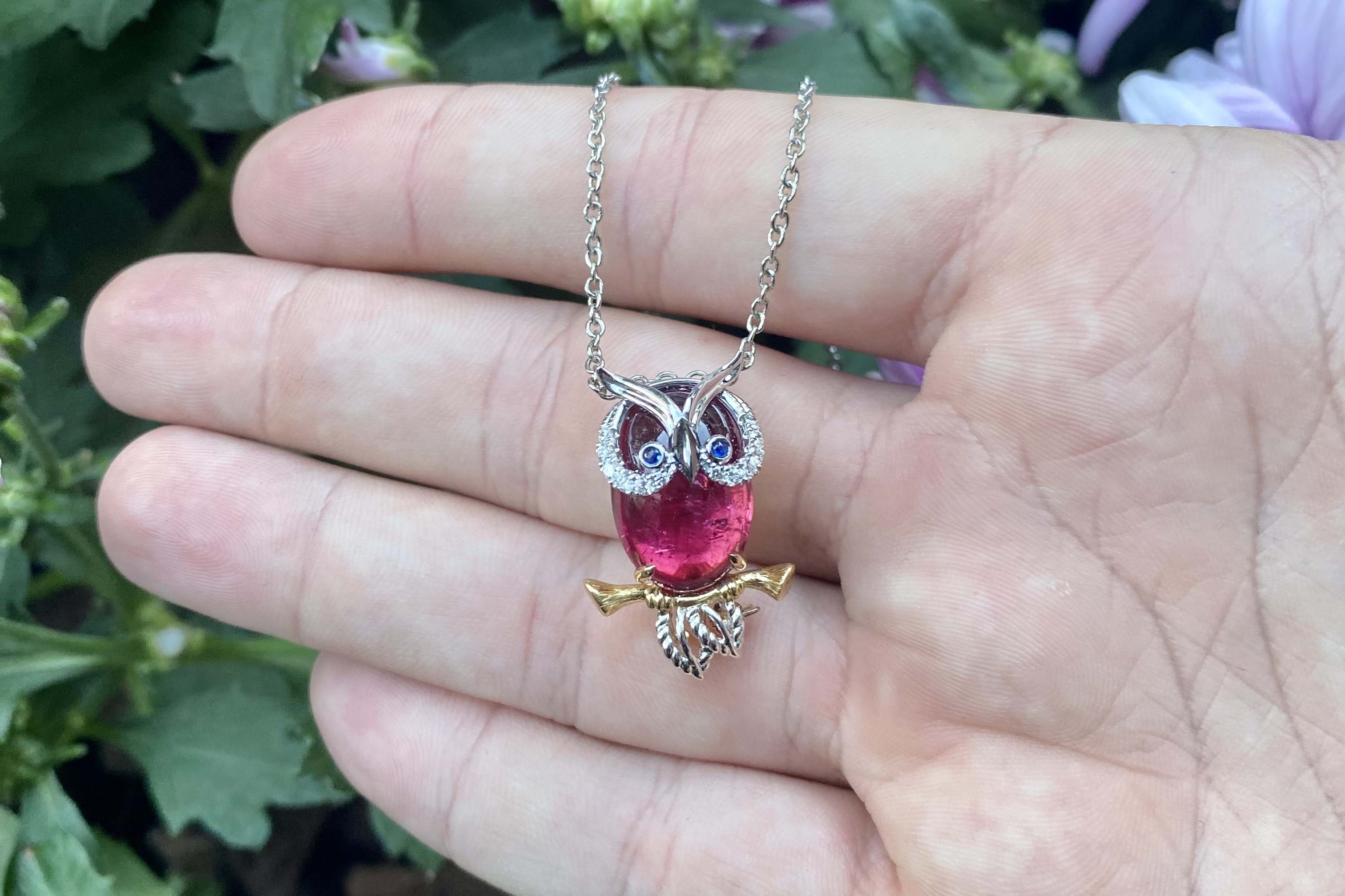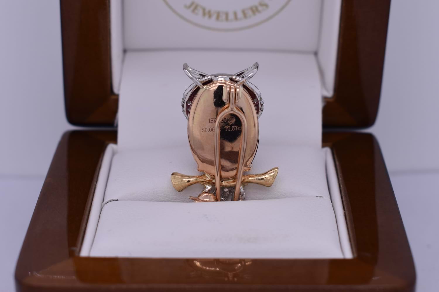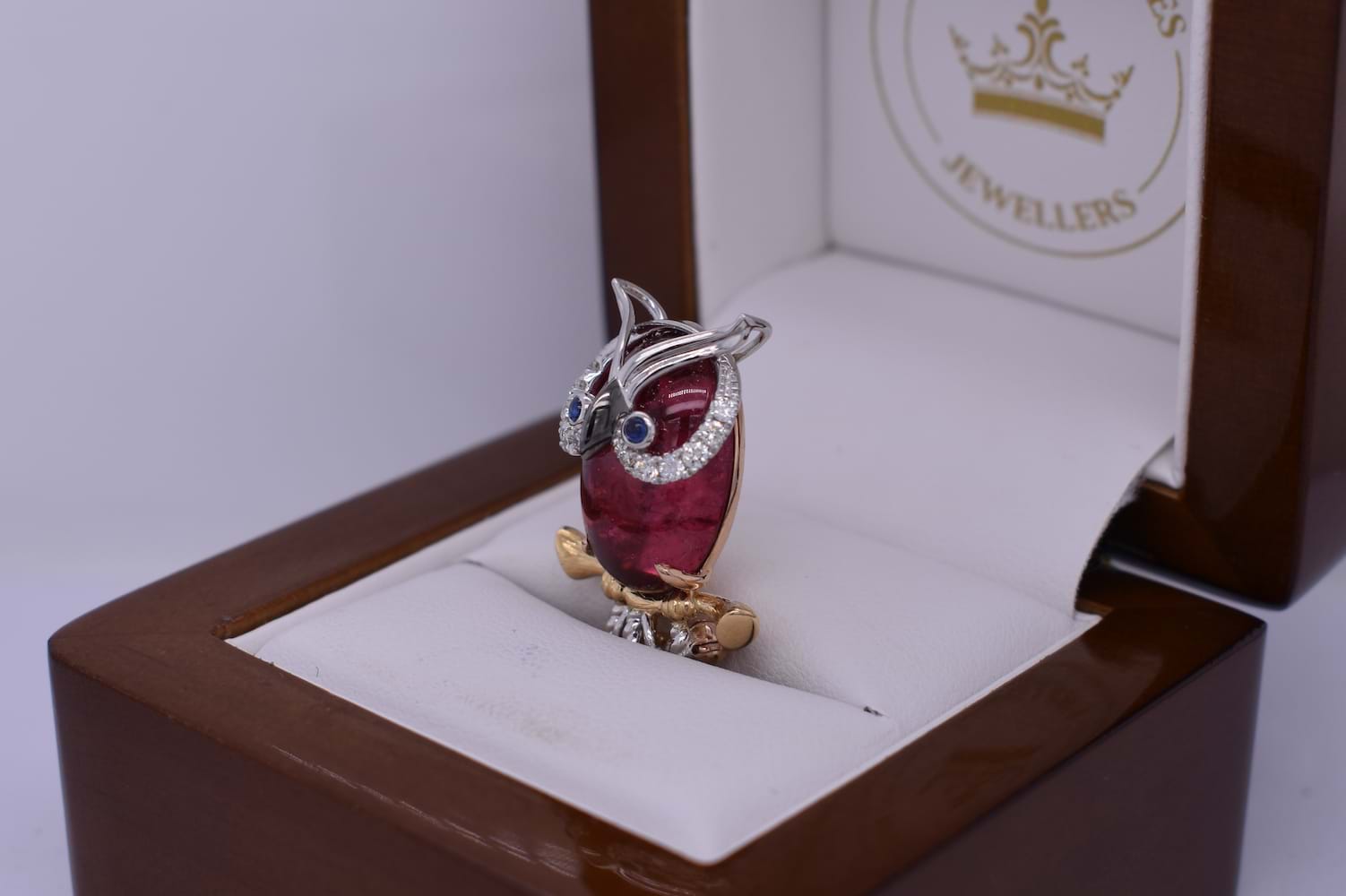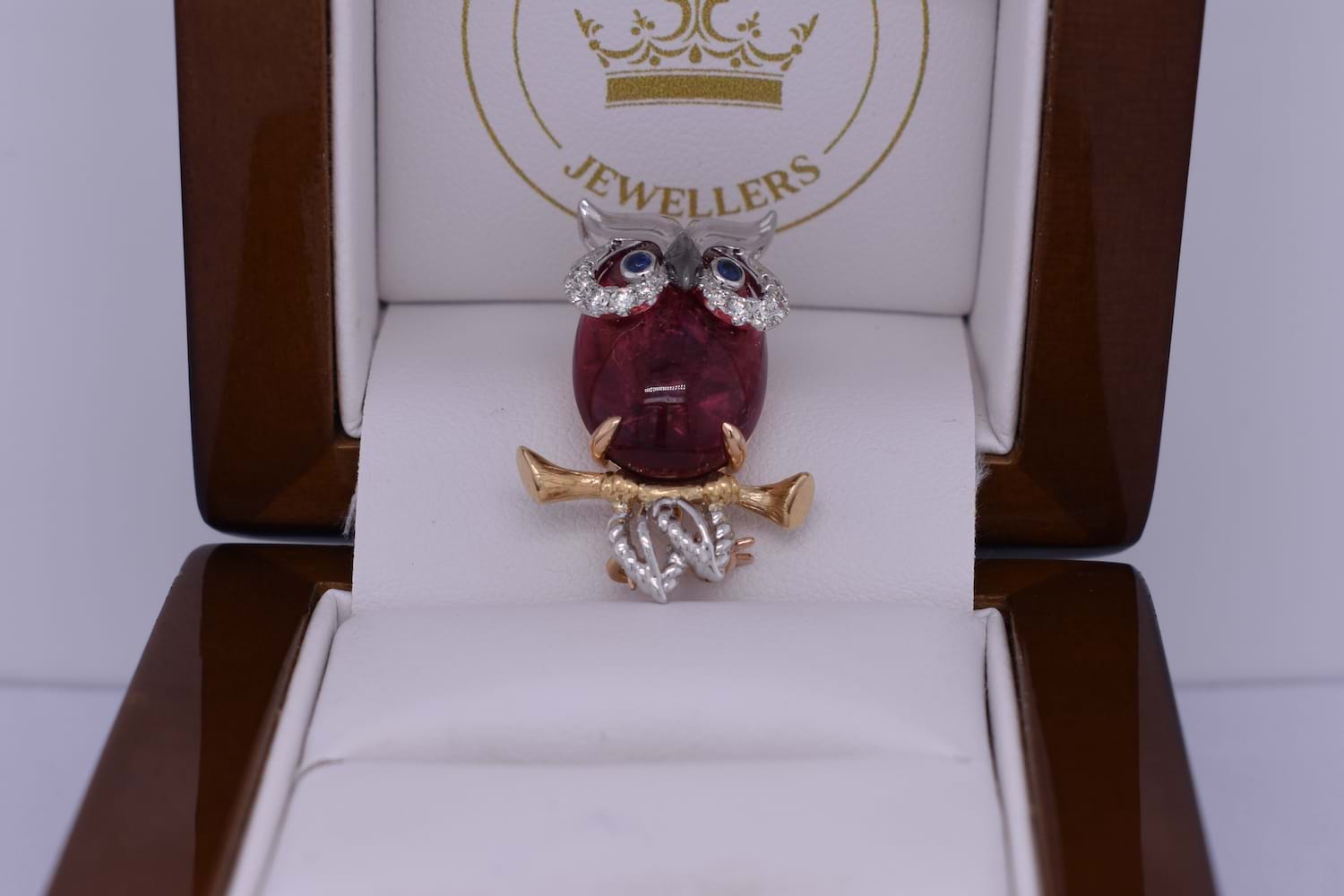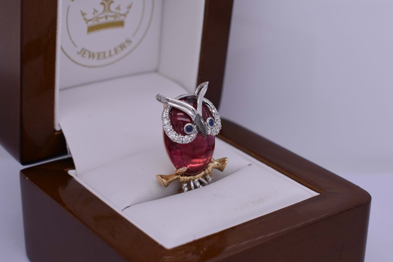 The cutest multi gemstone owl shaped brooch and pendant is crafted in 18ct yellow, white and rose gold. Featuring a 17.50x12.20x6.00mm cabochon pink tourmaline of 10.57ct, set with two round bright blue 1.60mm sapphires for eyes and 12 round brilliant cut 1.75-1.20mm diamonds equalling 0.18ct G SI. This versatile piece can be worn as a brooch or on a chain as a pendant. 7.39 grams. Independent Valuation Supplied.