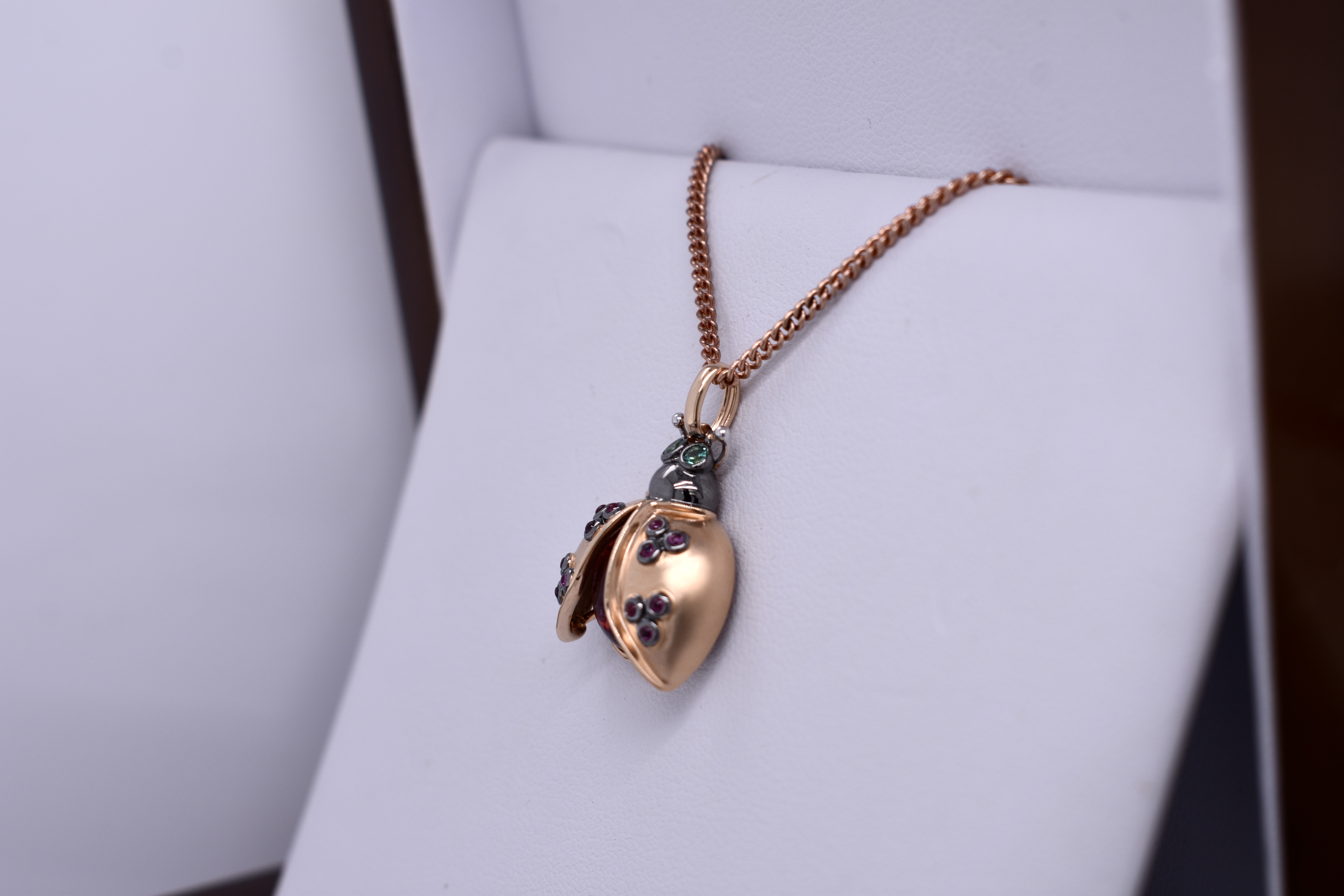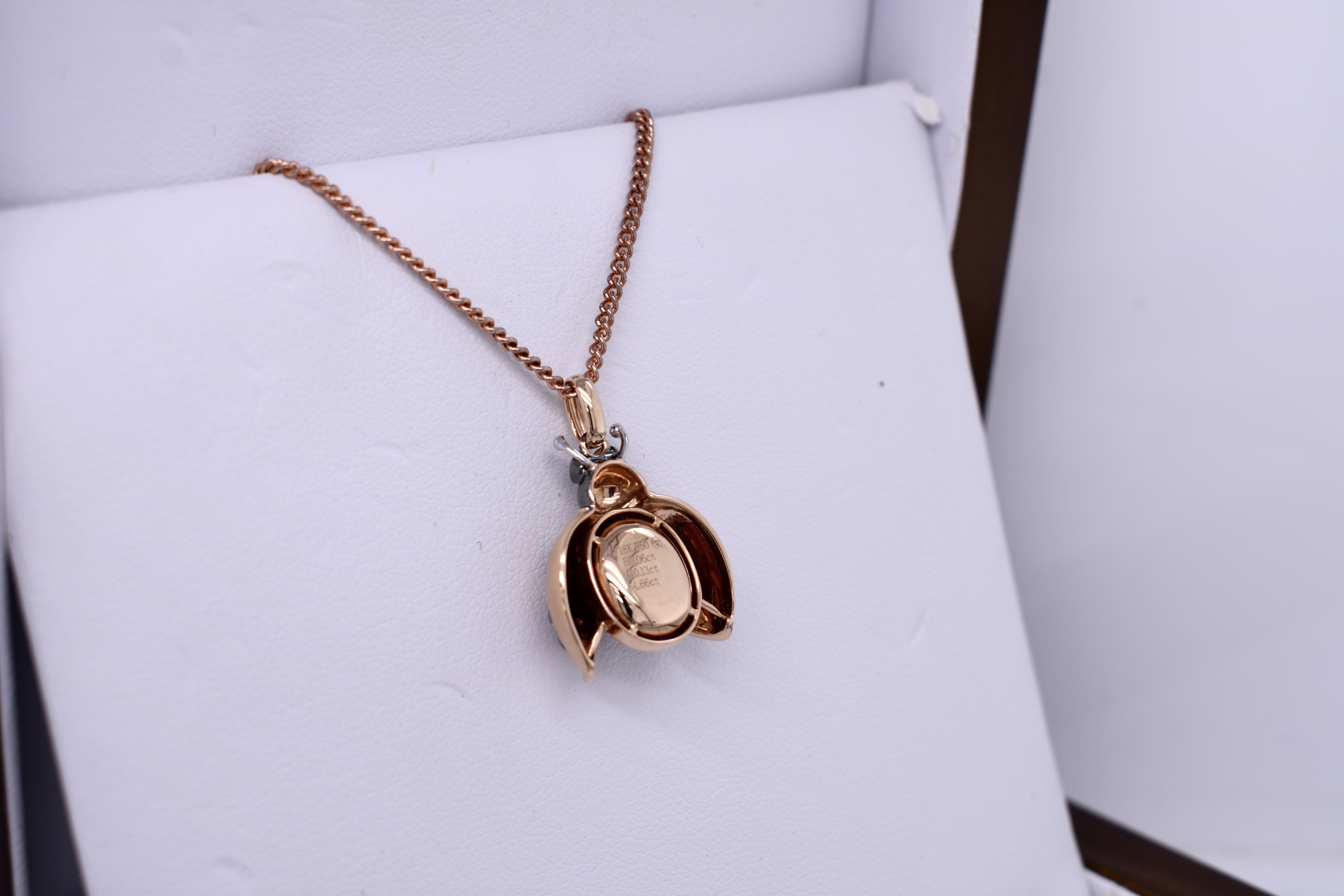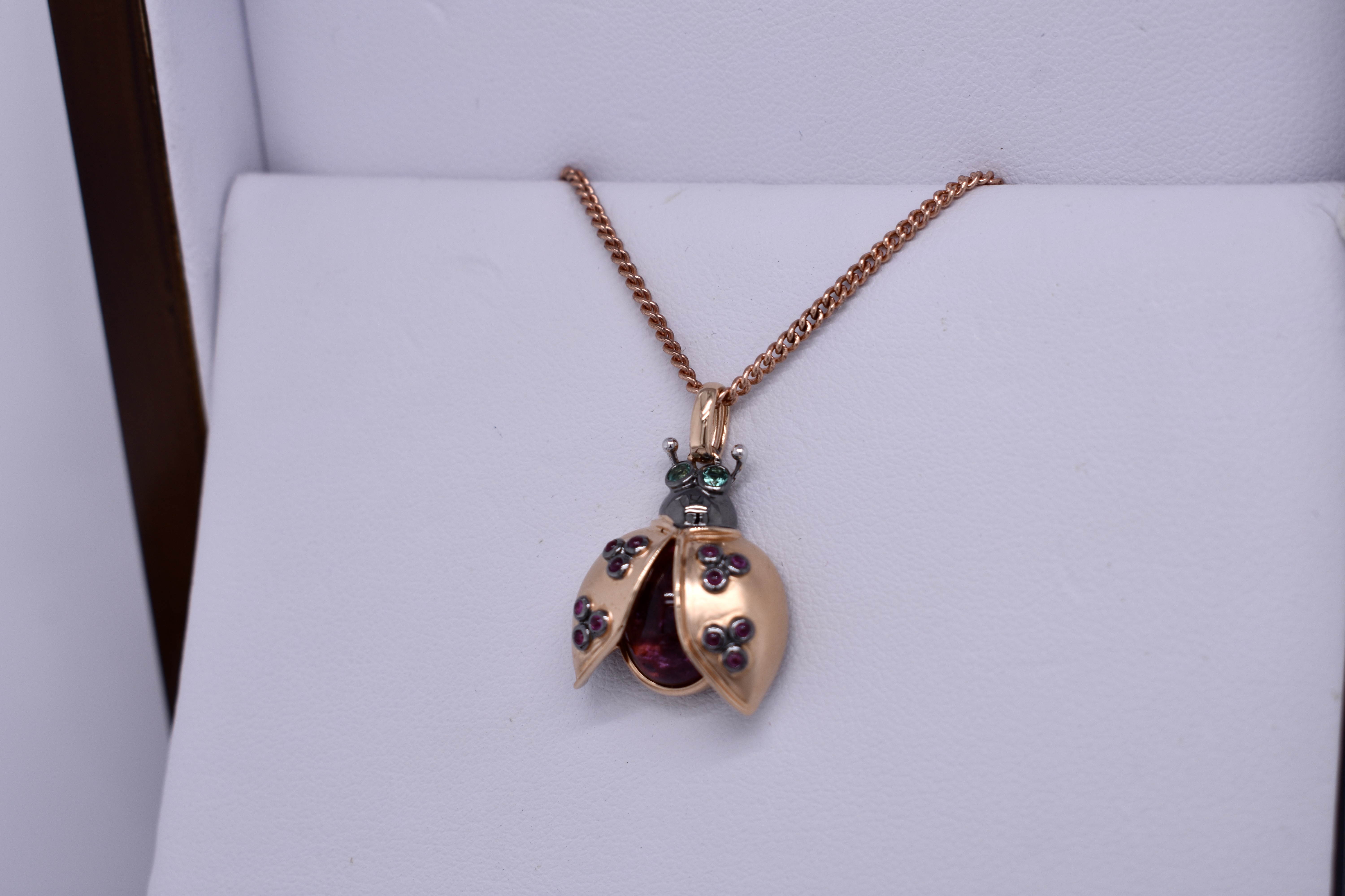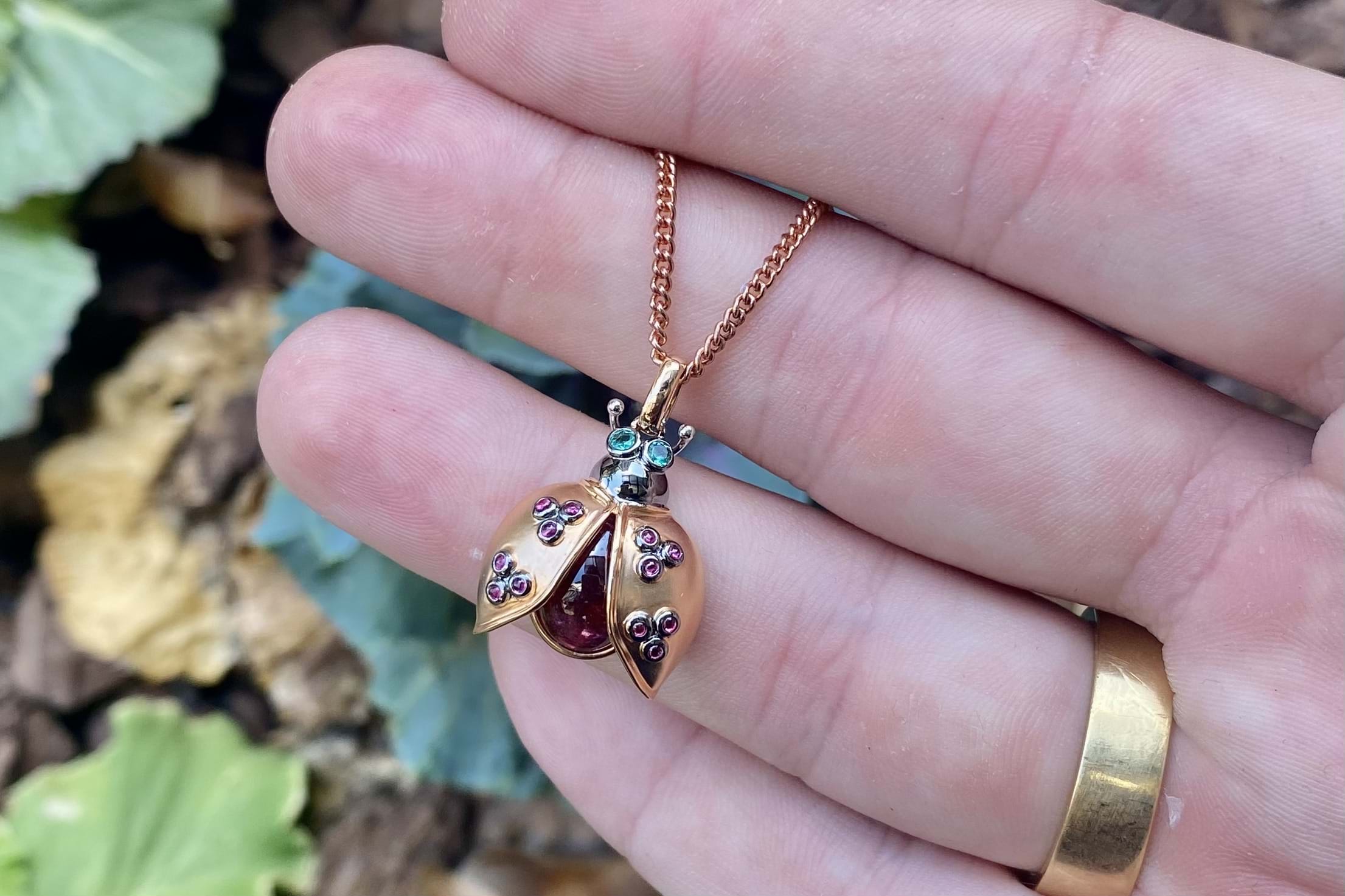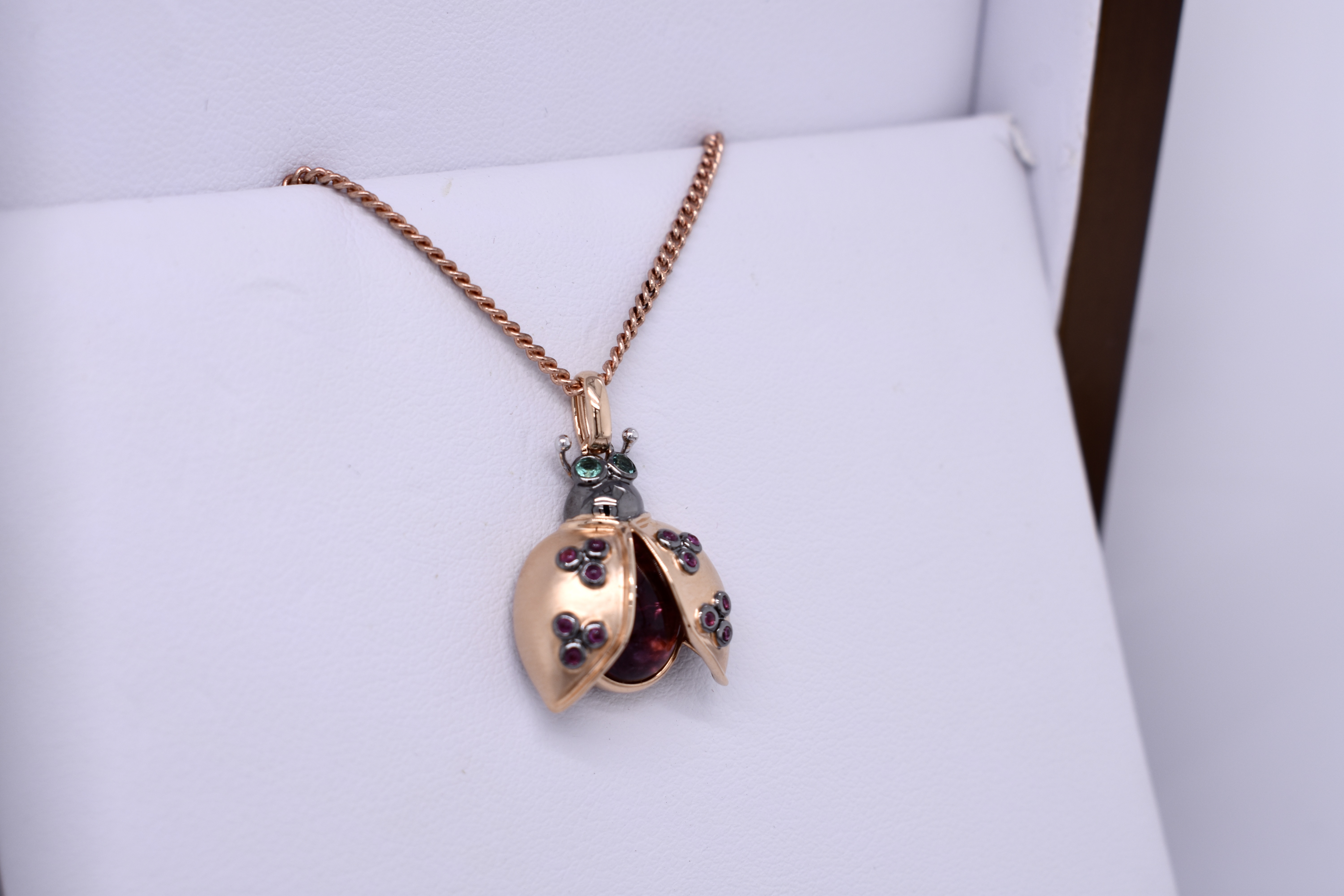 Crafted in 18ct rose gold, this adorable ladybug pendant is made with an oval cabochon 10x8mm pink tourmaline body totalling 4.66ct. The open wings are set with 12 cabochon pink-red rubies, equalling 0.13ct, and the eyes are 2.0mm round emeralds totalling 0.06ct. The head of the ladybug has a blackened finish and is suspended from a tapering oval bale. Whole pendant measures 25mm long and weighs 4.52 grams. Chains available for separate purchase. Independent Valuation Supplied