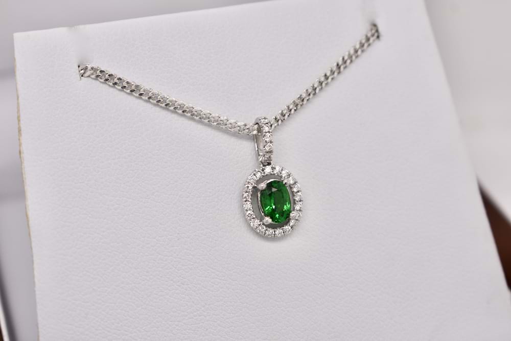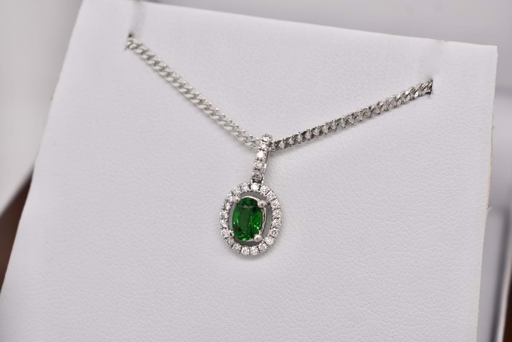 Bright and scintillating 0.58ct green Tsavorite Garnet set into an 18ct white gold halo design pendant. Total diamond content equals 0.19cts (G/VS)