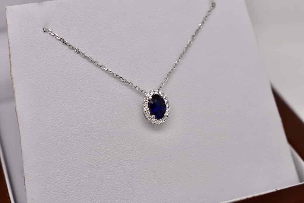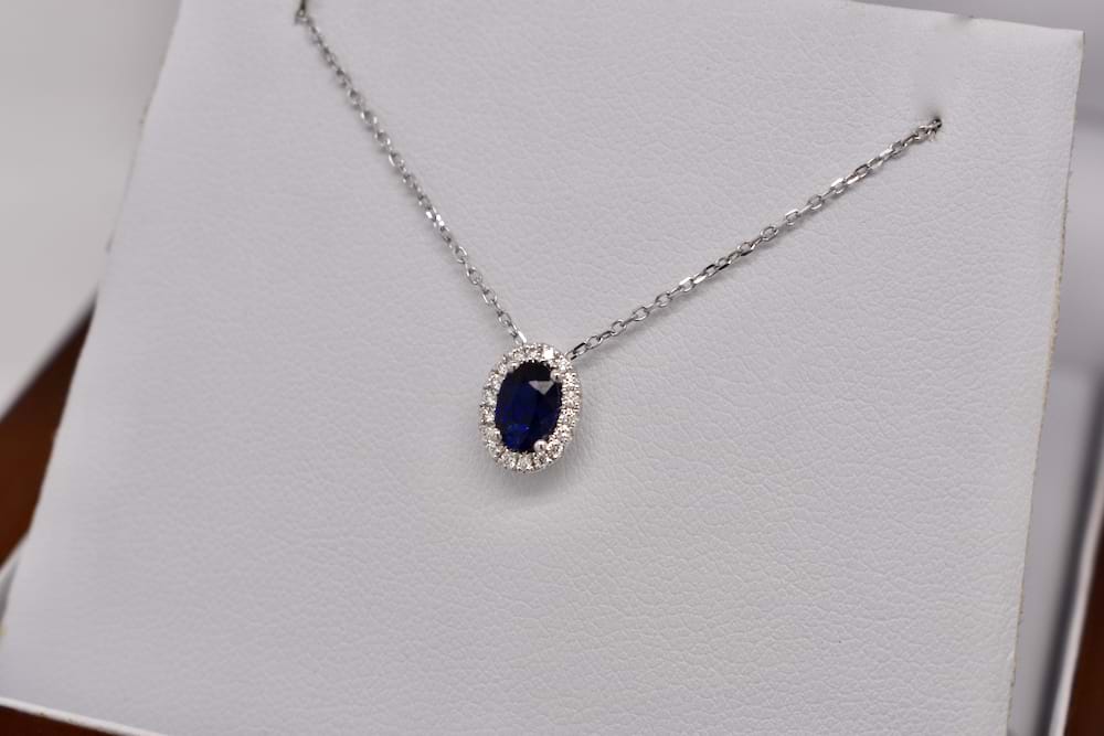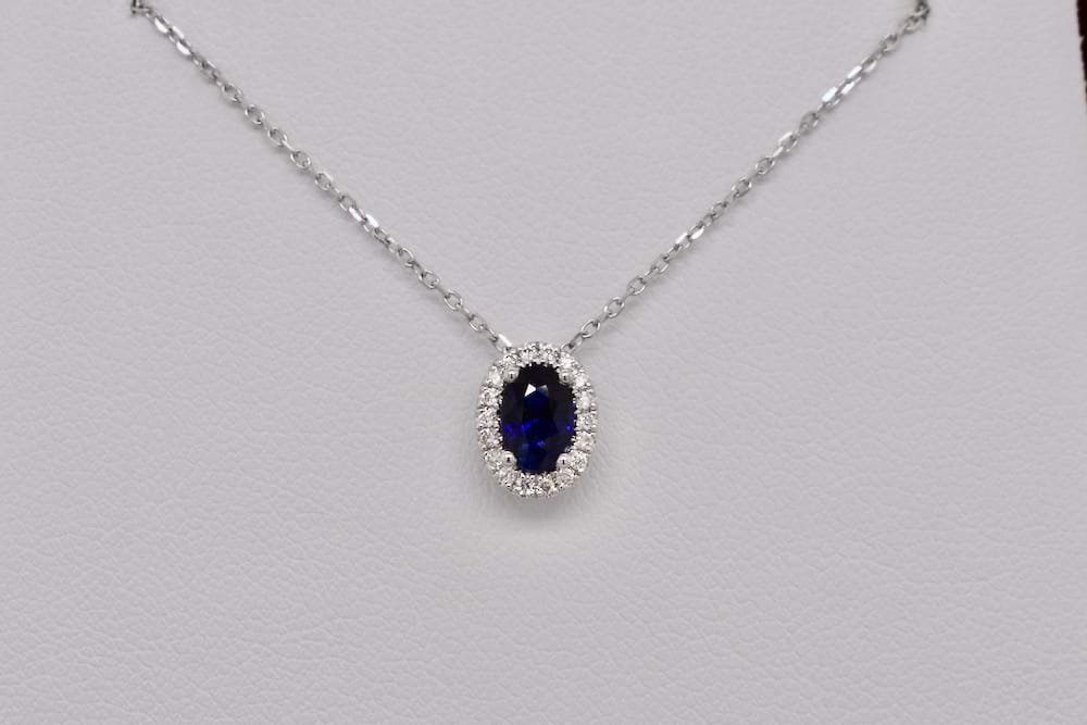 This beautiful oval 0.63ct Sri Lankan sapphire is set into a single row halo of sparkling round diamonds totalling 0.08cts (GVS) and slides effortlessly along the 18ct white gold delicate trace link chain. Chain measures 46cm. Independent valuation supplied