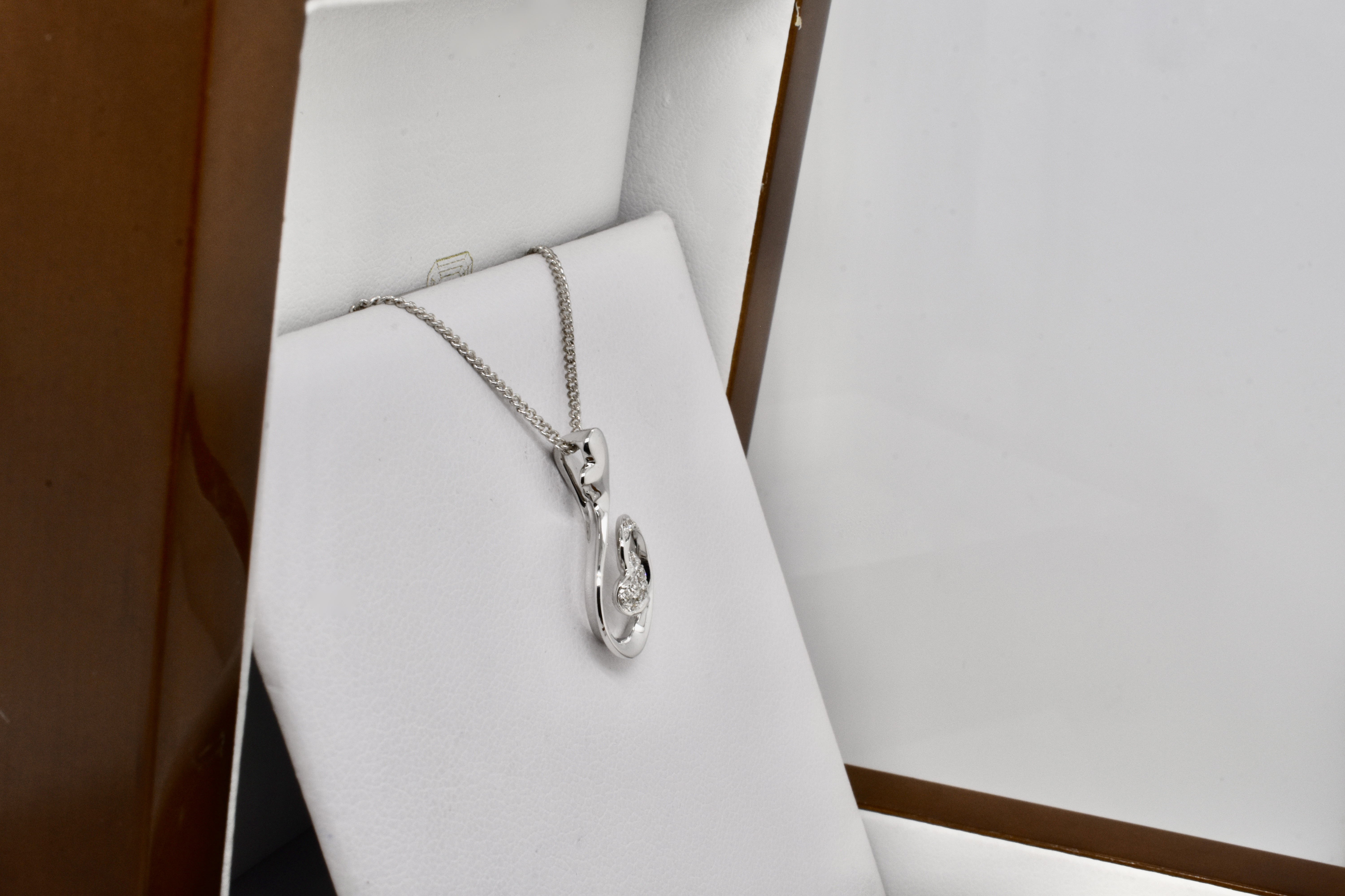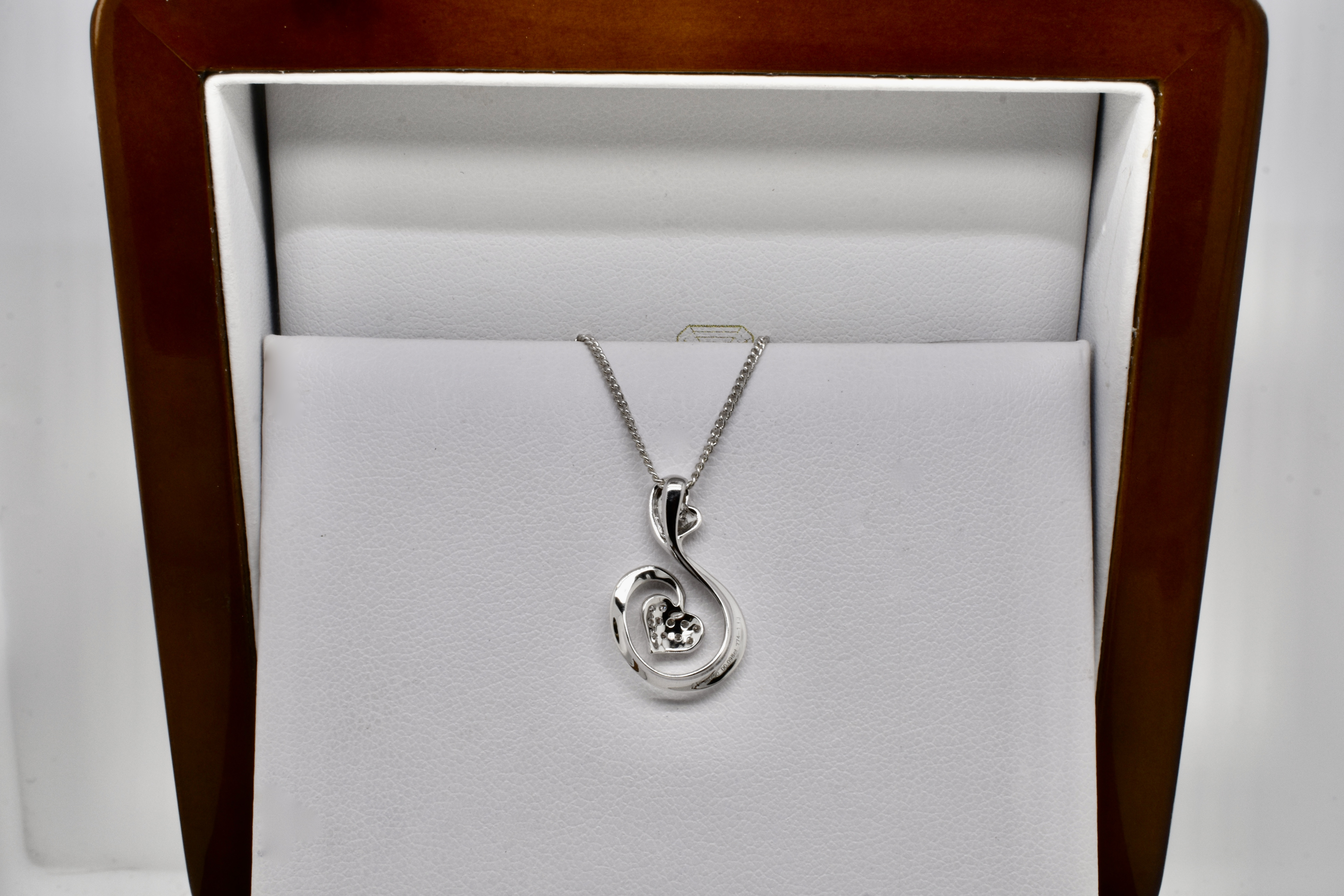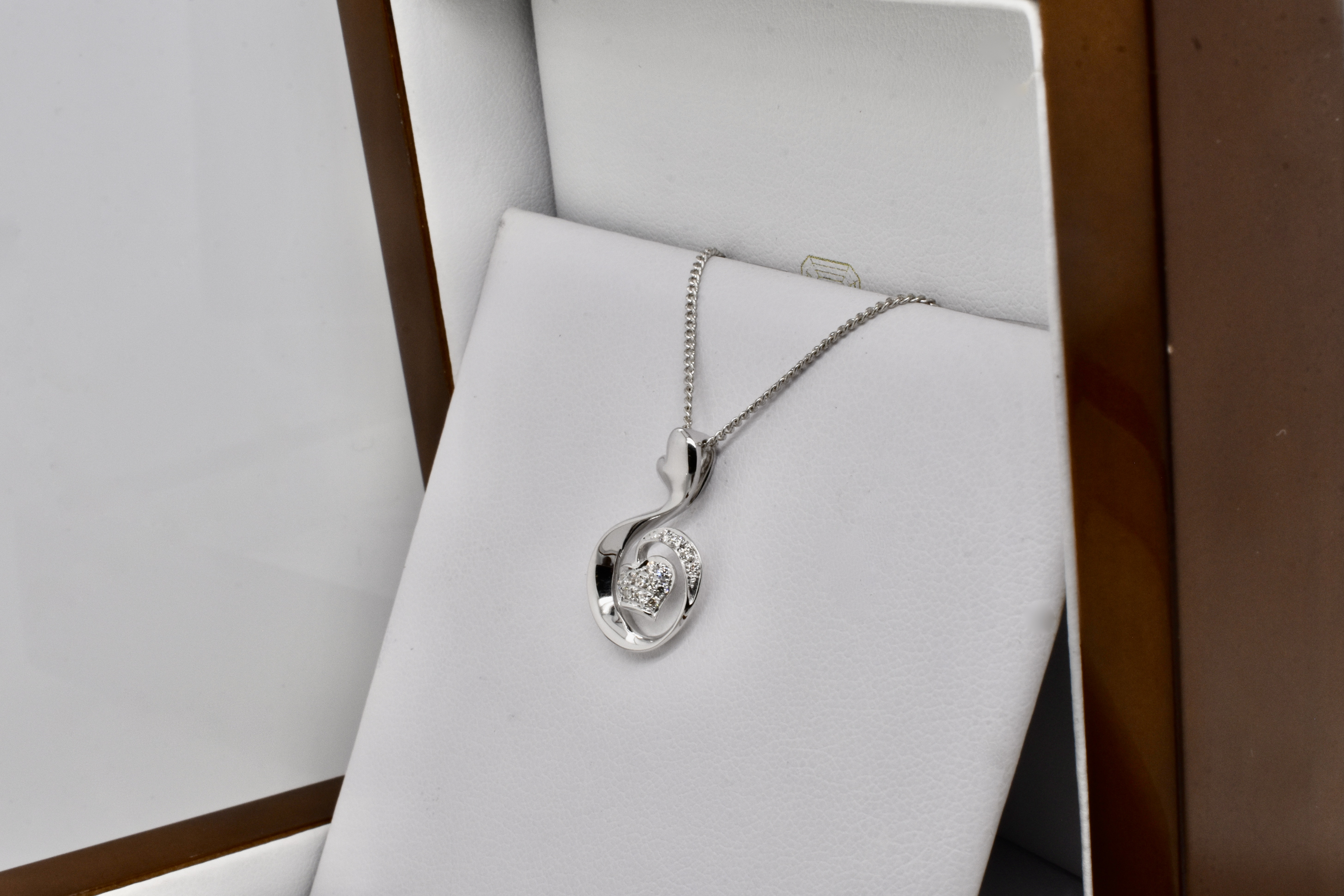A gorgeous 18ct white gold pendant in a swirl design with a heart and set with 15 sparkly round brilliant cut diamonds totalling 0.098ct. Pendant measures approximately 19 x 13mm. Chains available for separate purchase