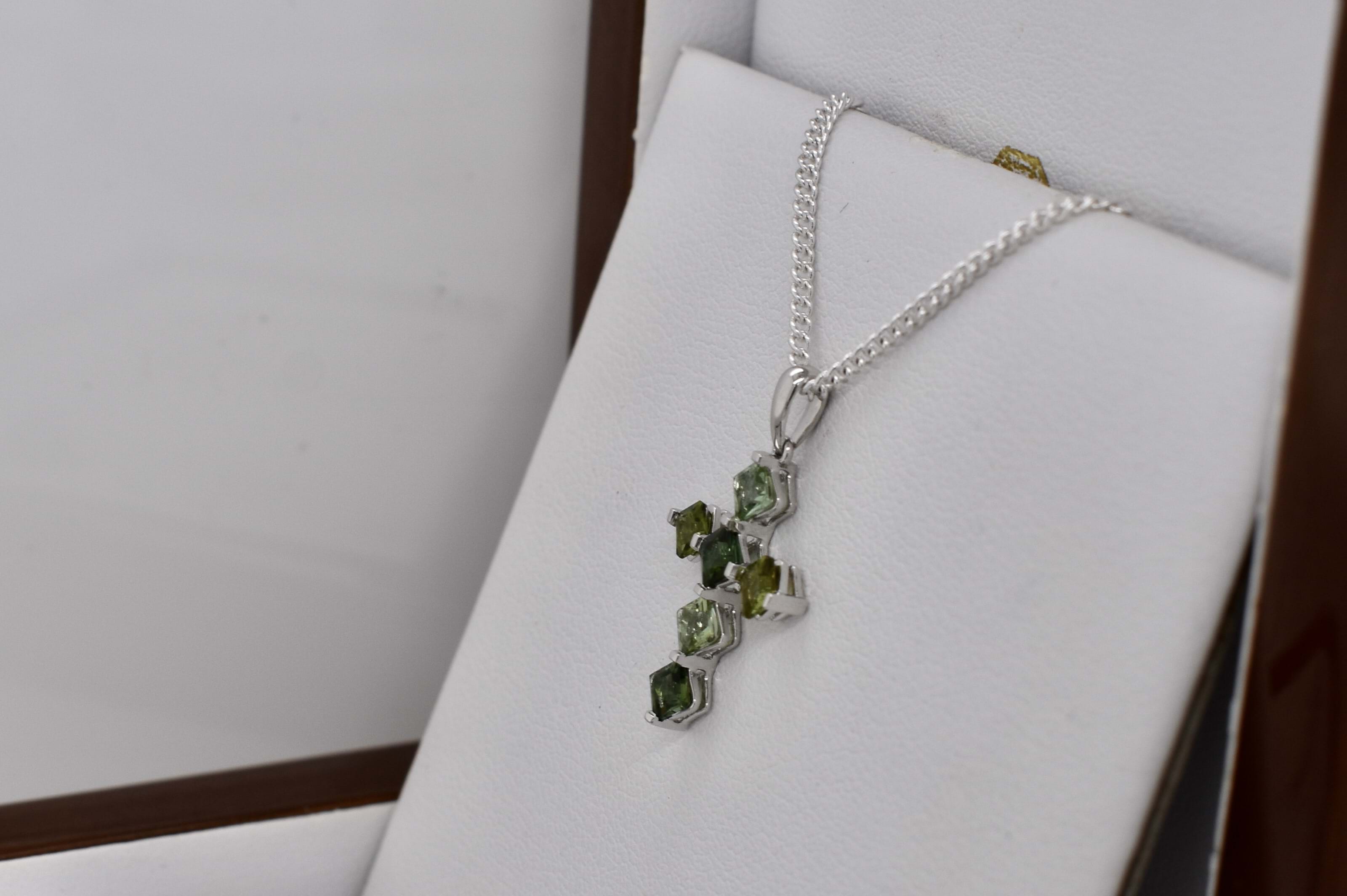 Crafted in 18ct white gold, this lovely green tourmaline pendant features 6 tourmalines, totalling 1.21ct light green, lime green and dark green tones. Each stone is claw set in a cross design with a plane bale. Chains available for separate purchase.