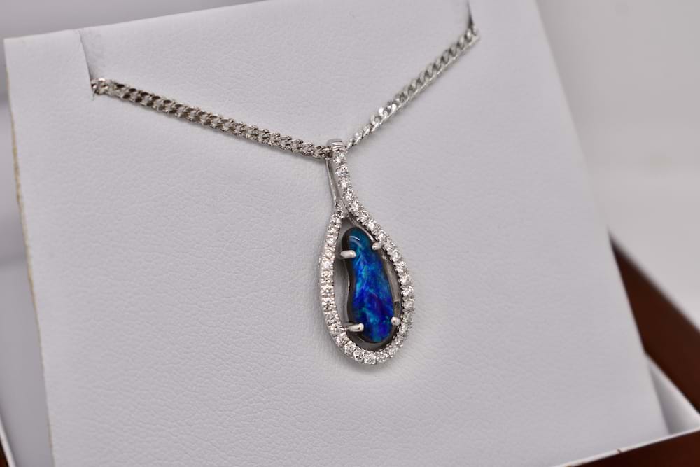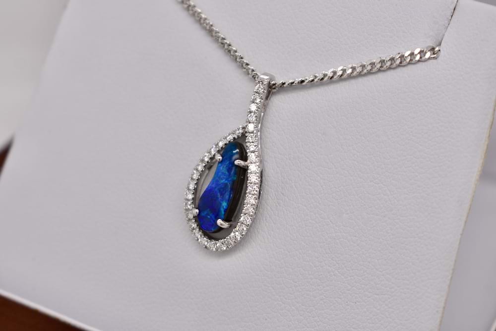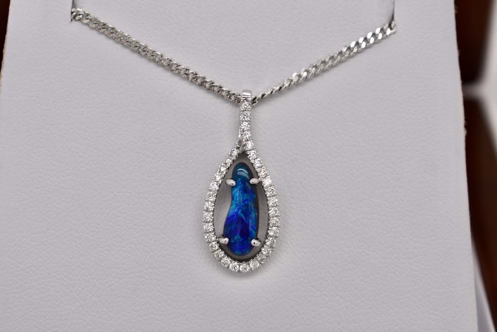 This freeform solid black opal of 1.36cts has been very cleverly set into a stunning teardrop shape halo of shimmering diamonds. Crafted in 18ct white gold the pendant contains a total of 33 diamonds totaling 0.28cts