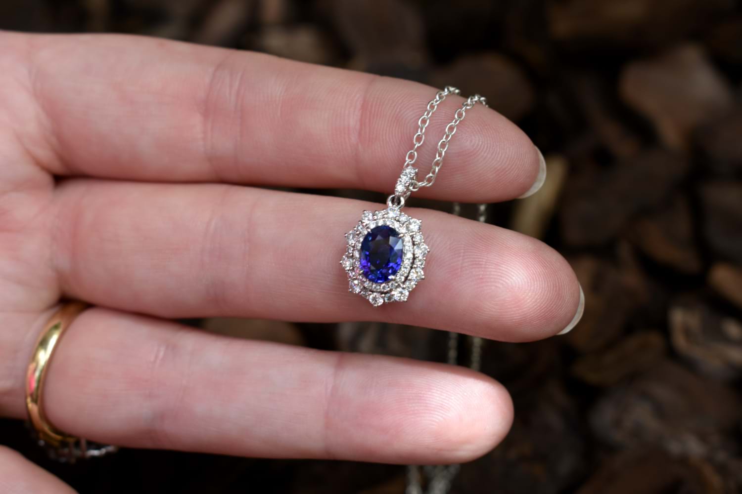 A beautiful bright, deep blue, 1.68ct oval sapphire set into a feminine and antique style 18ct white gold diamond pendant. The sapphire is surrounded by a delicate, single line of sparkling diamonds to contrast the gorgeous blue colour, with an outer surround of larger diamonds set with 2&3 claws to give the piece a vintage feel. The pendant contains a total of 46 diamonds totalling 0.60ct FGVS-SI.