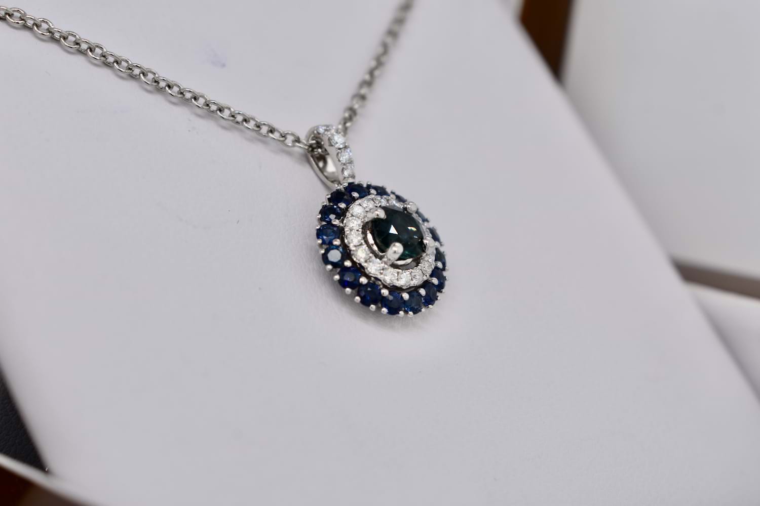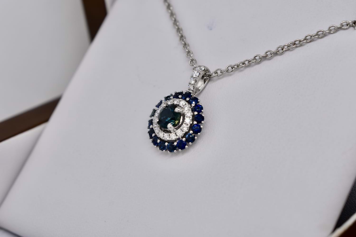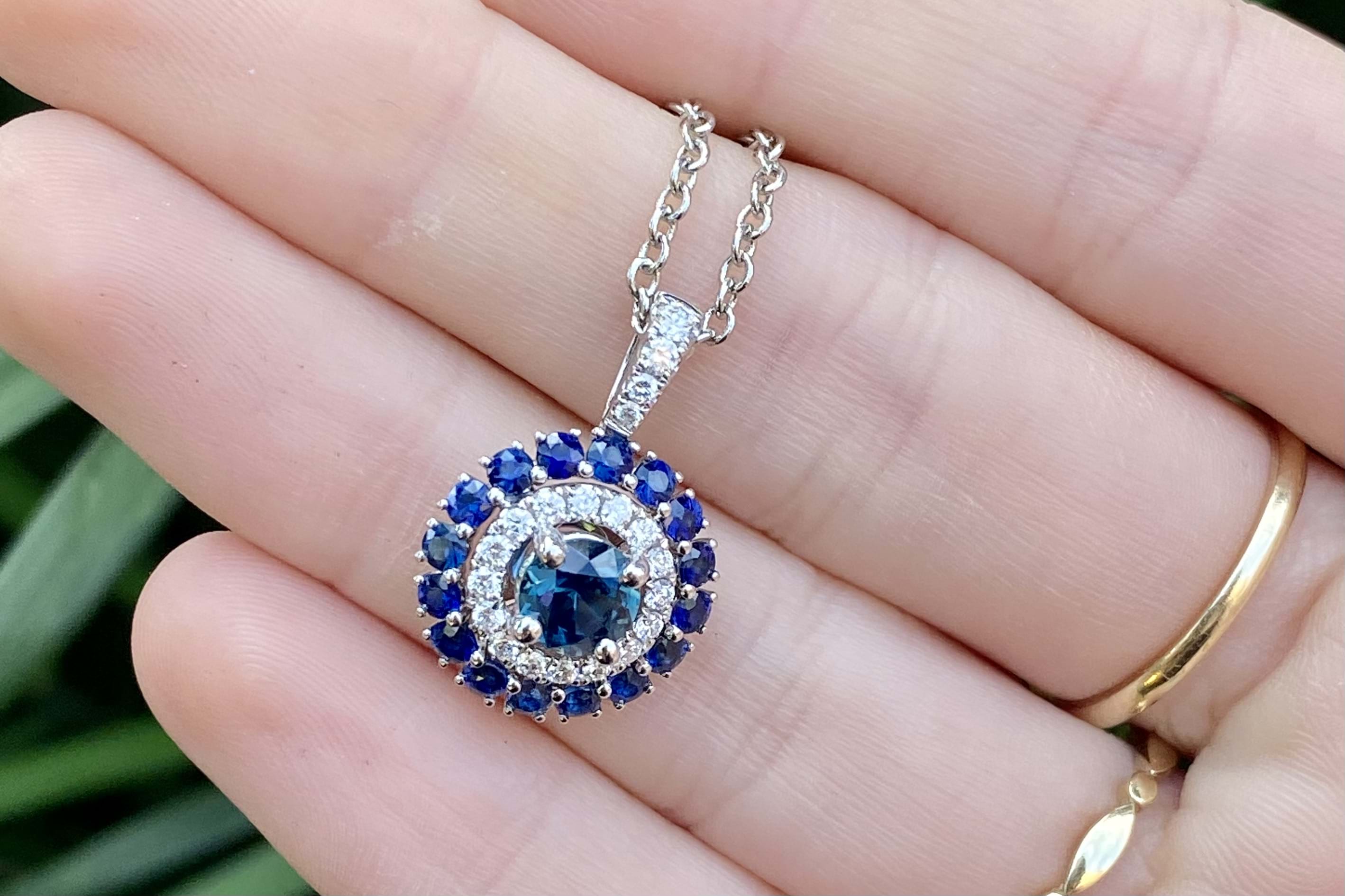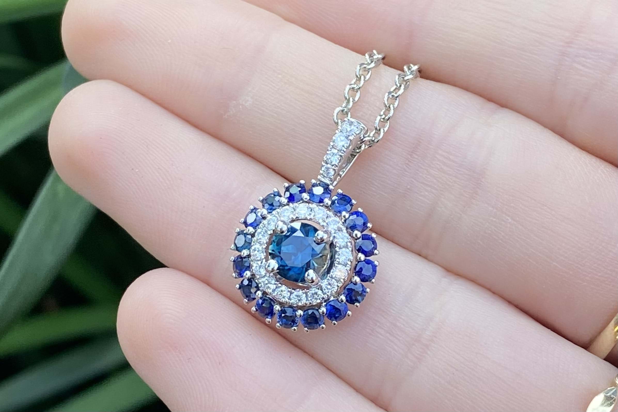 This beautiful pendant is crafted in 18ct white gold, set with a stunning centre, 0.83ct mid-dark blue Australian sapphire (four claw set) with a sparkling halo of diamonds with diamond bail detail. Total of twenty diamonds equalling 0.27ct FGVS/SI. Finished with another outer halo of sixteen Australian sapphires totalling 0.89ct. (1.72ct sapphires in total). Chains available for separate purchase. Independent Valuation Supplied