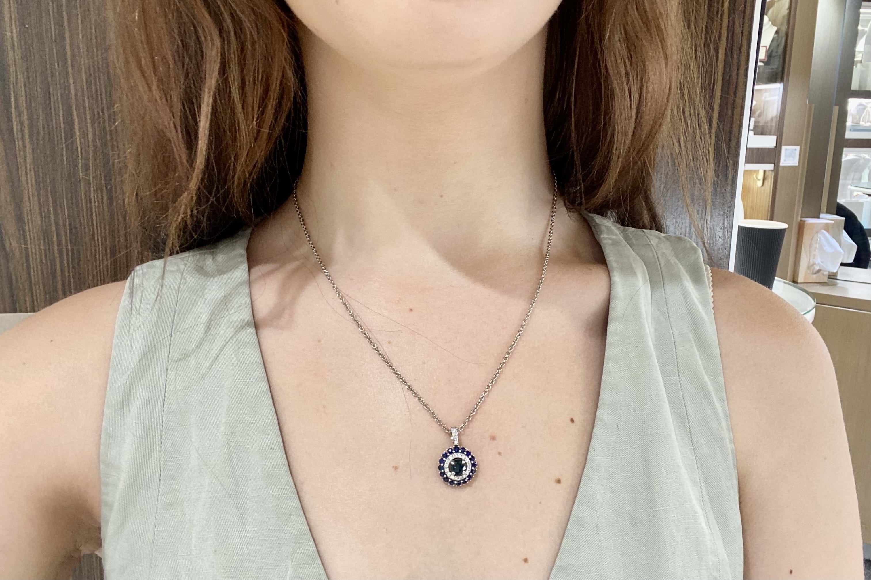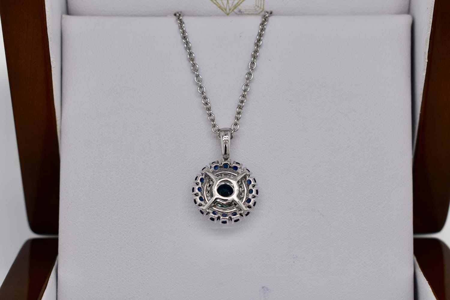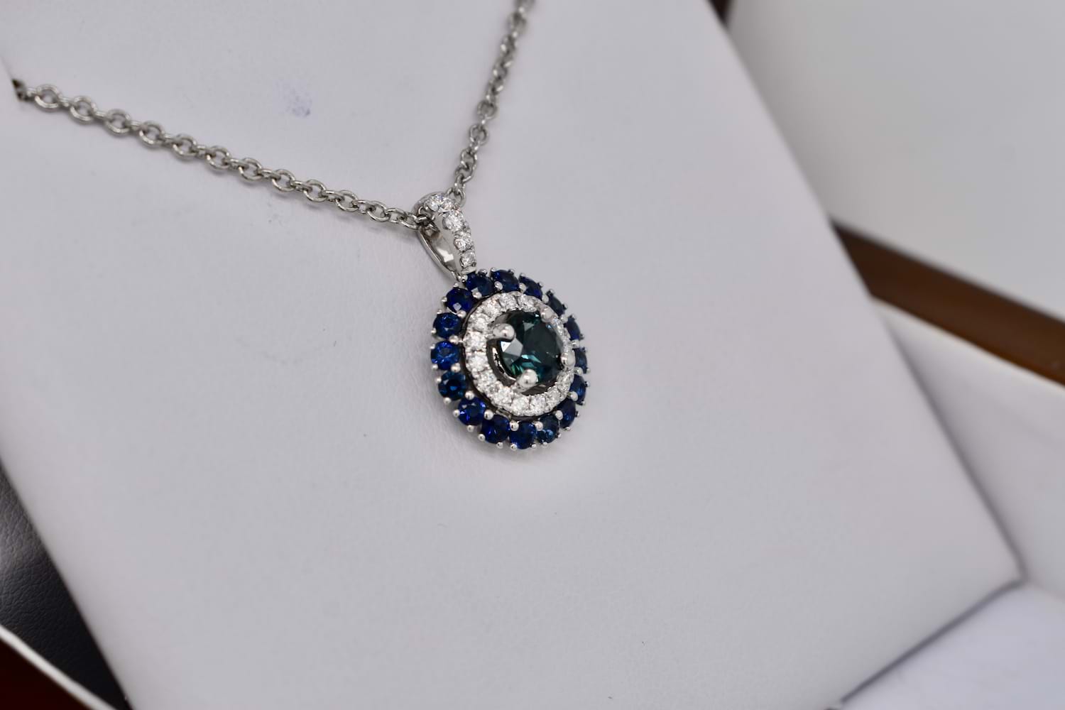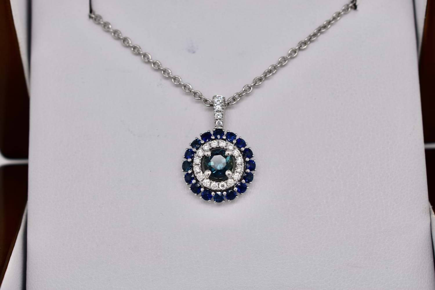 This beautiful pendant is crafted in 18ct white gold, set with a stunning centre, 0.83ct mid-dark blue Australian sapphire (four claw set) with a sparkling halo of diamonds with diamond bail detail. Total of twenty diamonds equalling 0.27ct FGVS/SI. Finished with another outer halo of sixteen Australian sapphires totalling 0.89ct. (1.72ct sapphires in total). Chains available for separate purchase. Independent Valuation Supplied
