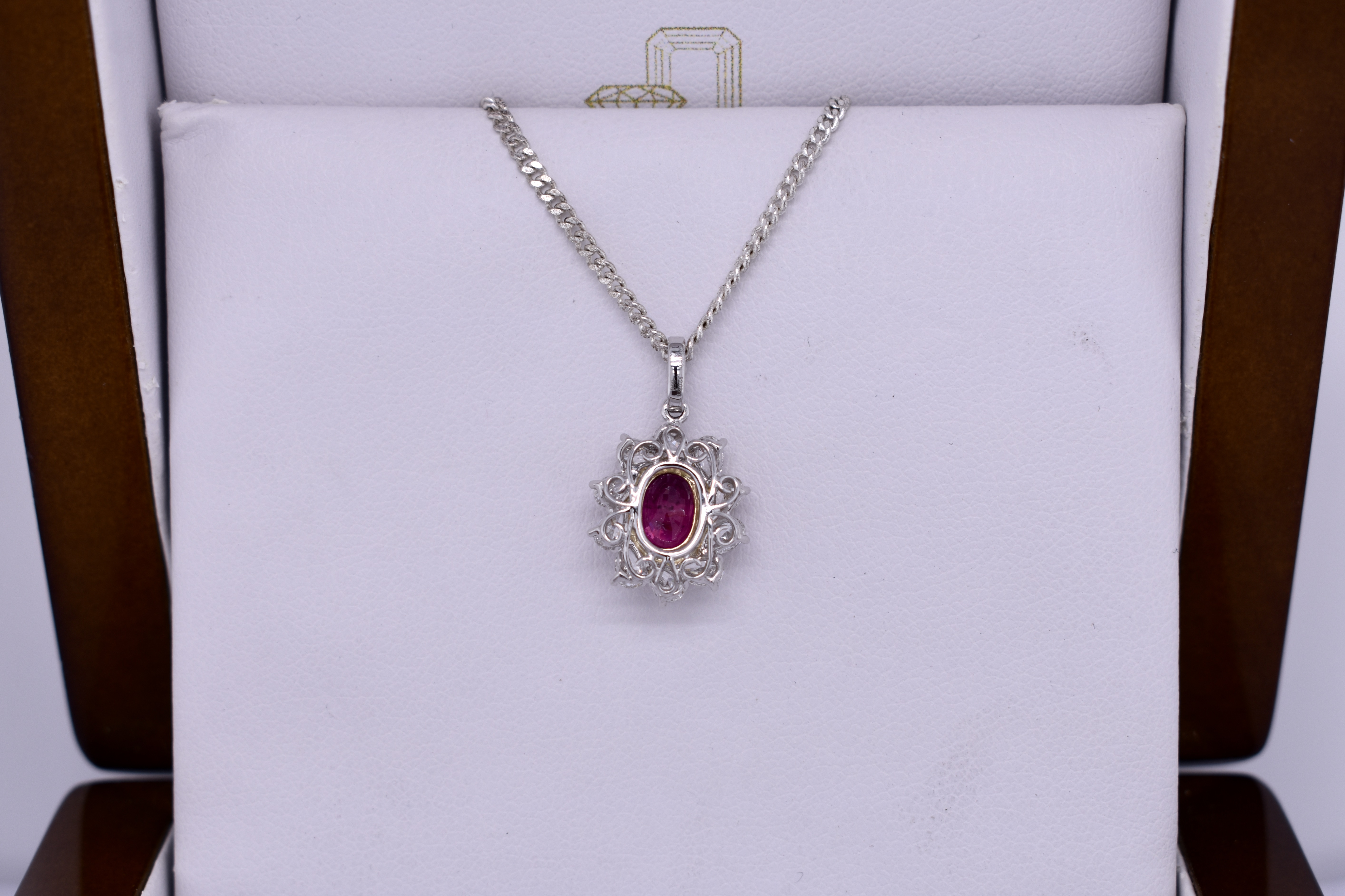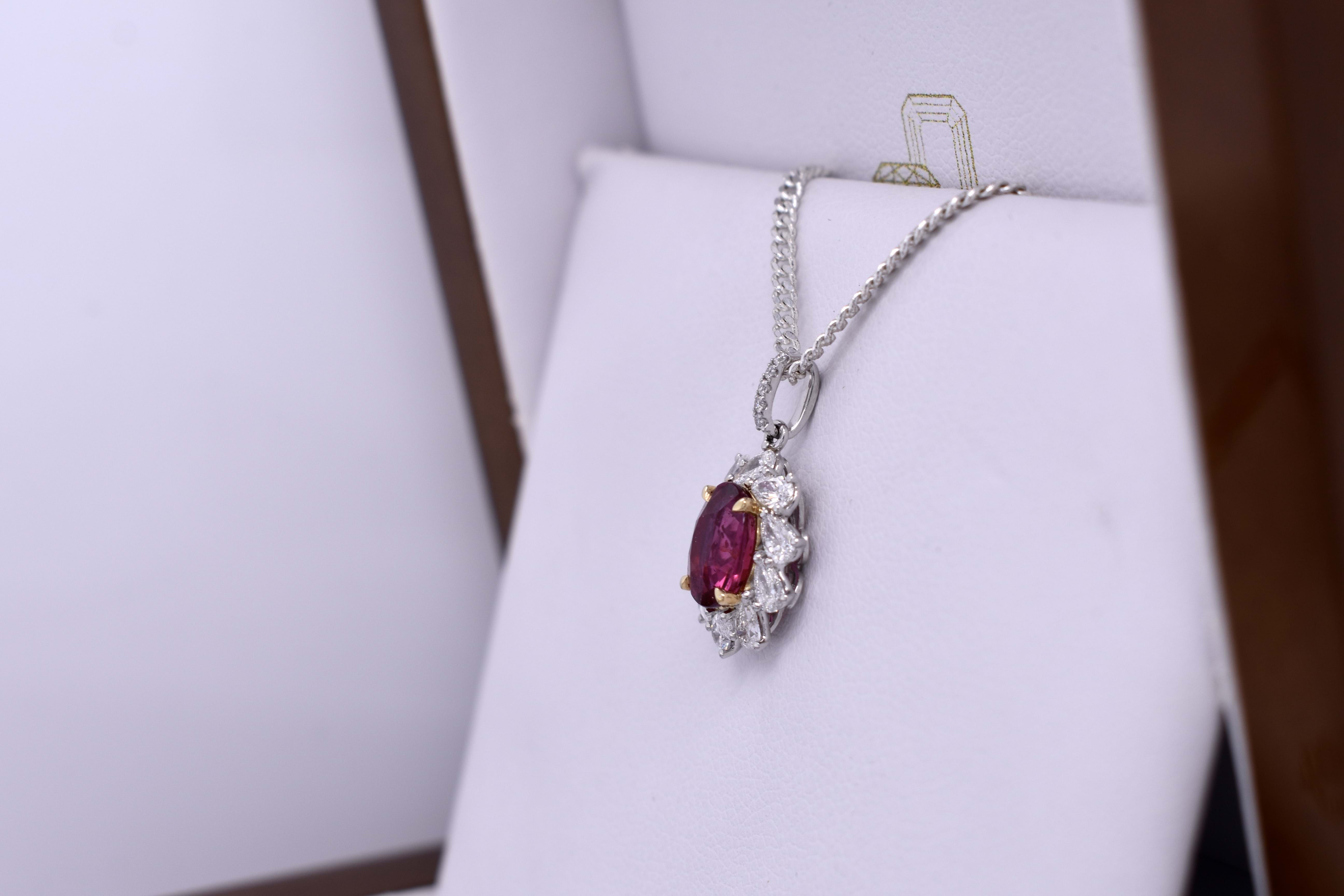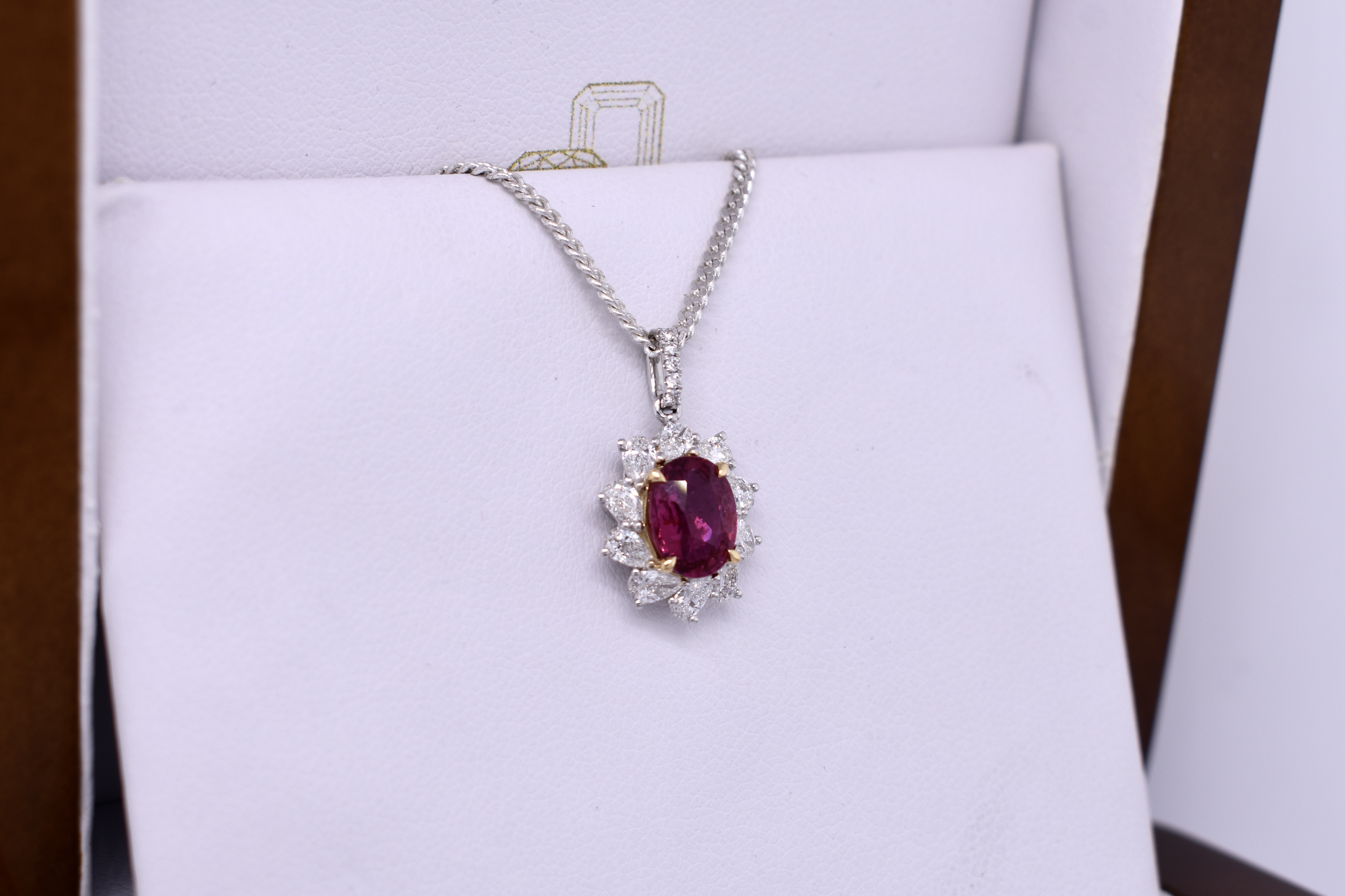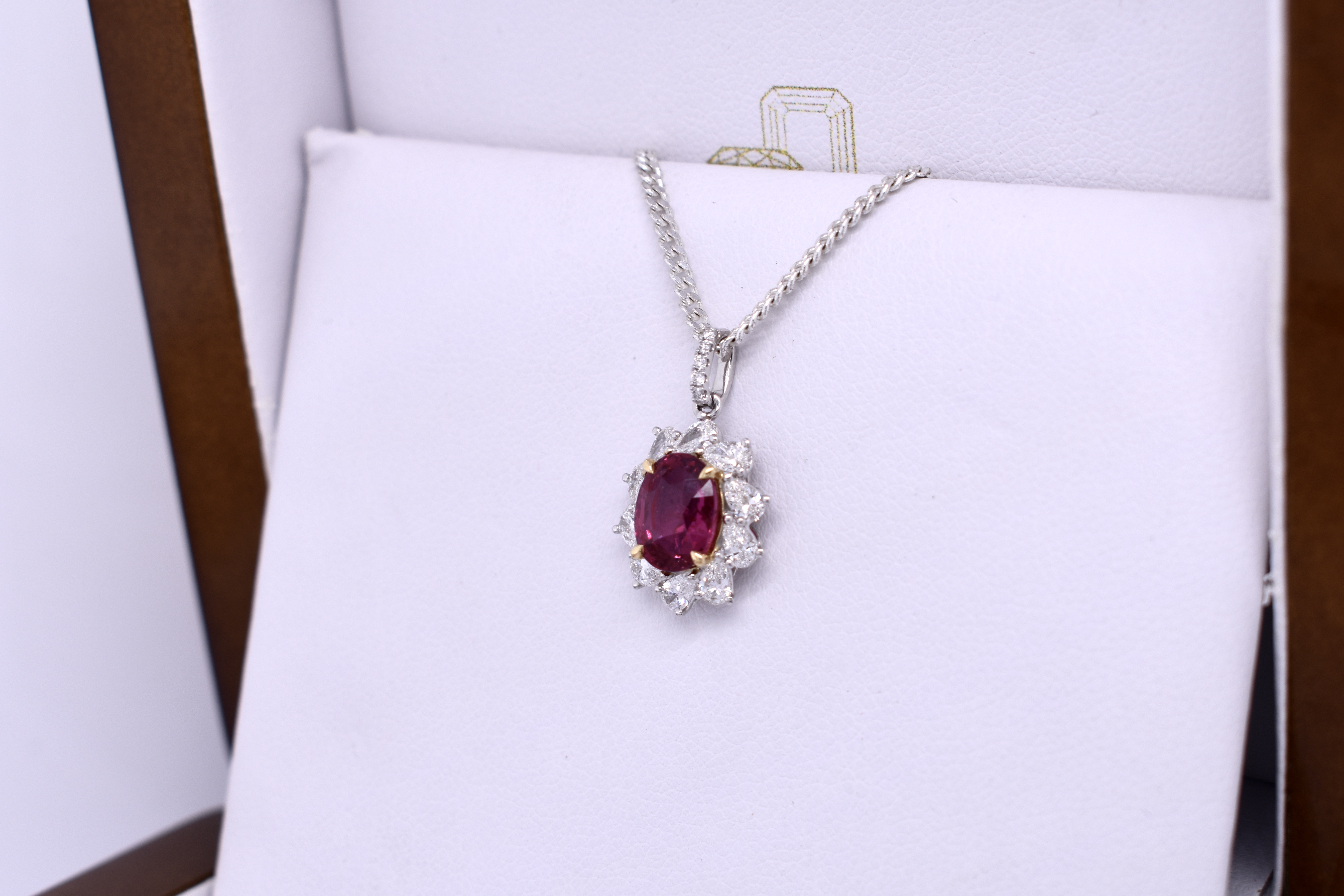 A magnificent bright pinkish red unheated 2.02ct ruby (GGL Report), four claw set in a beautiful cluster halo pendant. This rare oval ruby measures 8.28x6.43x3.84mm and is set with four yellow gold claws. Surrounded by a cluster halo of 10 pear shaped 3.20x2.40mm diamonds, three claw set, equalling 0.71ct G VS-SI, with 5 round brilliant cut 1.10mm diamonds micro claw set in the oval articulated loop bale, 0.03ct G VS-SI. 1.76 grams. Chains available for separate purchase. Independent Valuation Supplied.