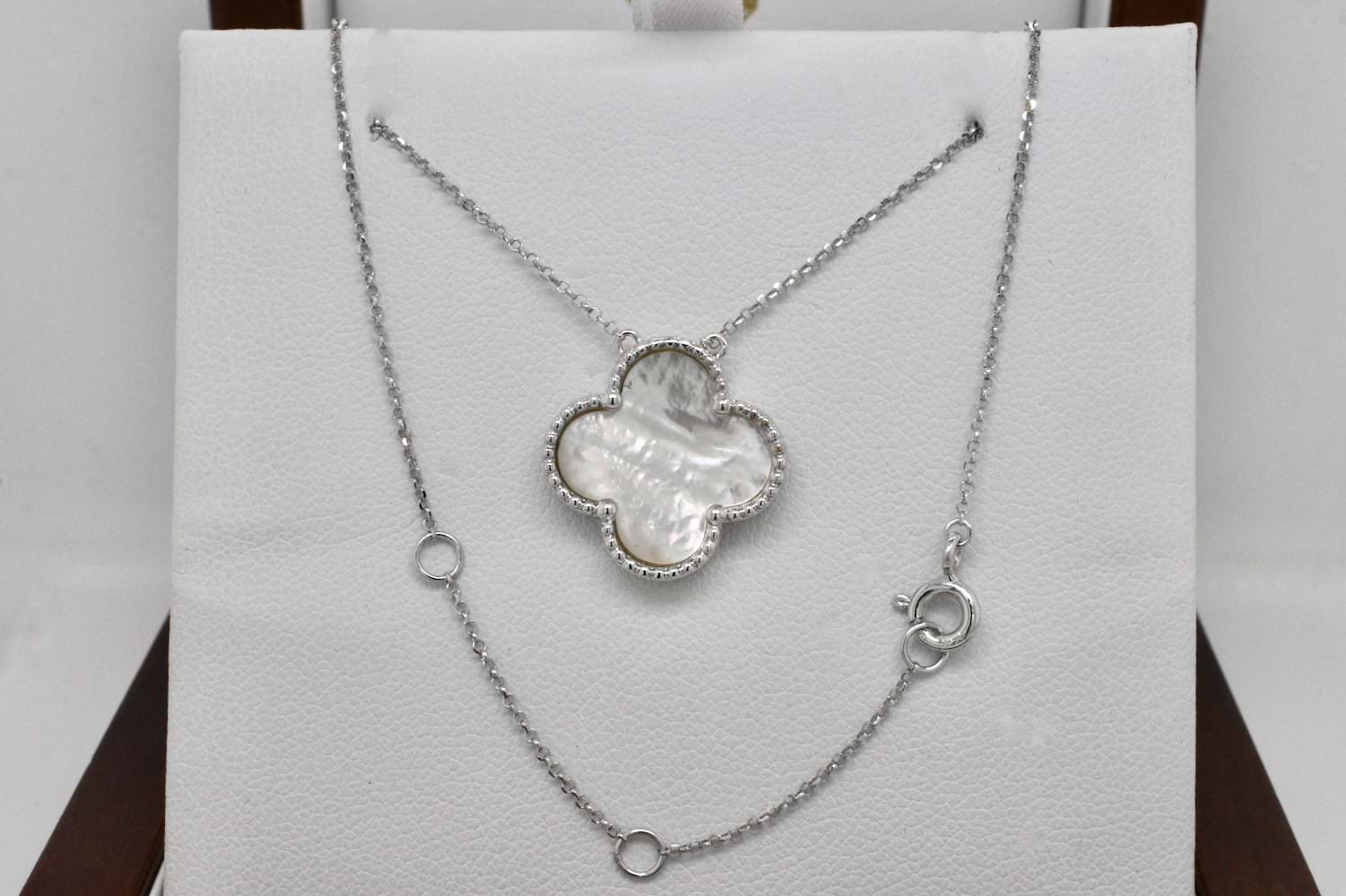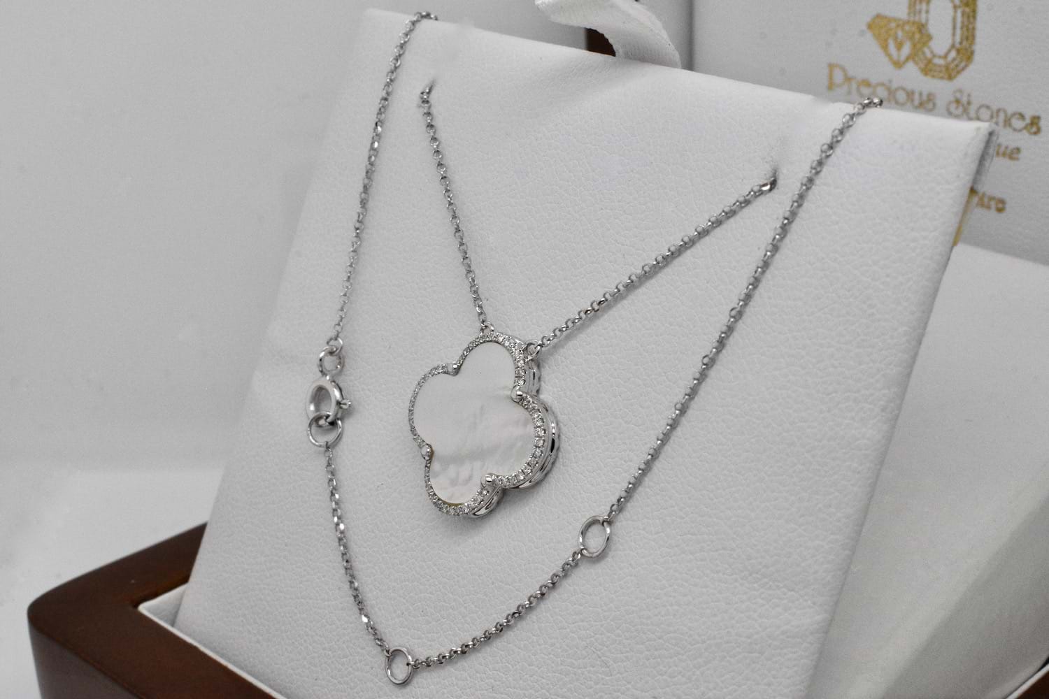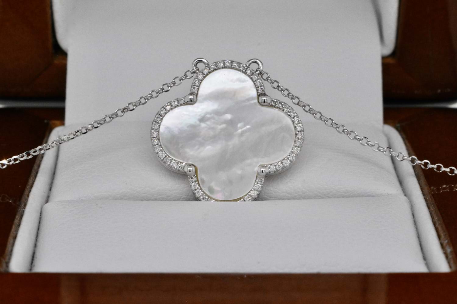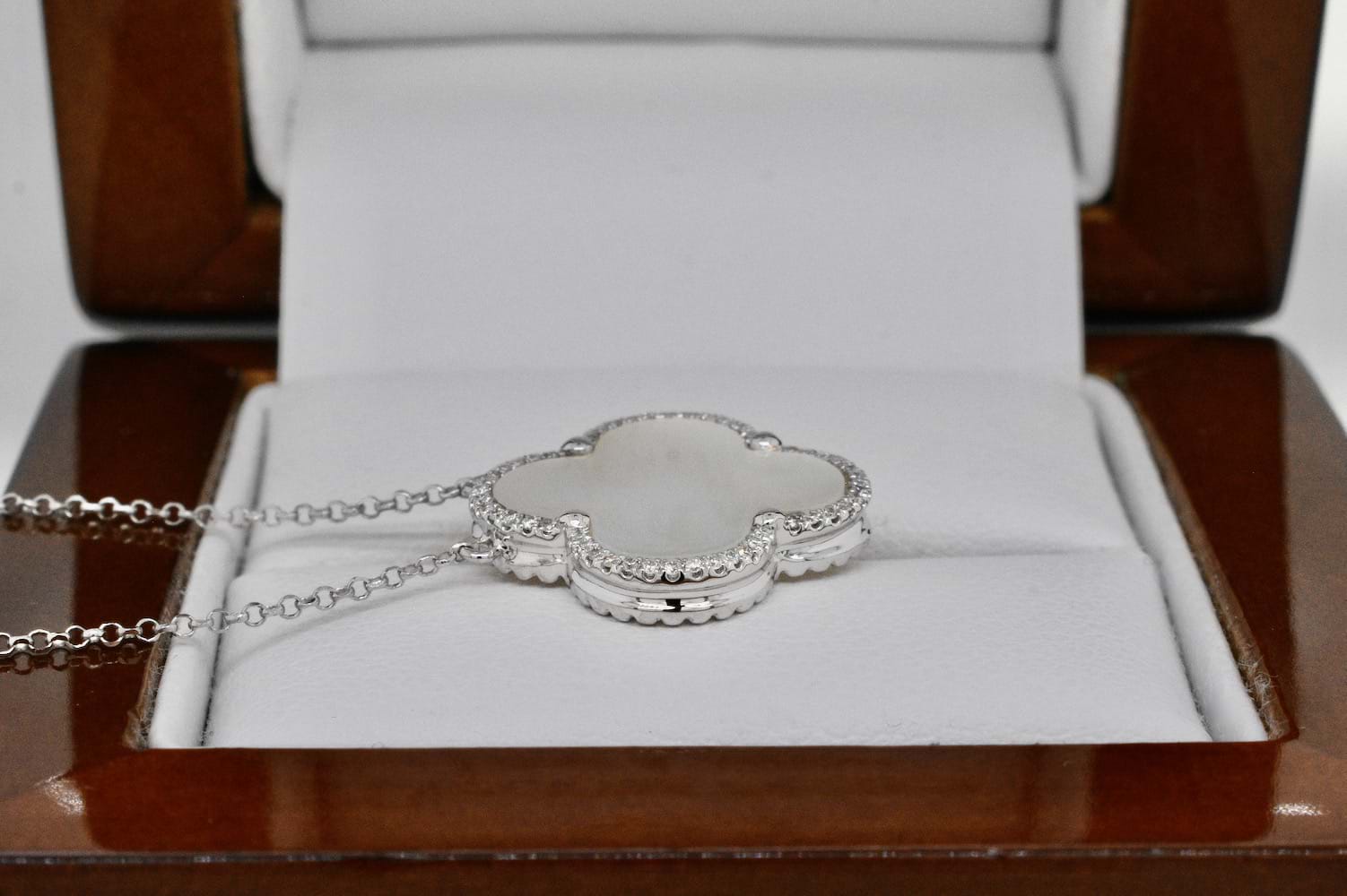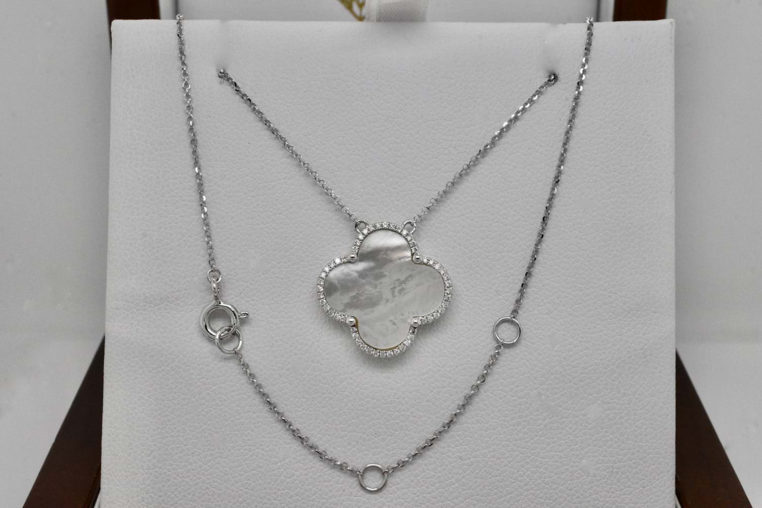 SOLD 18ct White Gold Mother Of Pearl & Diamond Clover Necklace