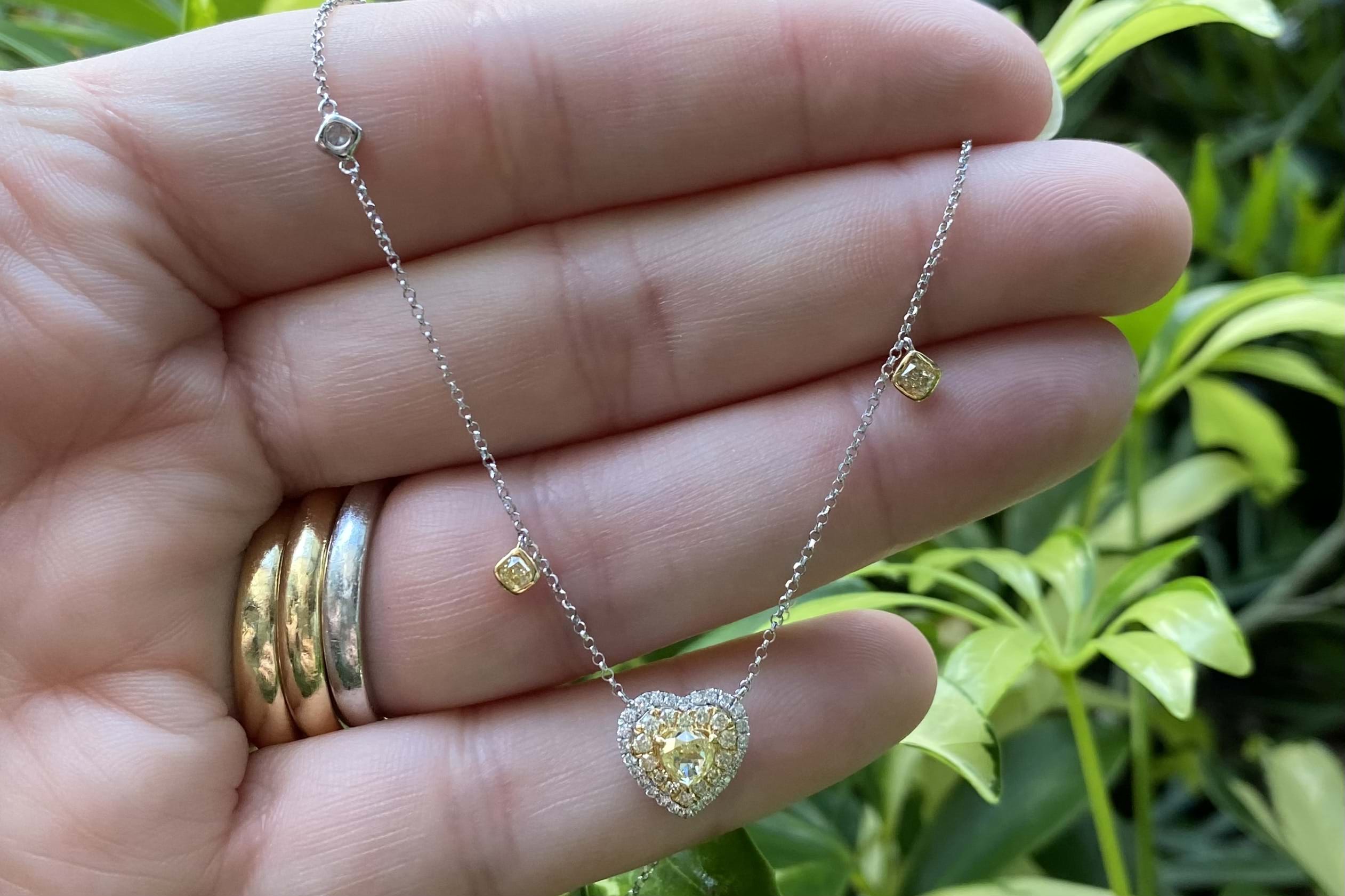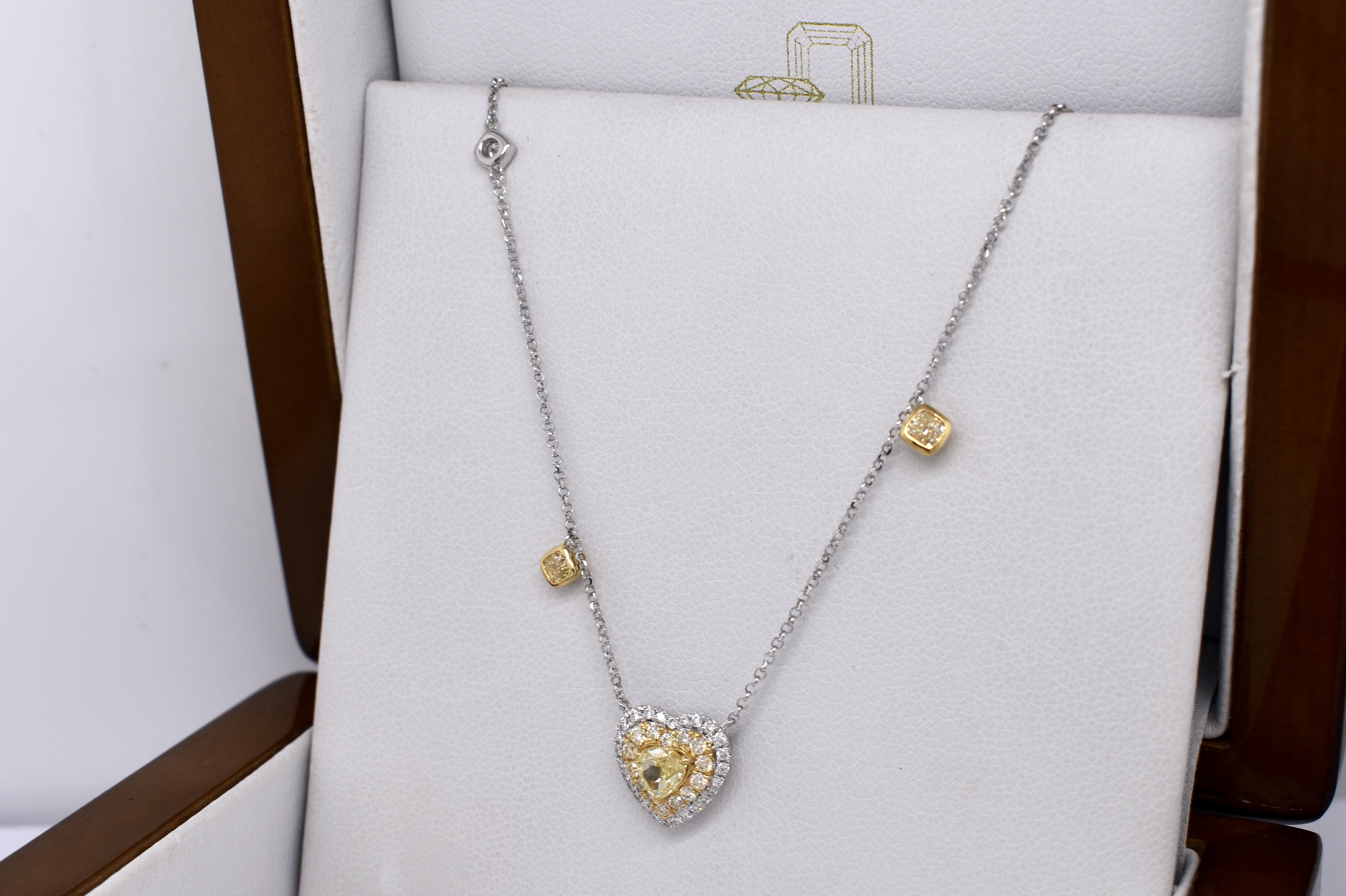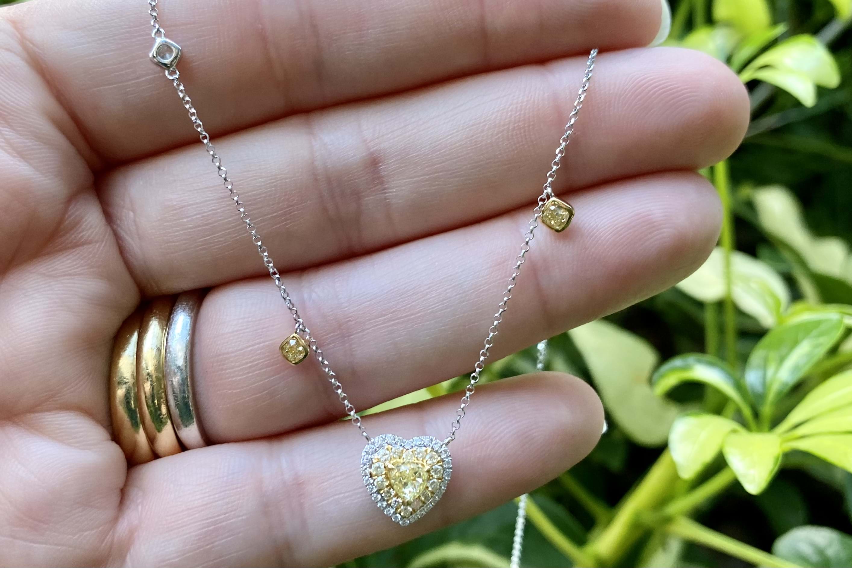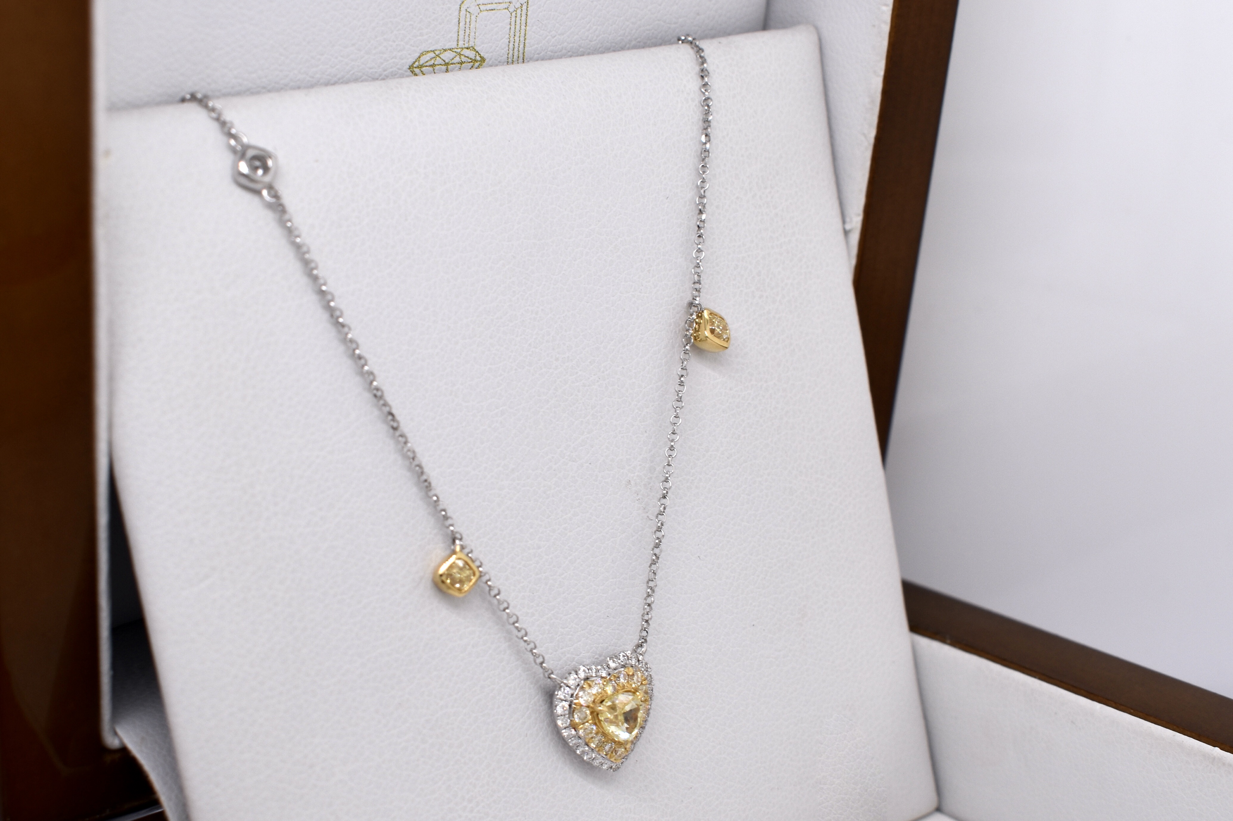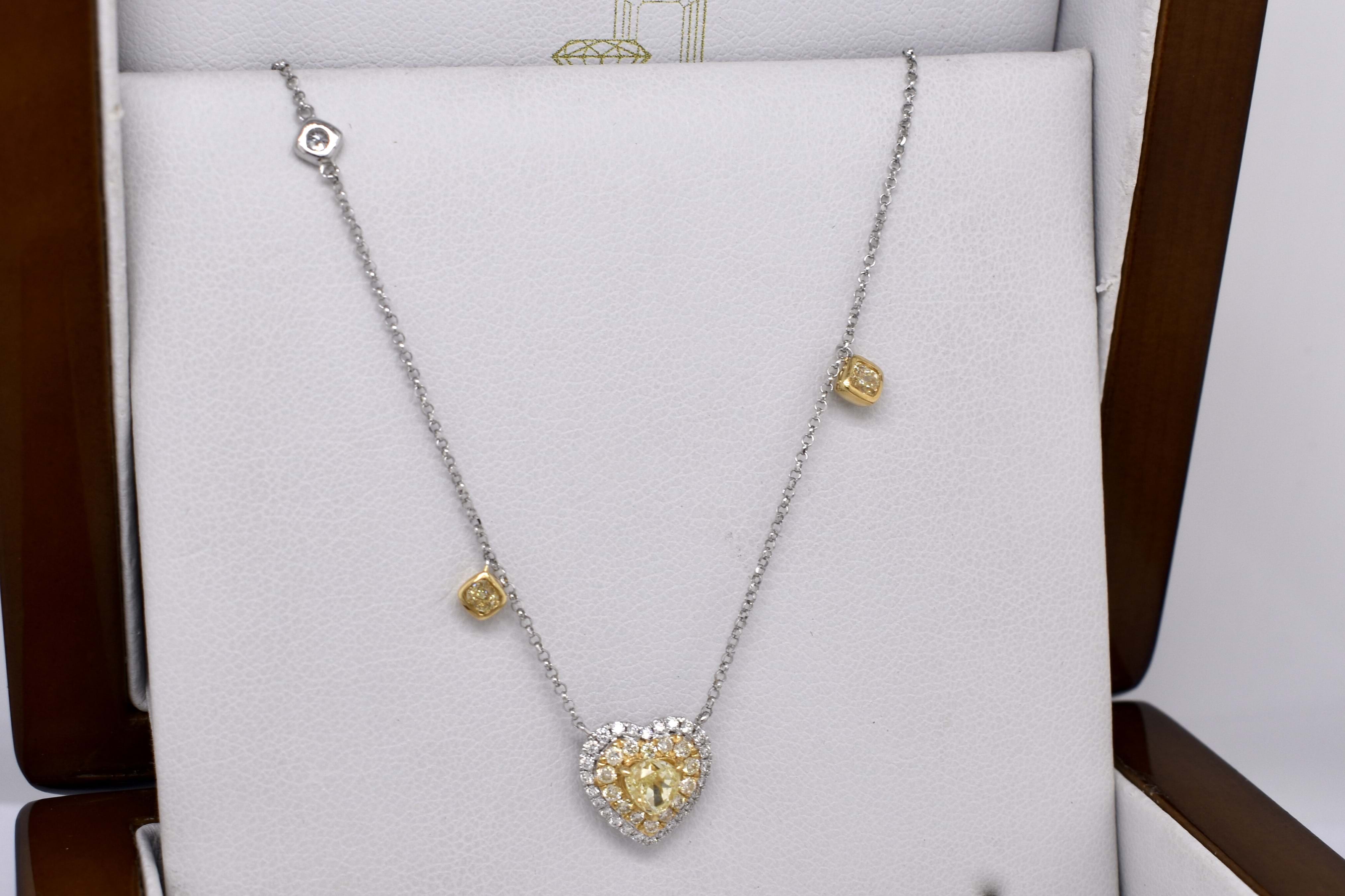 Featuring a beautiful 0.45ct fancy yellow (VS clarity) heart shape diamond yellow gold claw set and surrounded by a halo of faint yellow diamonds (SI) equalling 0.16cts and an outer surround of white diamonds for contrast. The heart motif is suspended from 18ct yellow gold chain with two radiant cut fancy yellow diamonds (VS) equalling 0.22ct bezel set in yellow gold at random intervals and a single white round brilliant cut diamond white gold bezel set. The necklace is 43cm with adjustable loops to shorten, white diamond content equals 0.16ct FGVS-SI. Independent Valuation Supplied