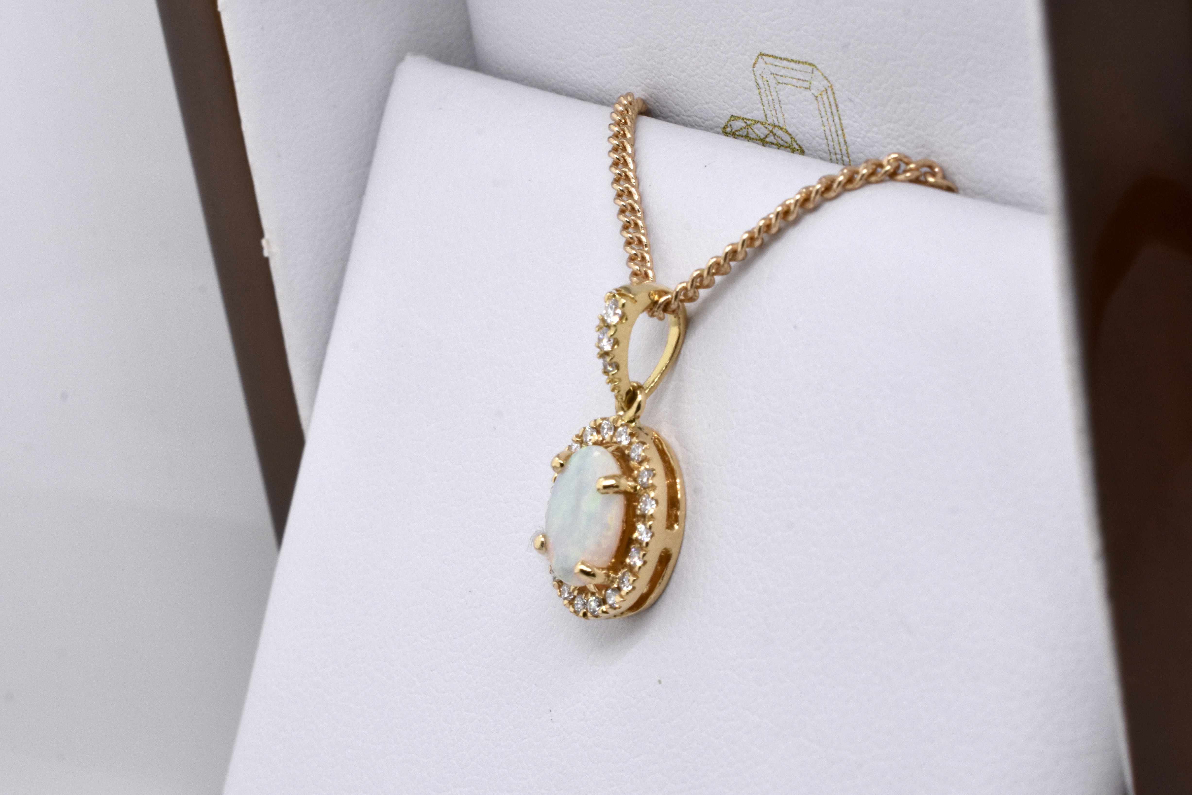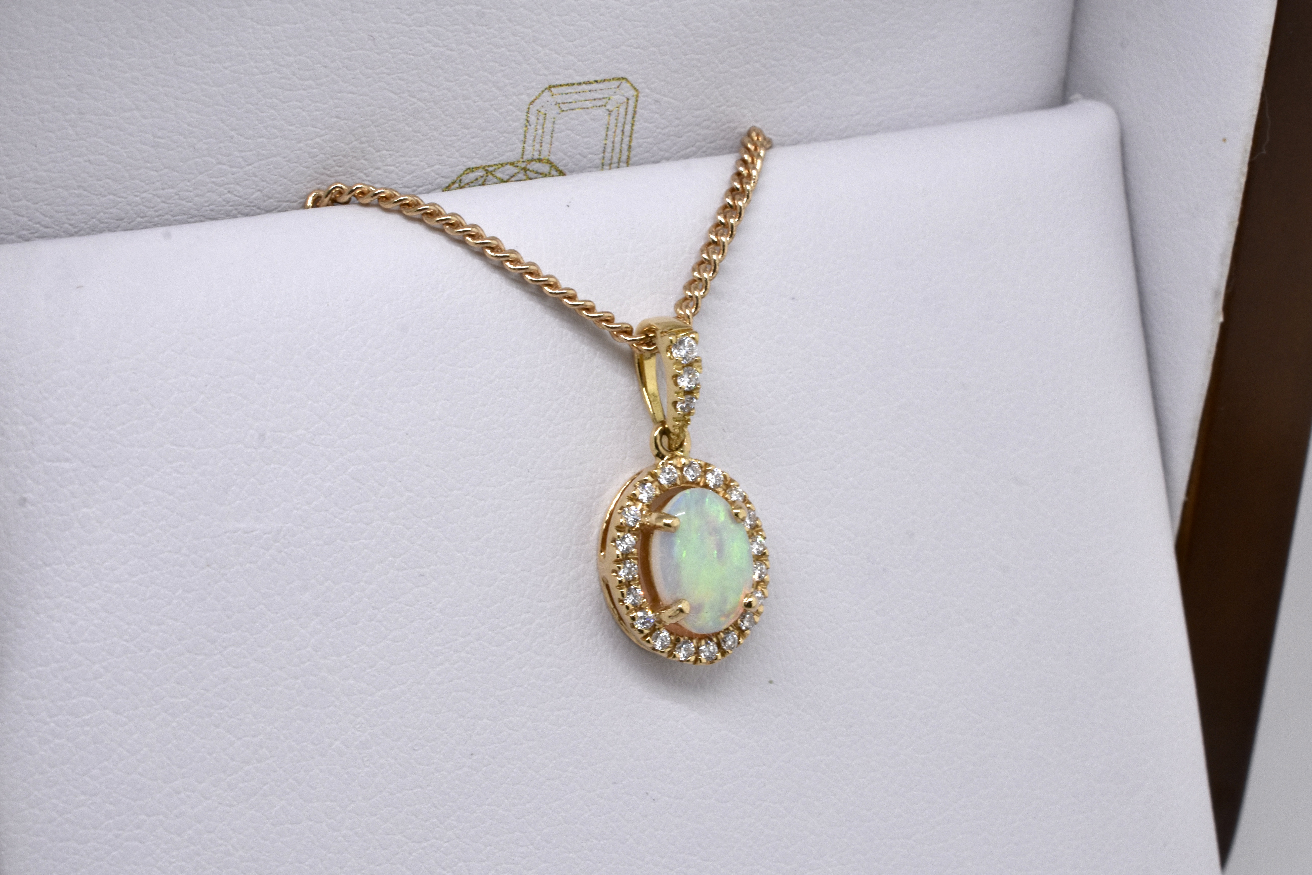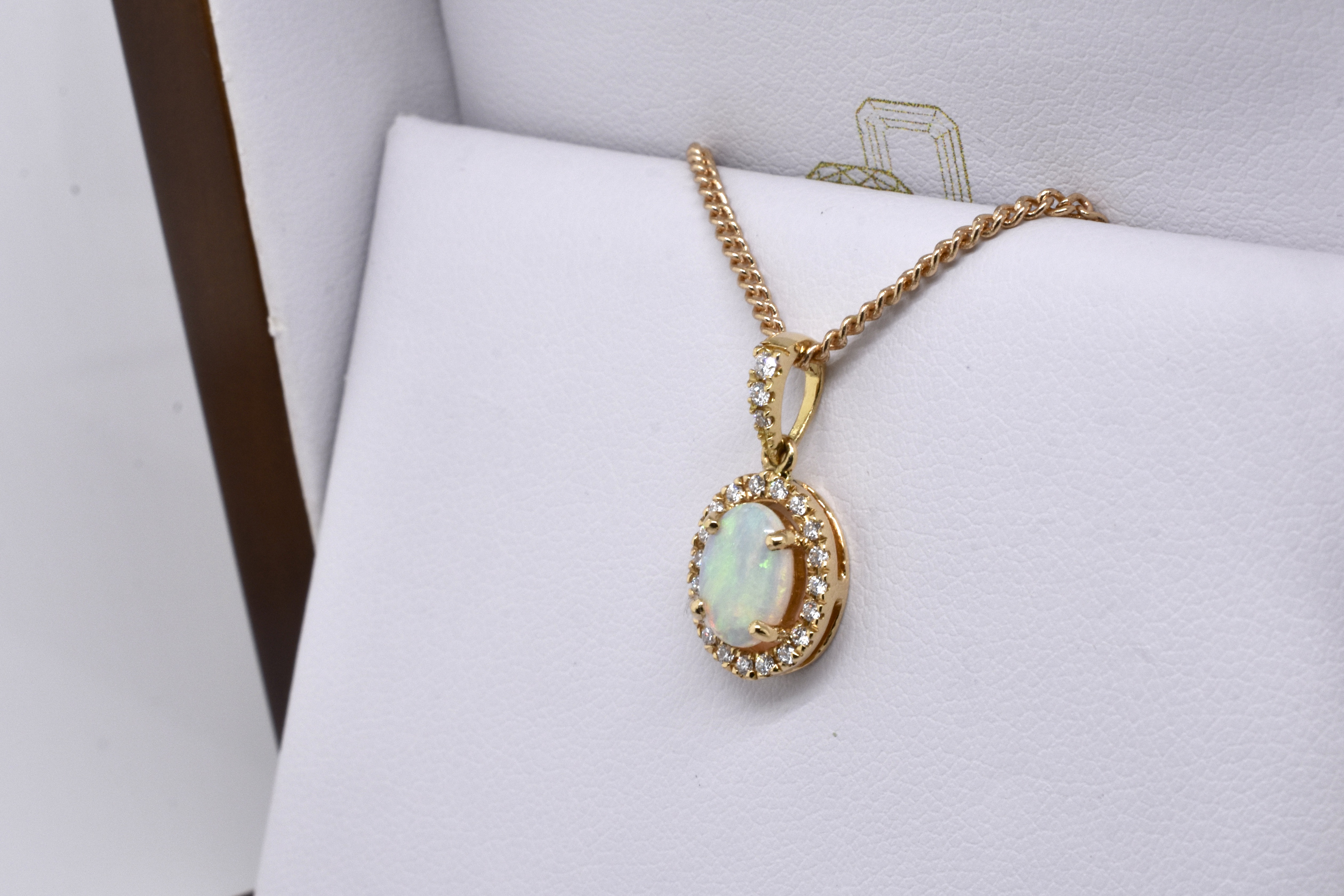 This classic pendant is made in 18ct yellow gold, set with a centre oval 0.57ct Coober Pedy white crystal opal with flashes of orange and green, four claw set and with a halo of scintillating white diamonds and elegant diamond bail detail for a total of twenty two equalling 0.13ct GH/SI. Chains available for separate purchase