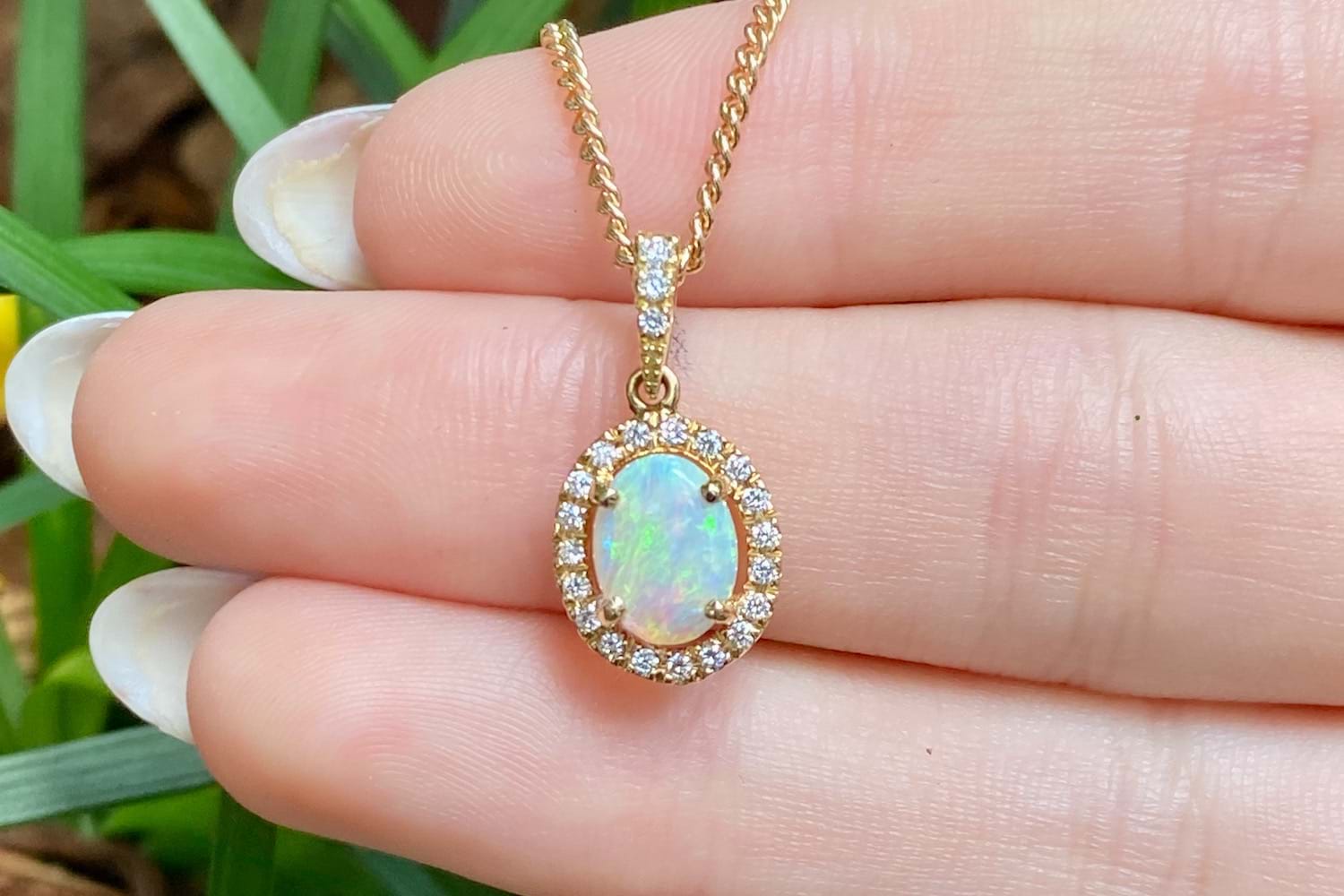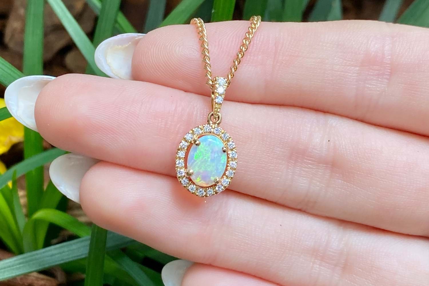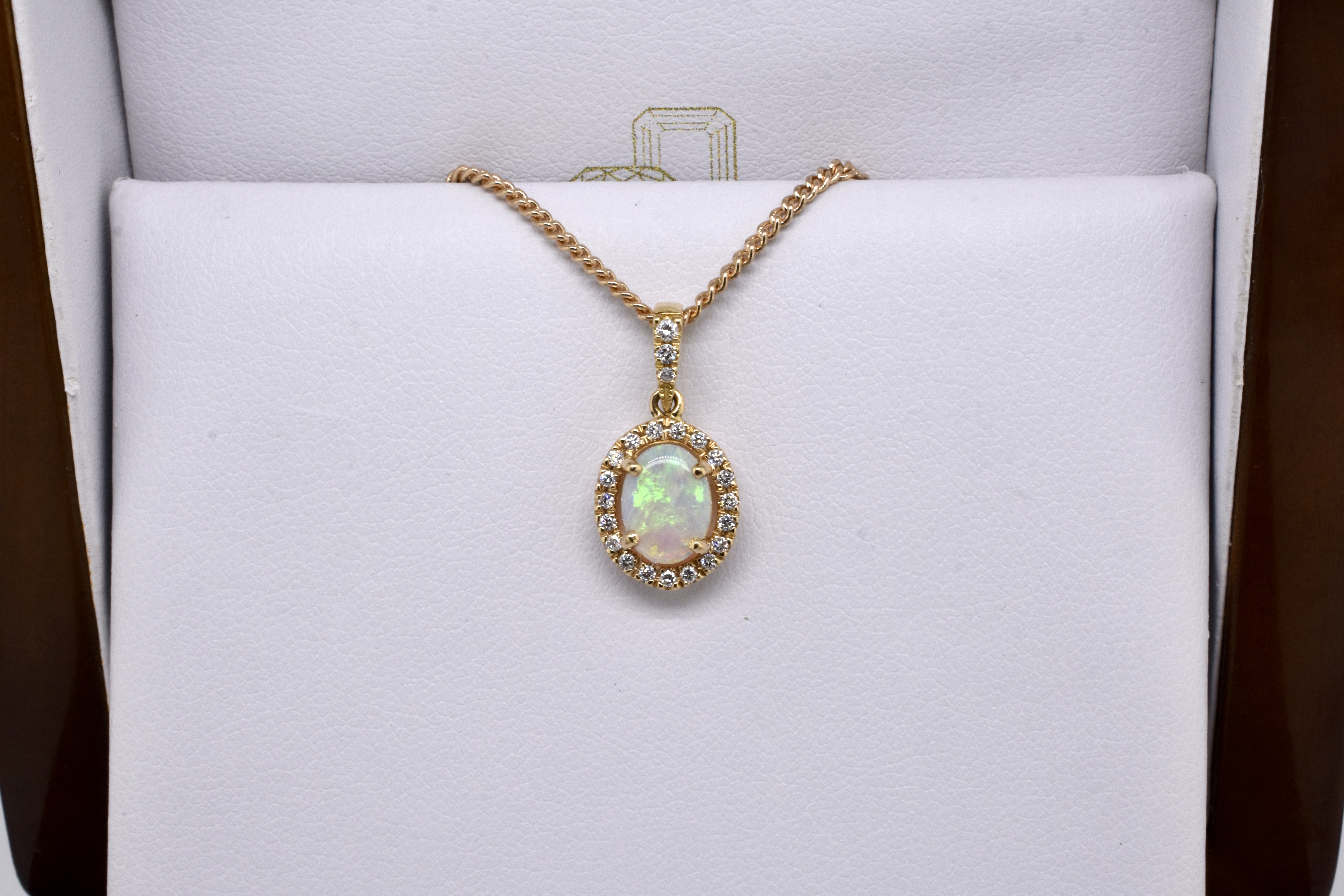 This classic pendant is made in 18ct yellow gold, set with a centre oval 0.57ct Coober Pedy white crystal opal with flashes of orange and green, four claw set and with a halo of scintillating white diamonds and elegant diamond bail detail for a total of twenty two equalling 0.13ct GH/SI. Chains available for separate purchase