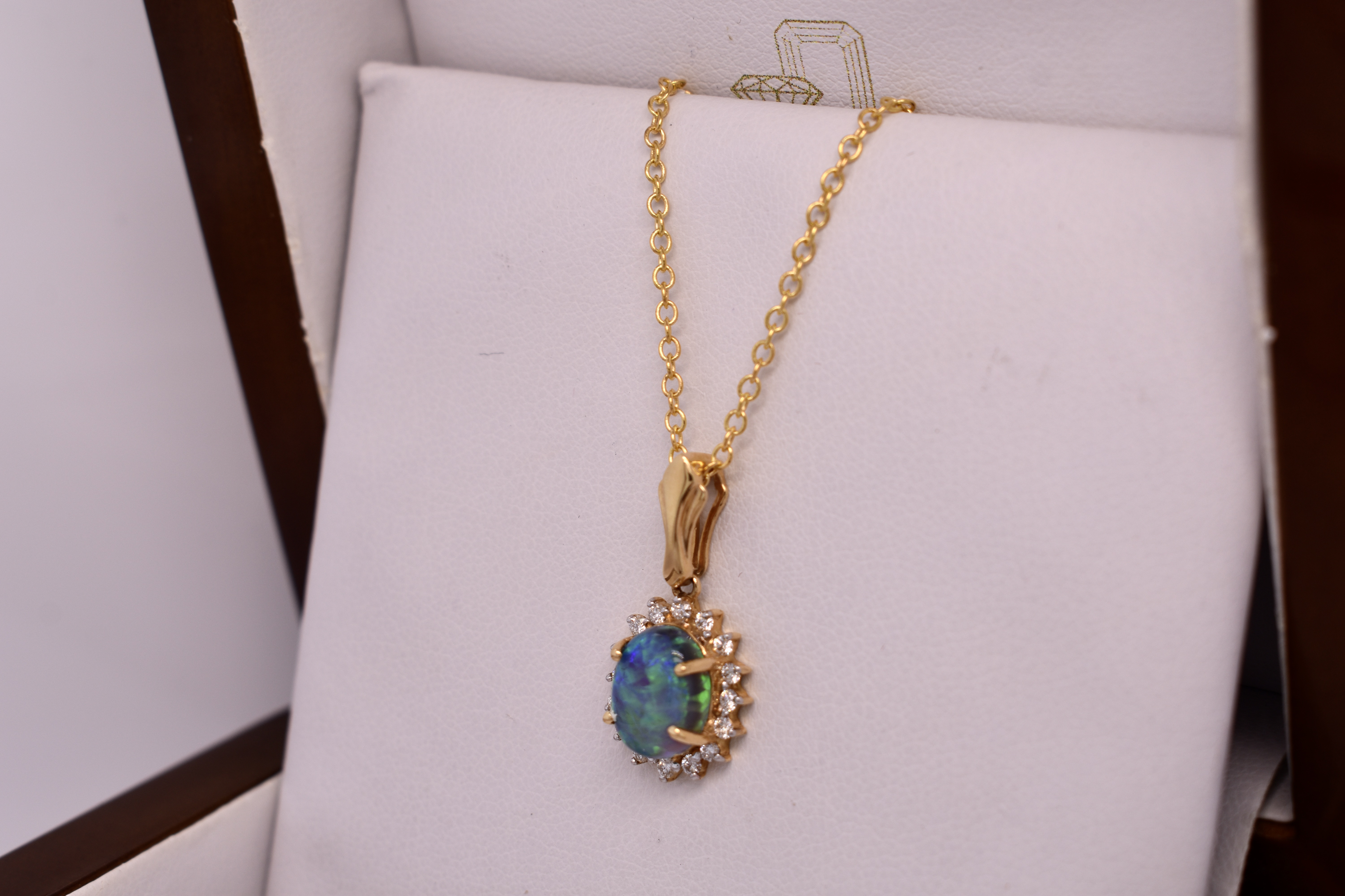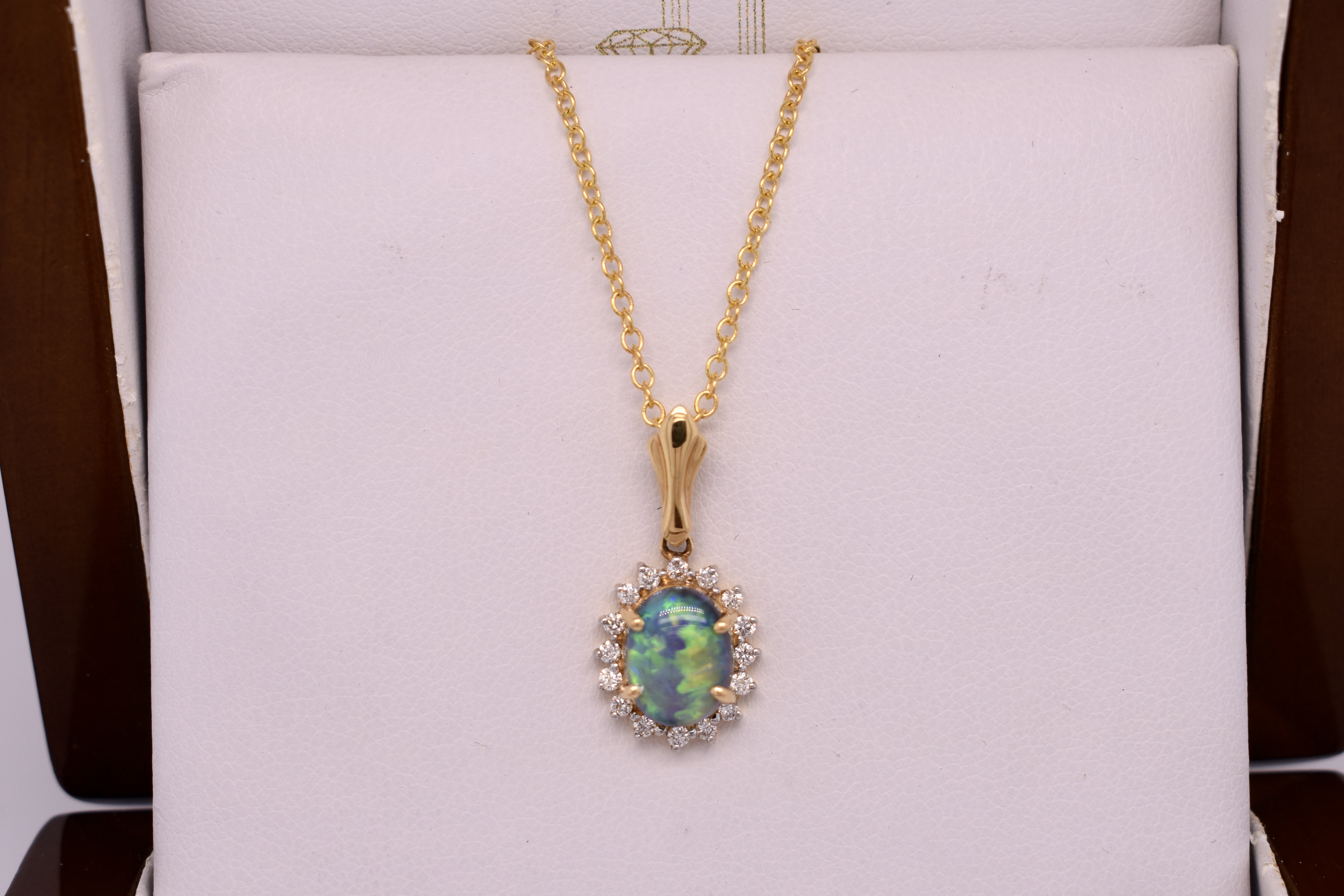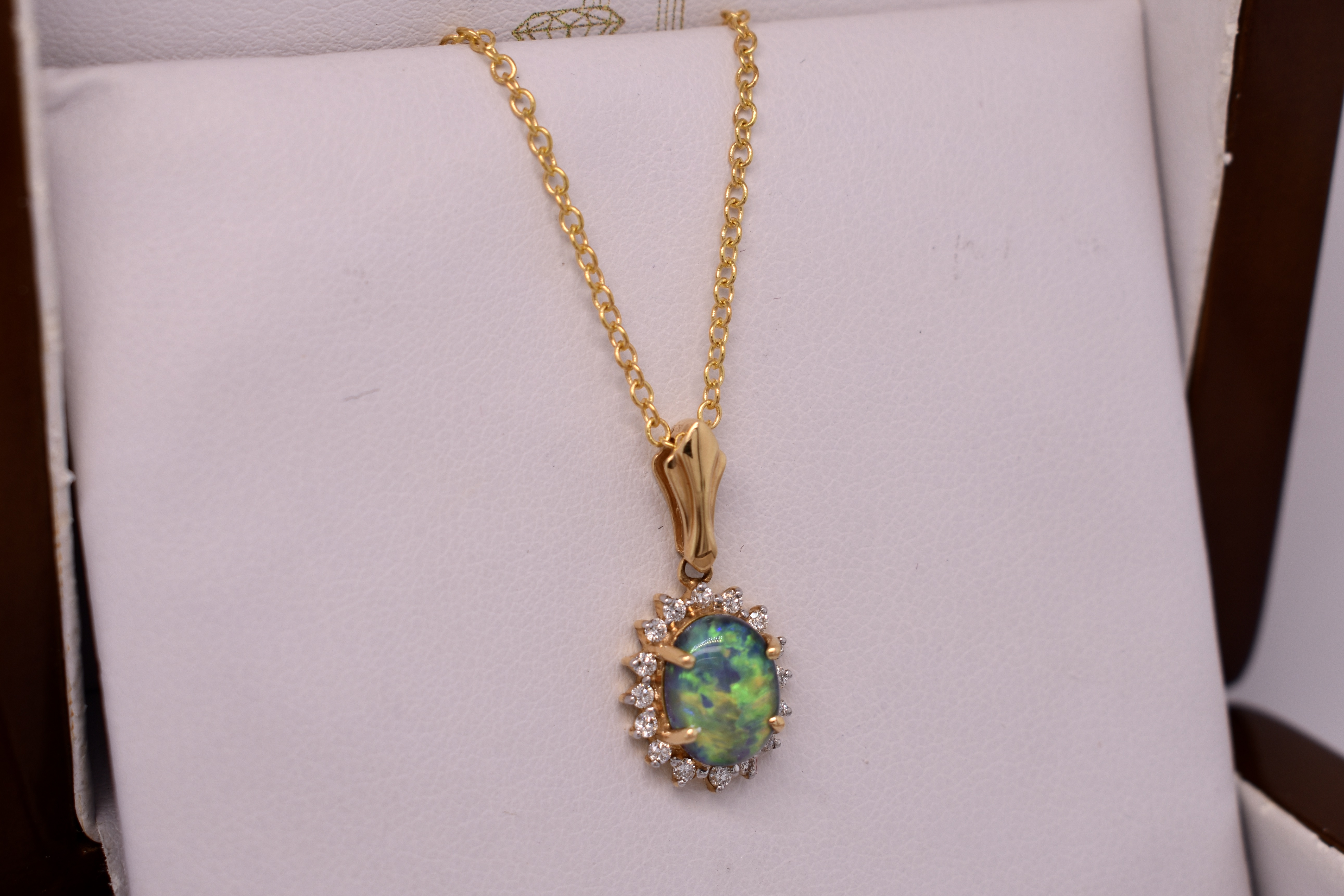 This beautiful pendant is made in 18ct yellow gold, with an oval cabochon Lightning Ridge crystal opal in the centre. The four claw set opal measures 9.68x7.56x4.05mm and has rolling orange, blue and green flashes. Surrounded by 16 round brilliant cut diamonds, shared claw set, with a tapering grooved articulated bale. The diamonds measure 1.50mm round and weigh a total of 0.24ct G SI. Chains available for separate purchase. Independent Valuation Supplied.