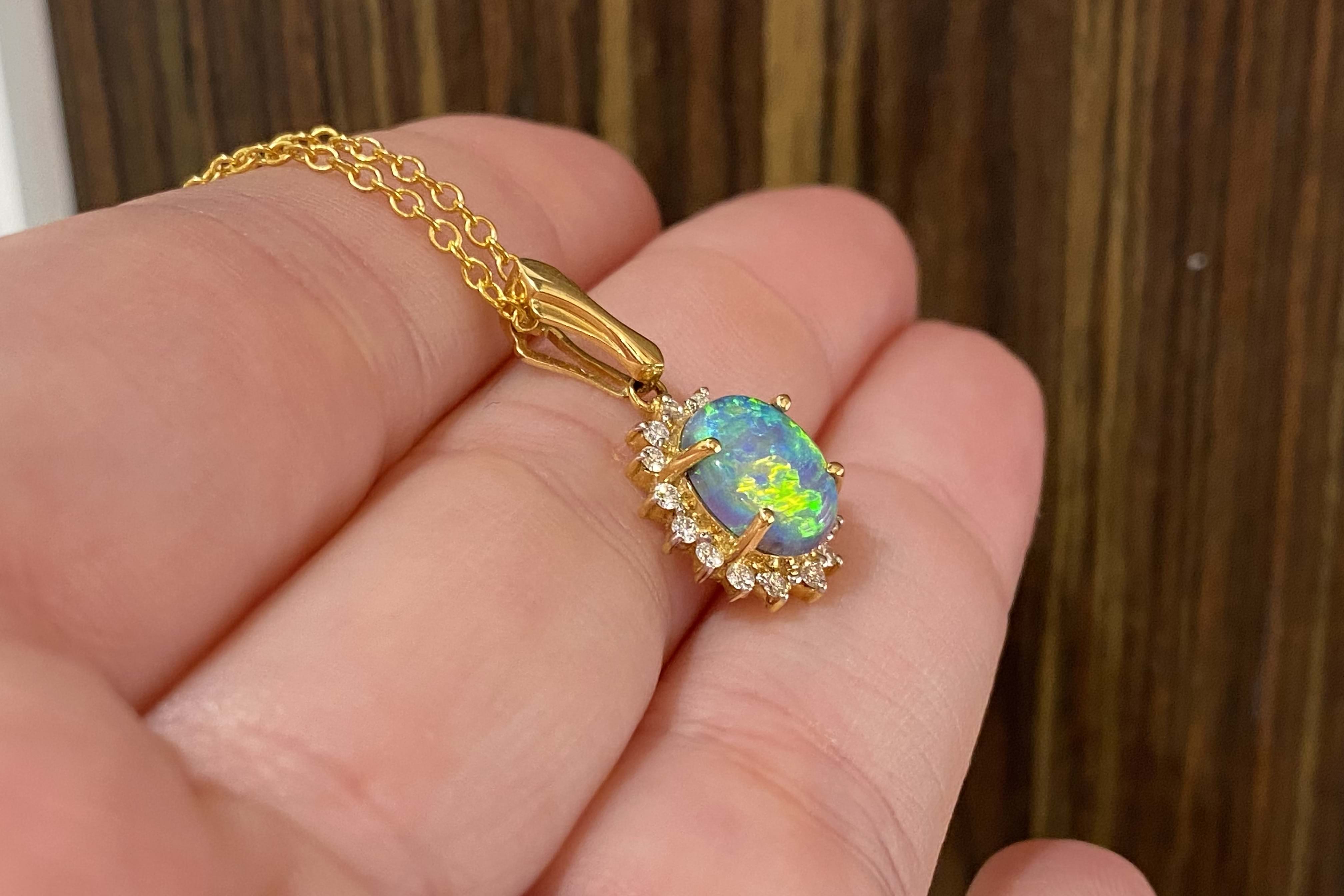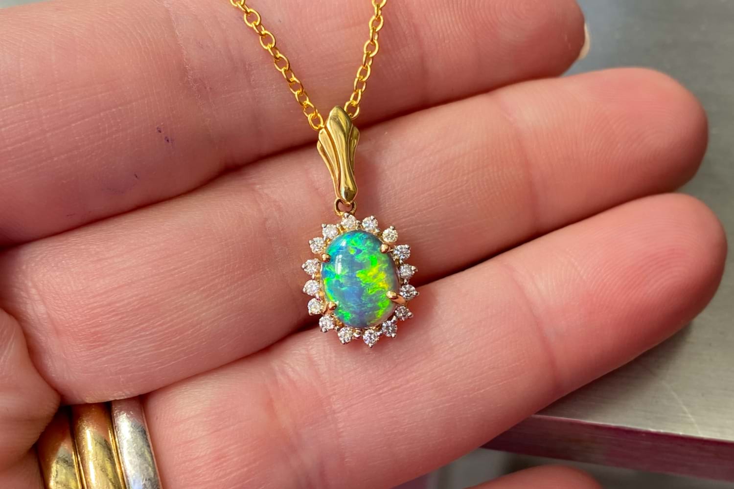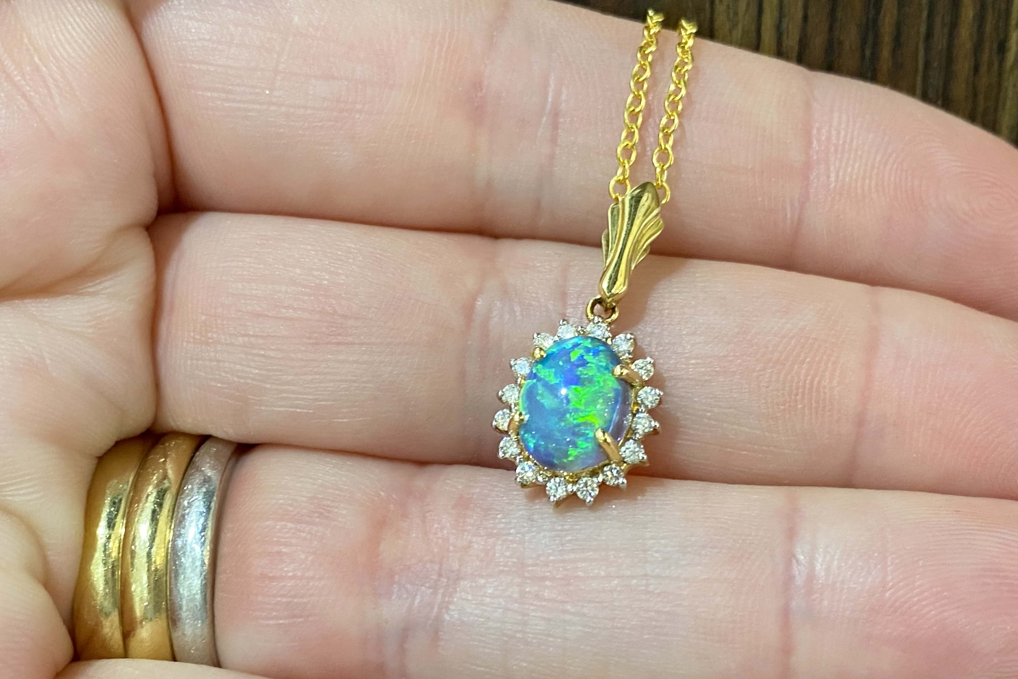This beautiful pendant is made in 18ct yellow gold, with an oval cabochon Lightning Ridge crystal opal in the centre. The four claw set opal measures 9.68x7.56x4.05mm and has rolling orange, blue and green flashes. Surrounded by 16 round brilliant cut diamonds, shared claw set, with a tapering grooved articulated bale. The diamonds measure 1.50mm round and weigh a total of 0.24ct G SI. Chains available for separate purchase. Independent Valuation Supplied.