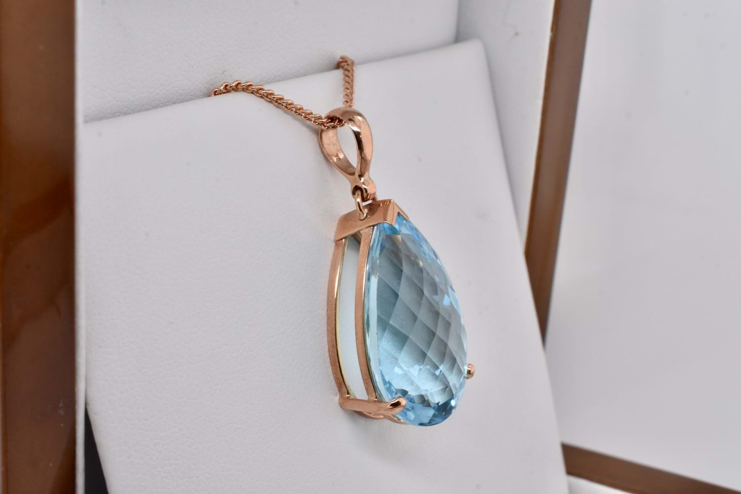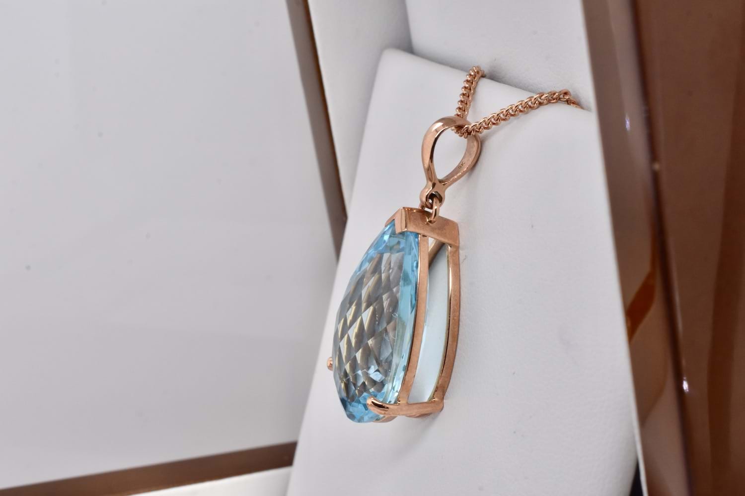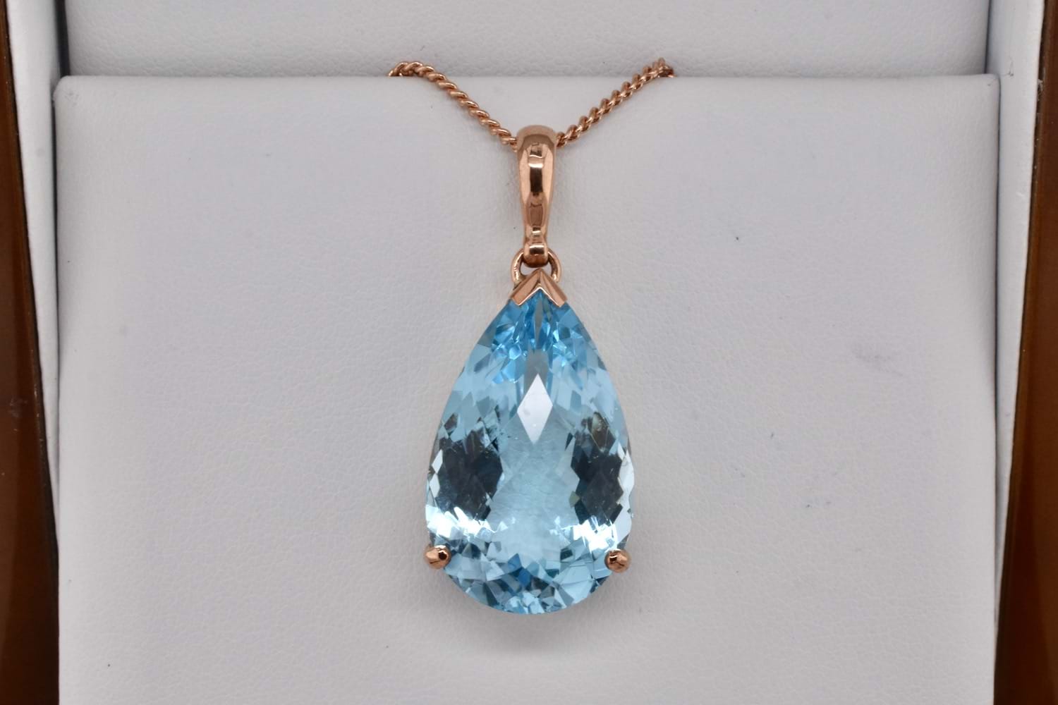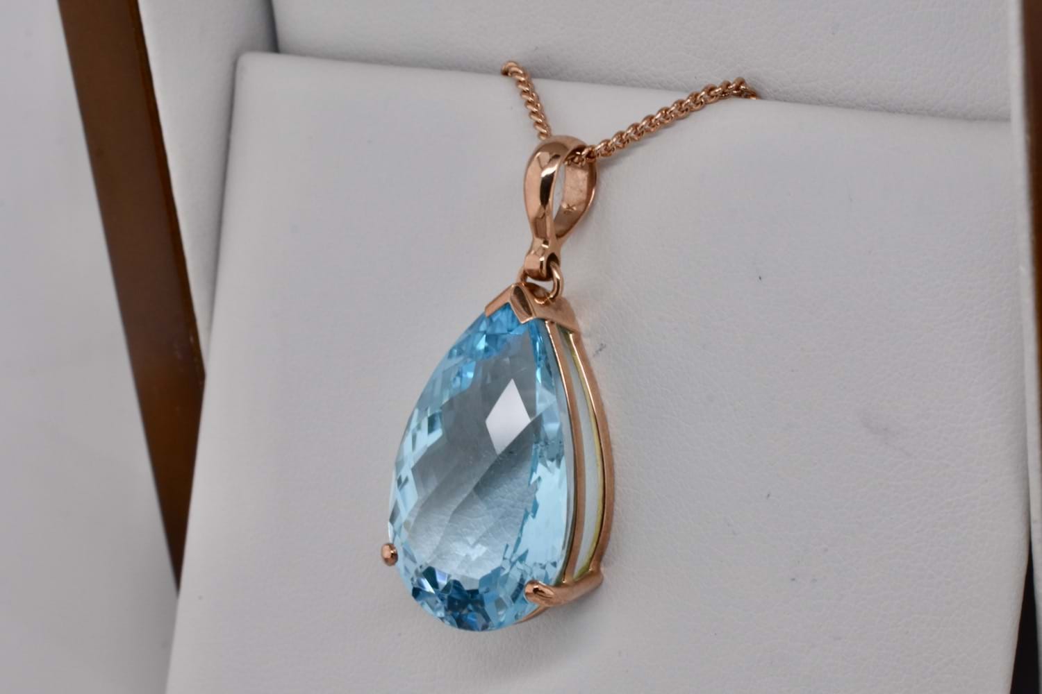 Stunning and large faceted teardrop blue topaz measuring 26x16.5mm and set into a handmade 9ct rose gold claw setting with a plain pendant bale perfect for every occasion.