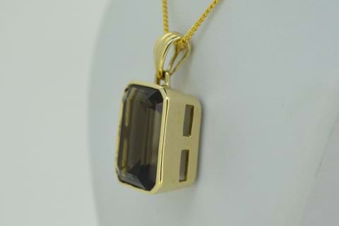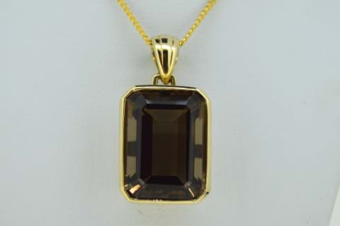 Set in 9ct yellow gold is this emerald cut smokey quartz. Chain not included