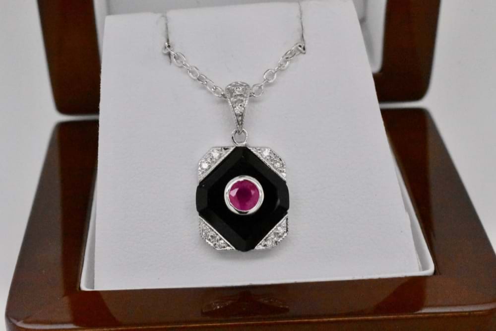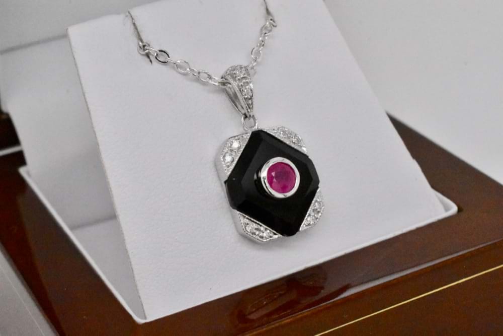 SOLD 9ct White Gold Onyx, Ruby & Diamond Pendant