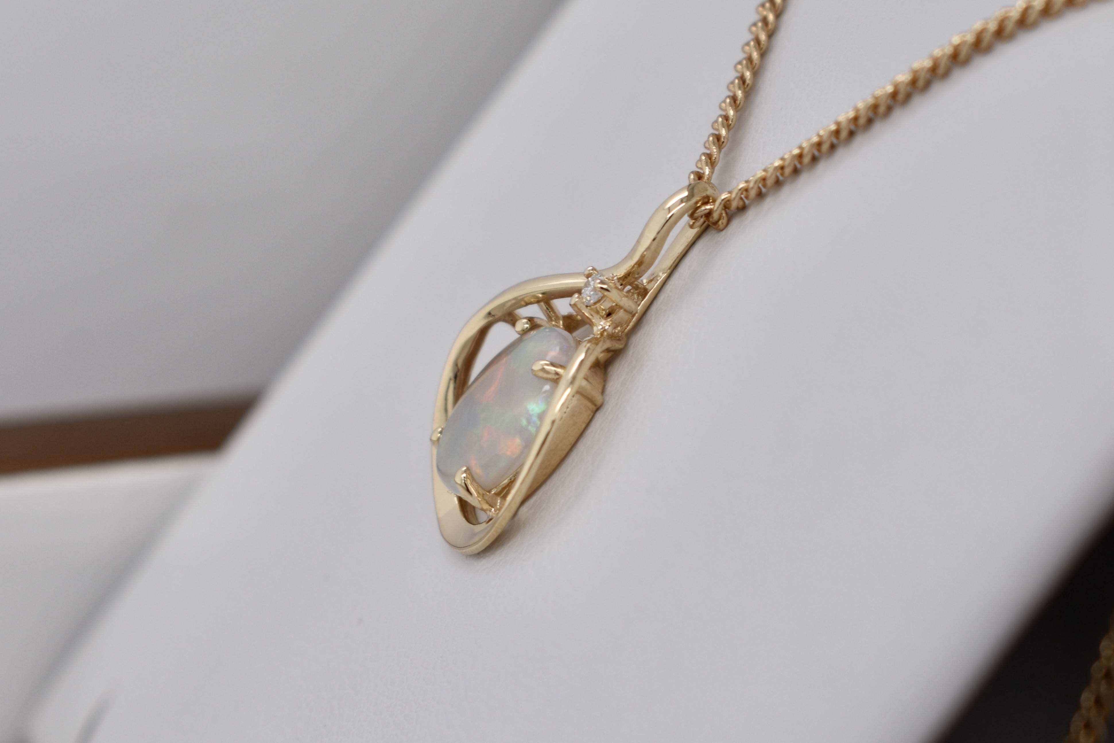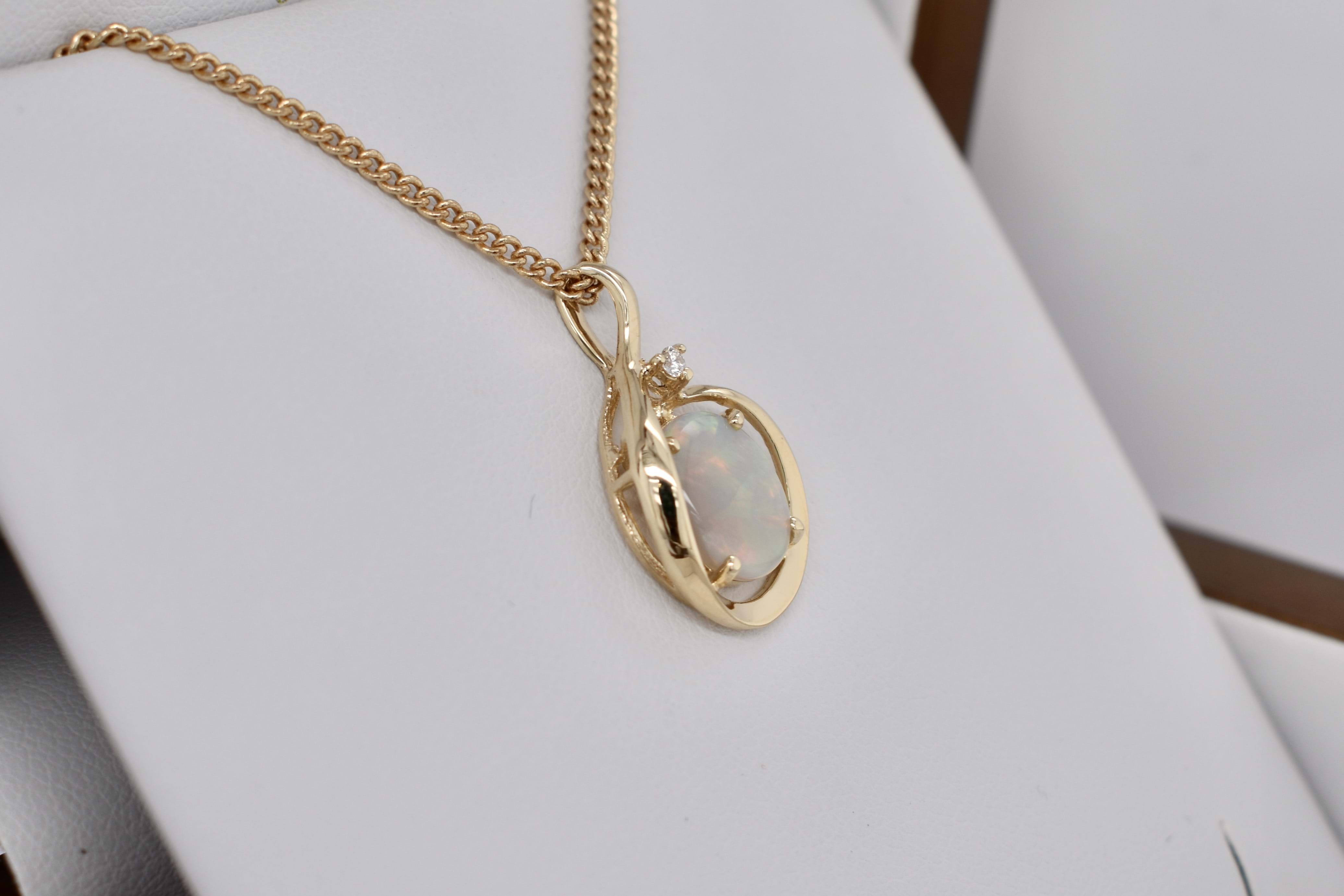 The most stunning cabochon oval shaped Coober Pedy opal pendant, with flashes of orange and green throughout, measures 10.18x8.10x2.20mm and totals 1.10ct. It is four claw set into a beautiful 9ct yellow gold gapped ribbon style setting, containing one 1.8mm round brilliant cut 0.025ct H SI diamond at the top, finished with a plain gold bale. Chains are available for separate purchase. Independent Valuation Supplied.