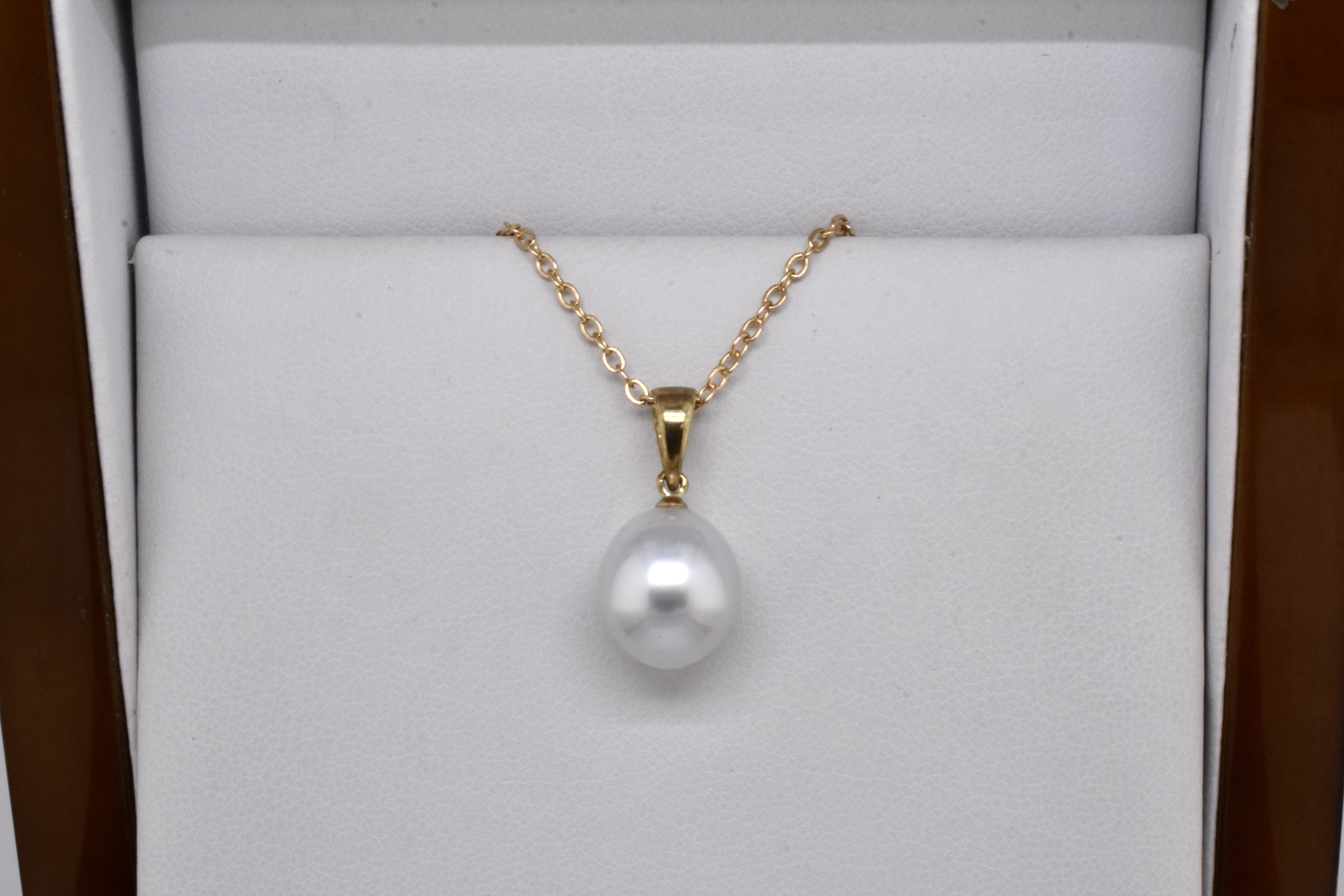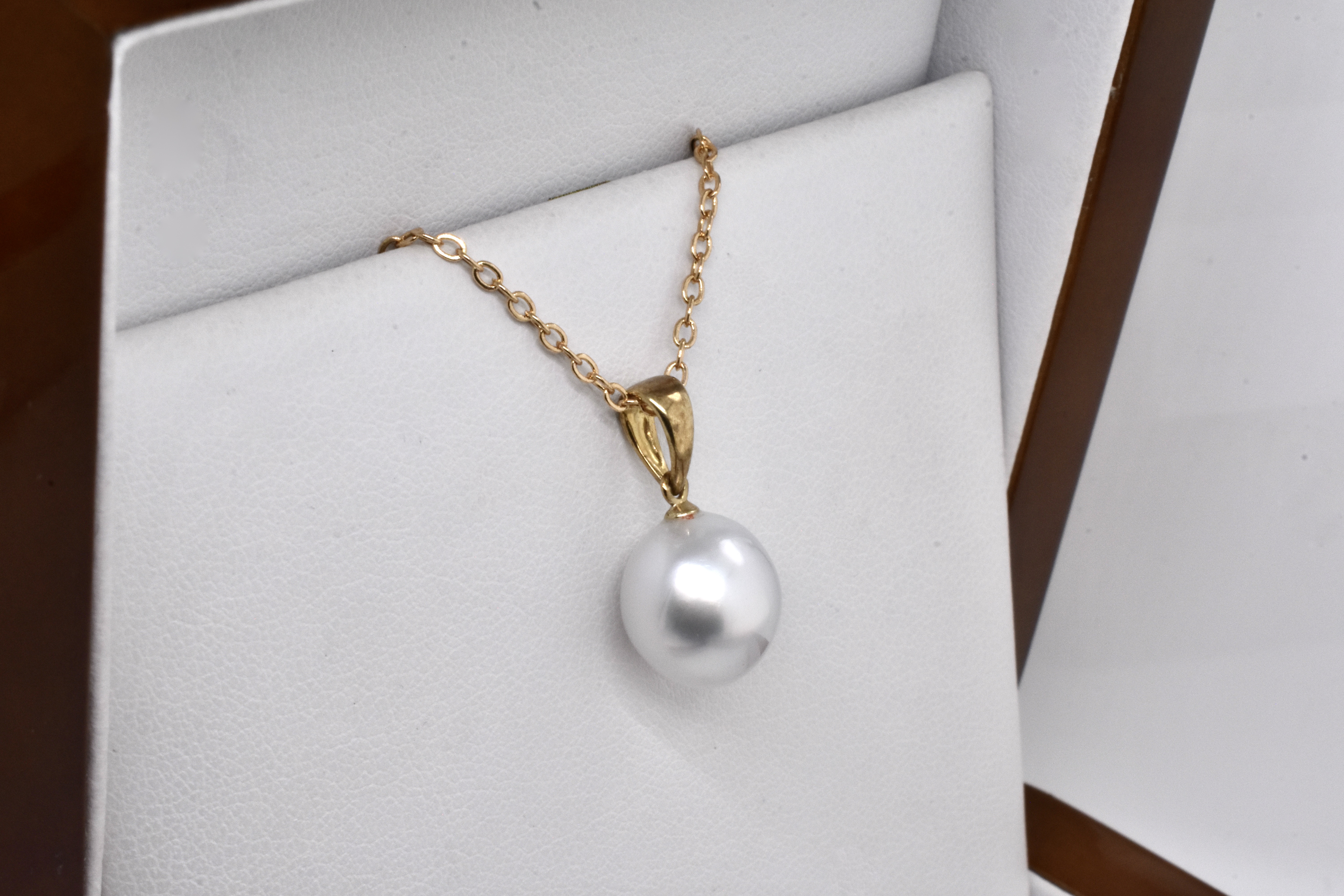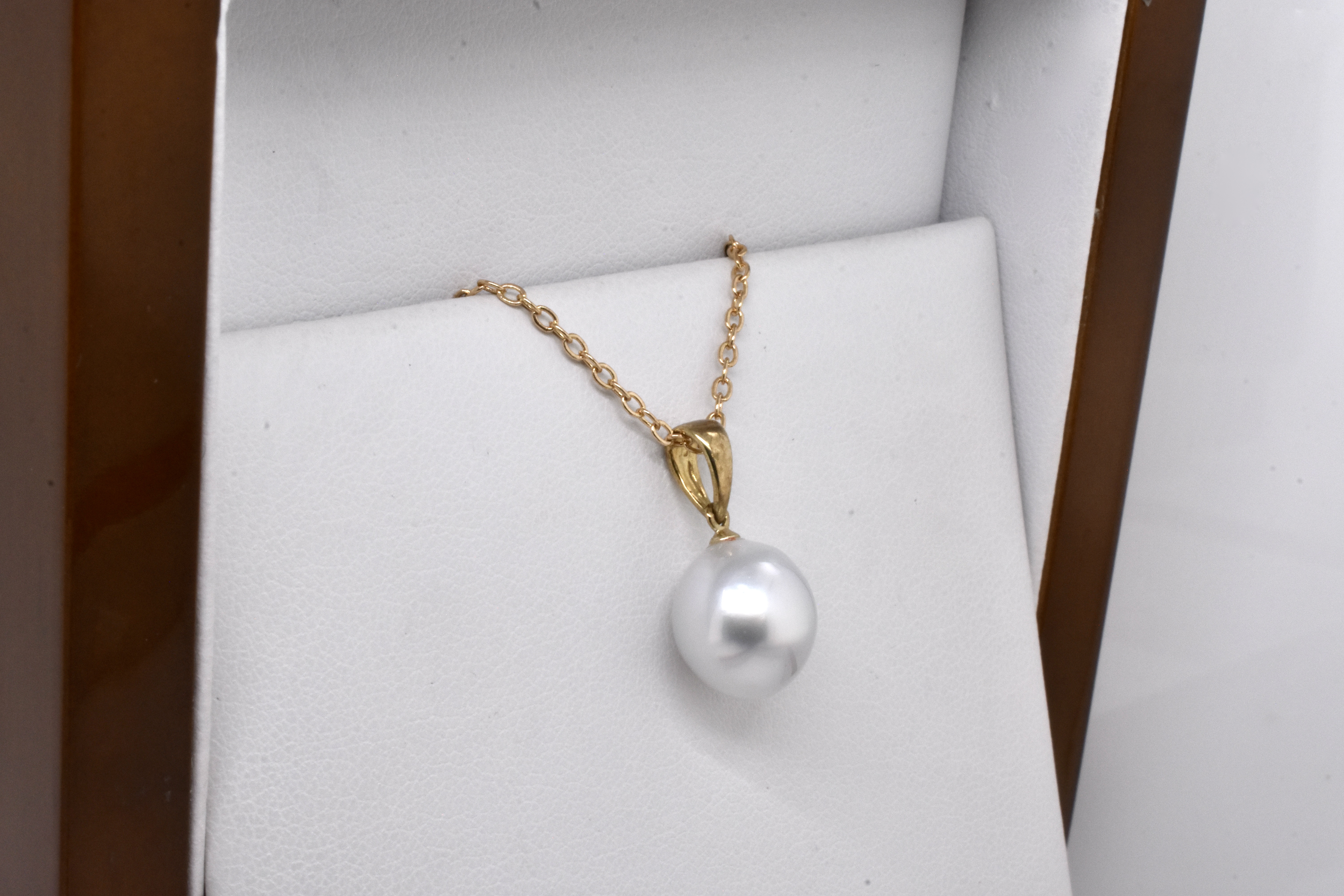 A classic piece, this 9ct yellow gold pendant features a 10-11mm slightly oval shaped silvery white south sea pearl with good lustre, with a simple tapered plain bail. Chains available for separate purchase