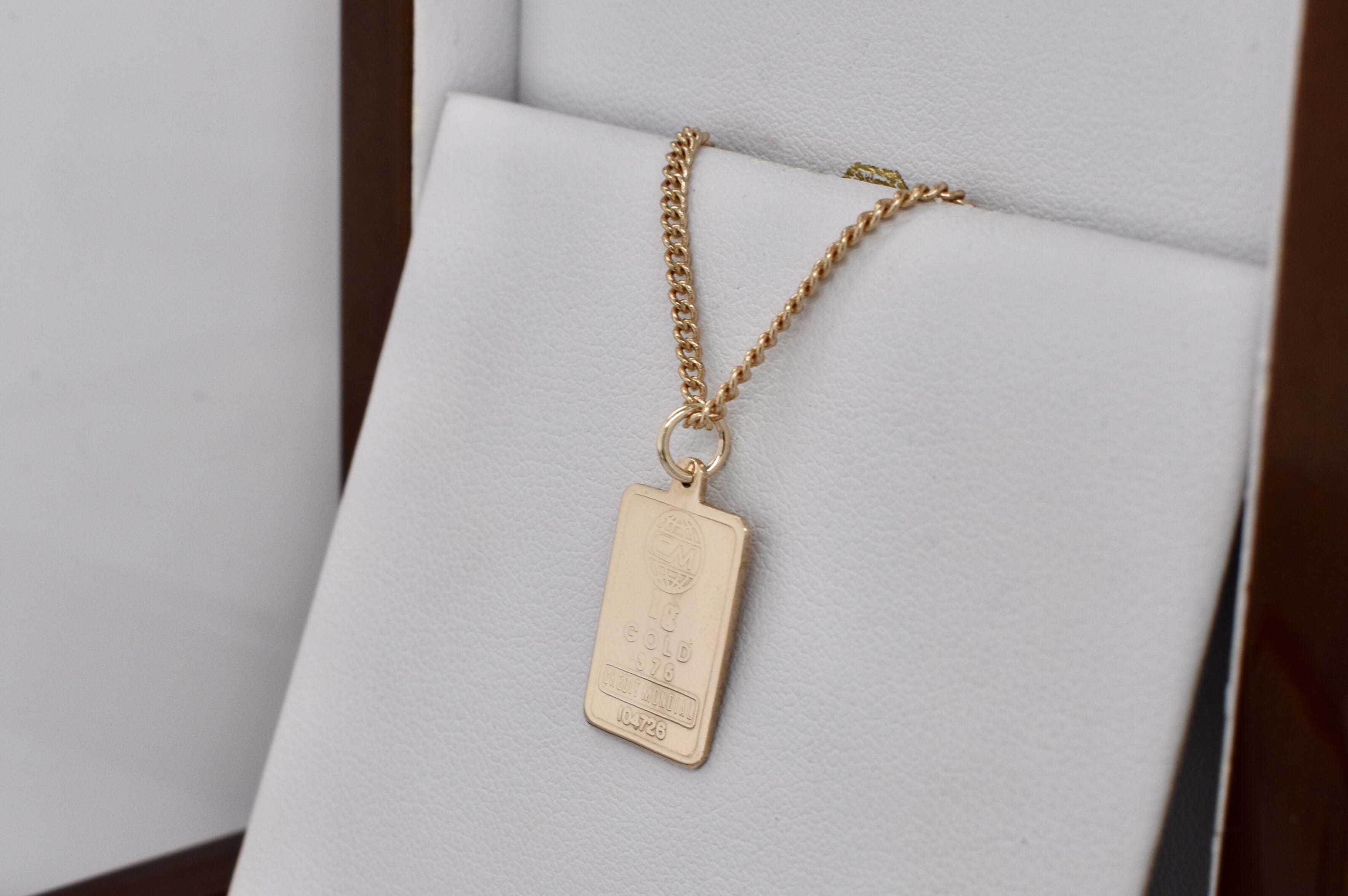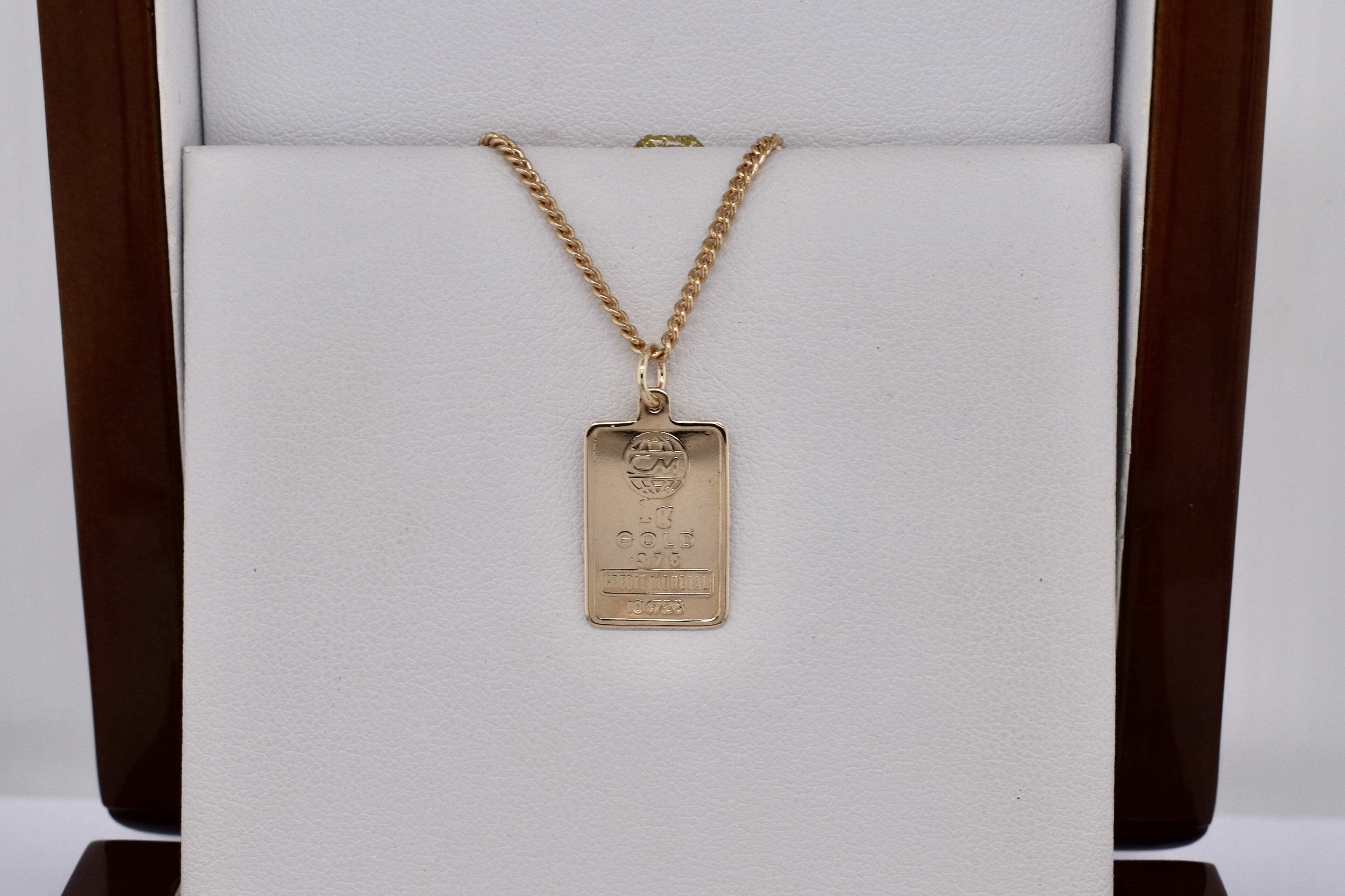 9ct yellow gold flat ingot pendant weighing 1g and measuring 16x9mm with a jumpring loop at top. Chains are available for separate purchase