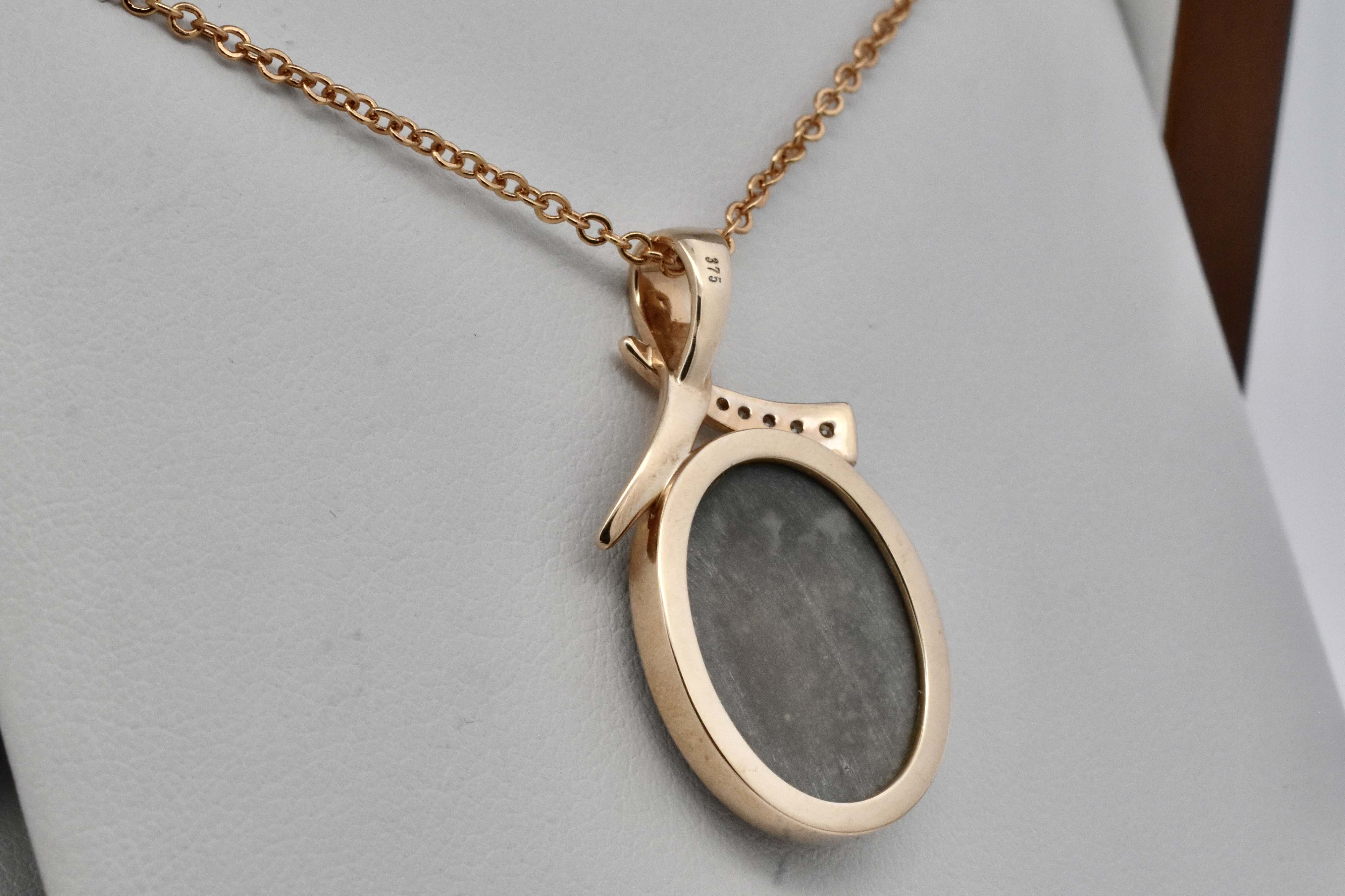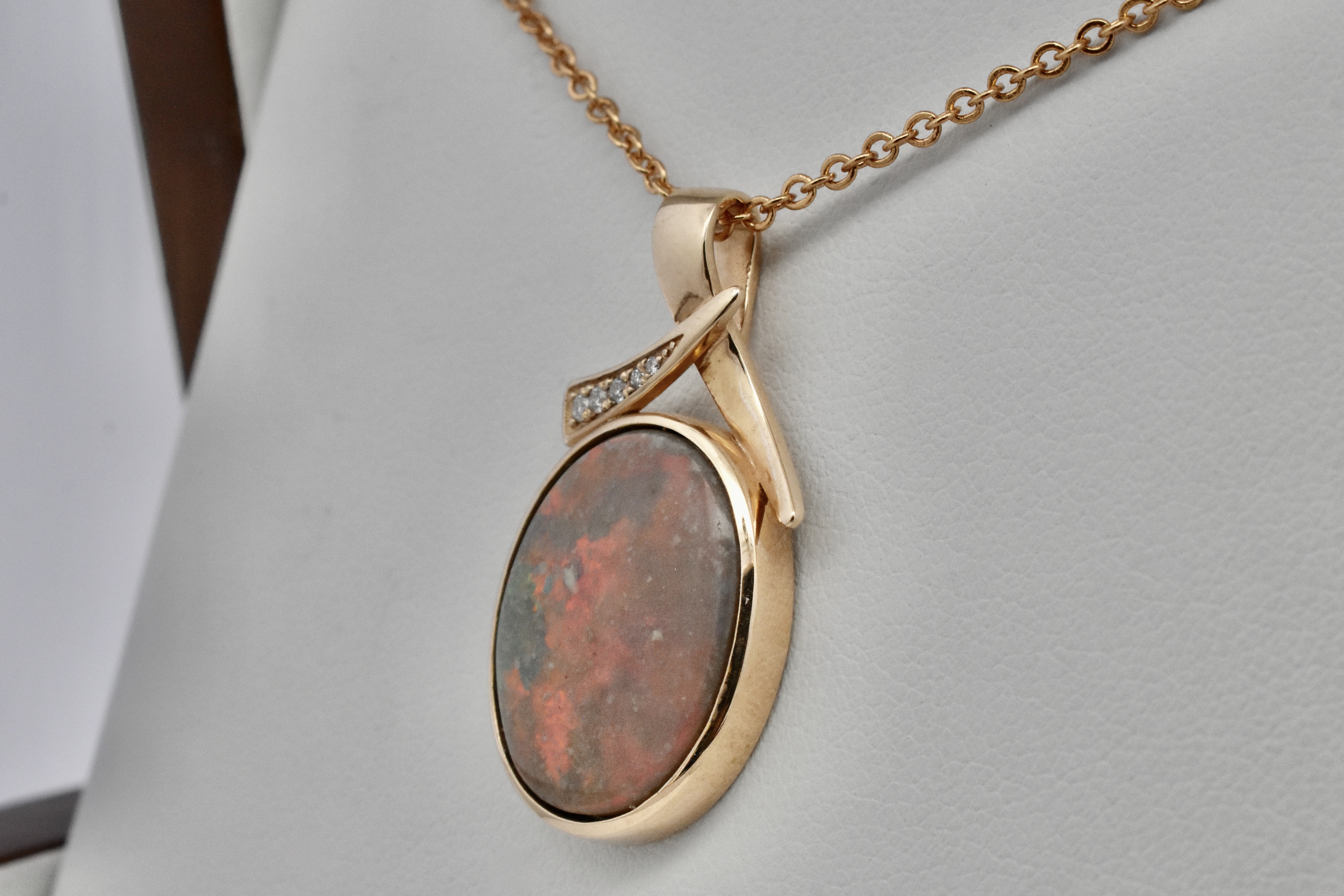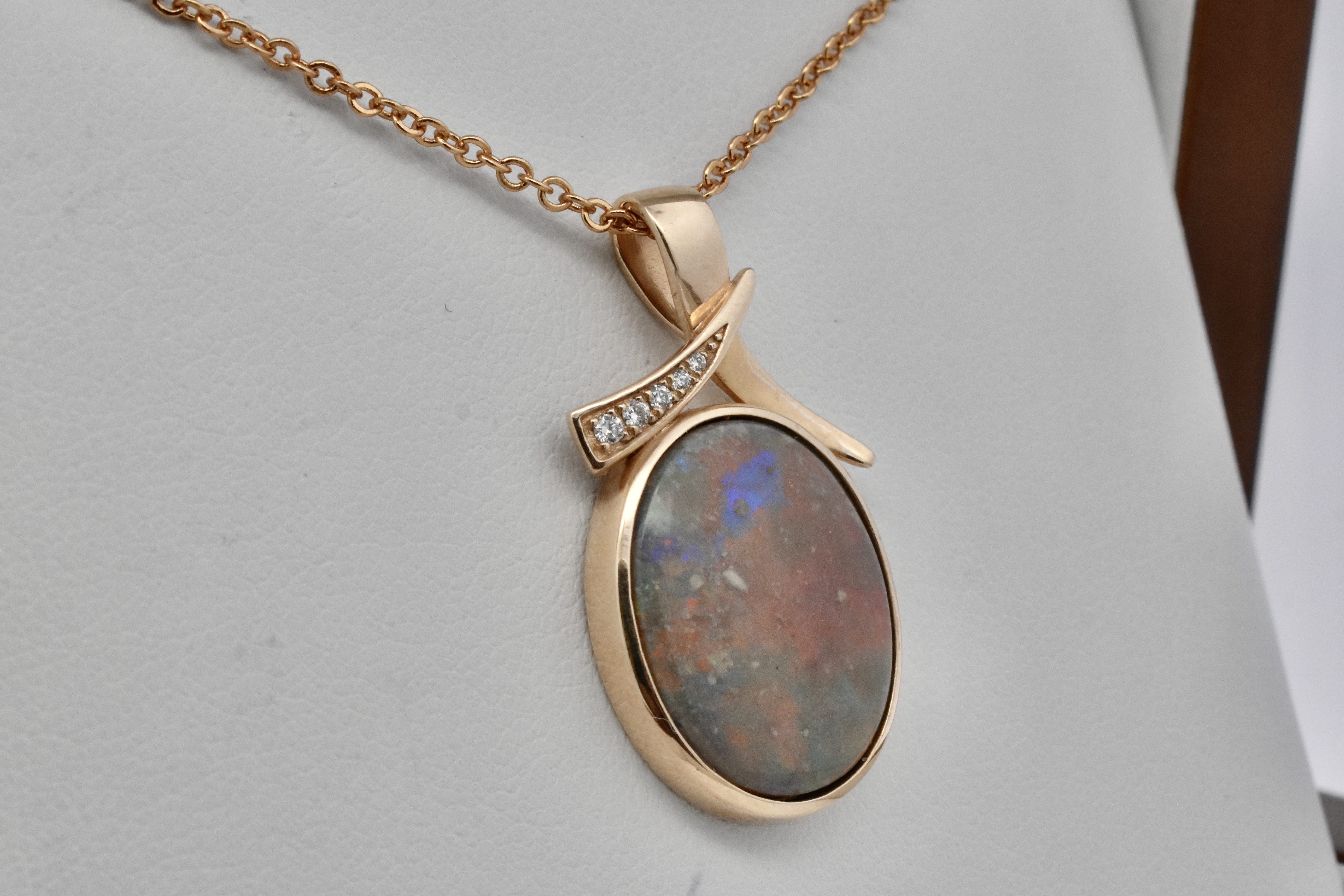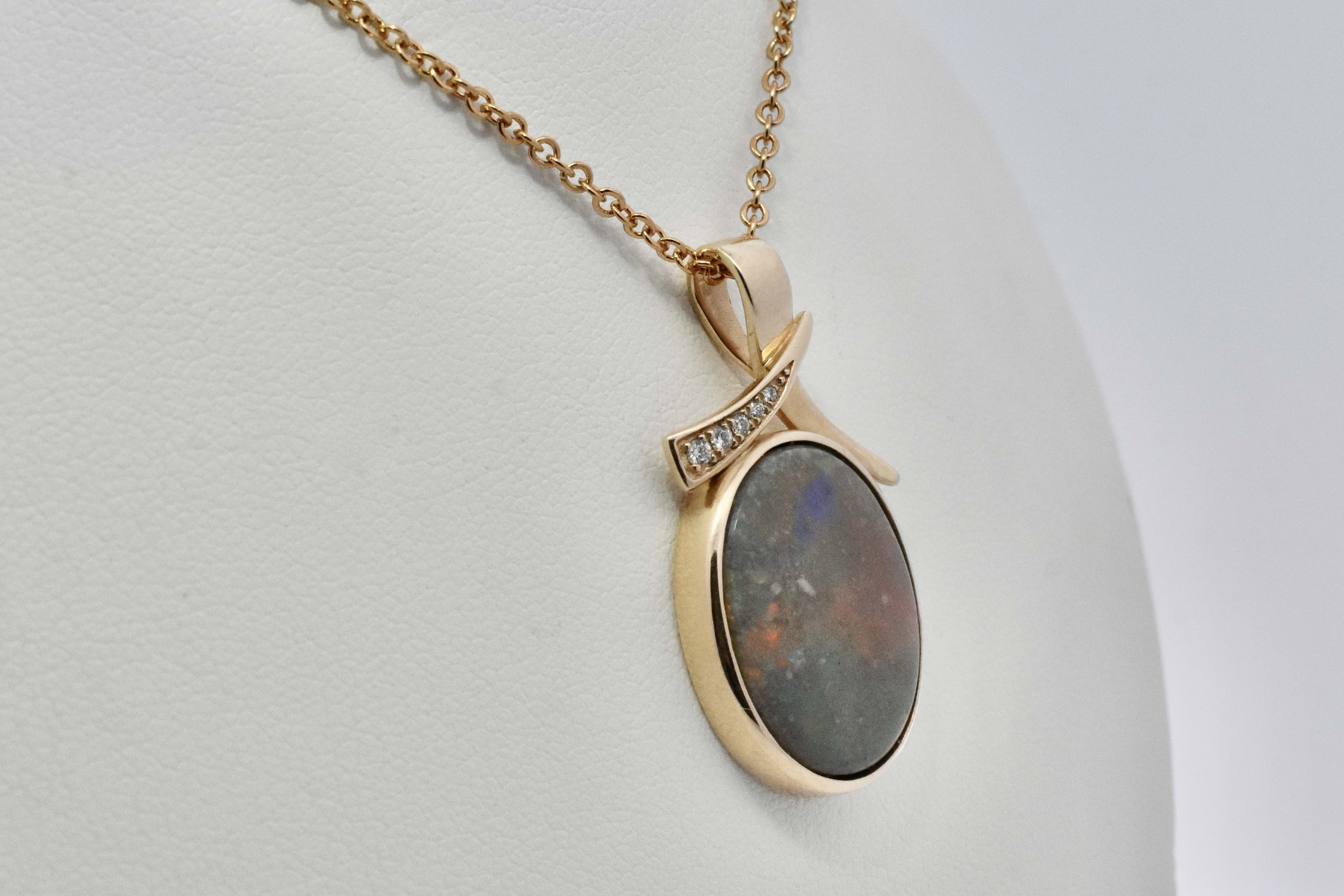 This unique pendant consists of one 18.45 x 14.50mm brownish grey cabochon Andamooka opal with orange, blue, green and violet flashes, totalling 5.70ct. This pendant is bezel set with a cross over loop which is set with five round brilliant cut diamonds (0.04ct total). Chains available for separate purchase