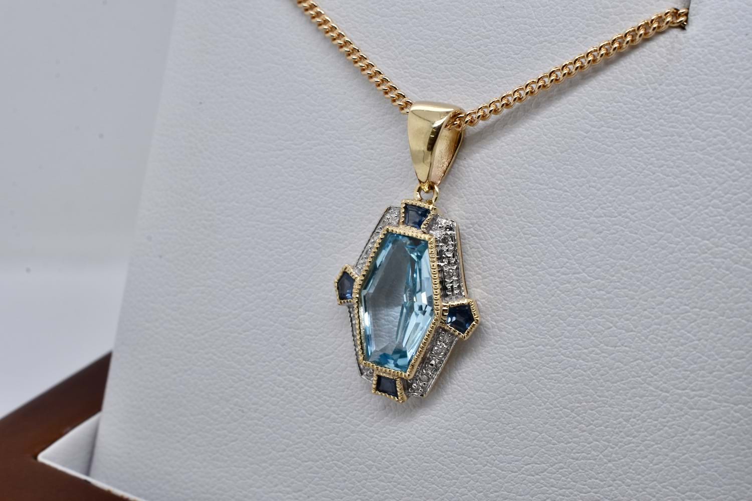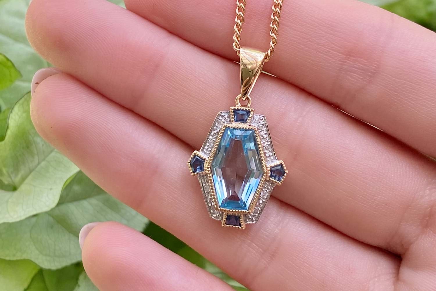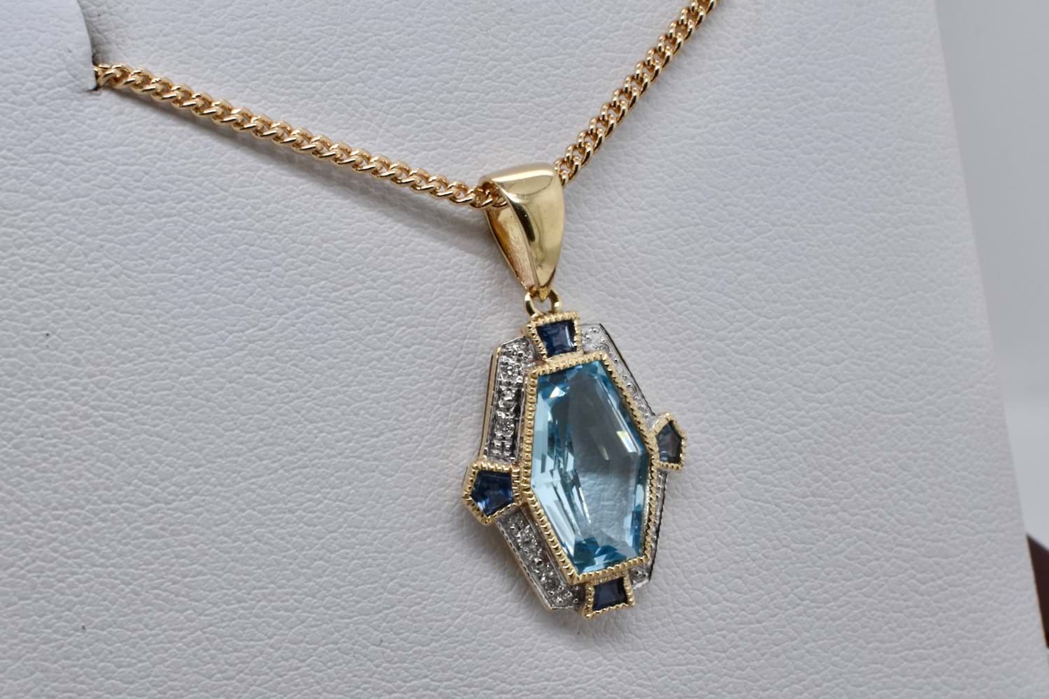 SOLD 9ct Yellow Gold Blue Topaz, Sapphire & Diamond Art Deco Style Pendant