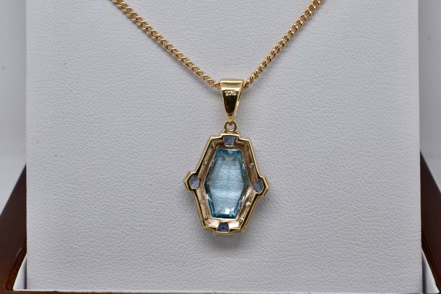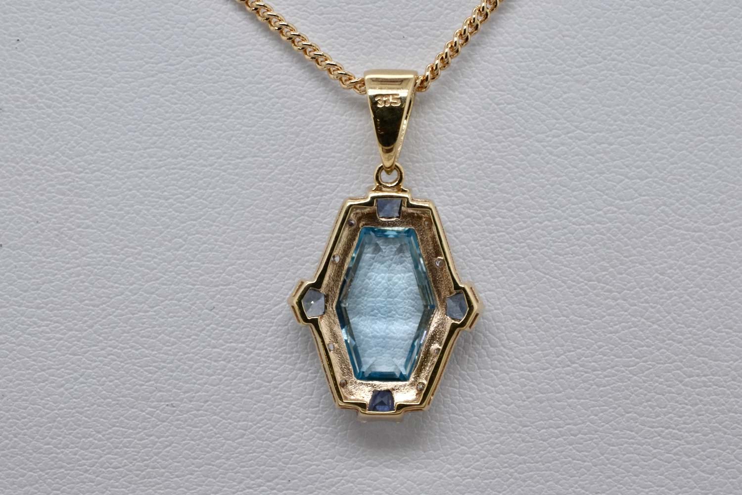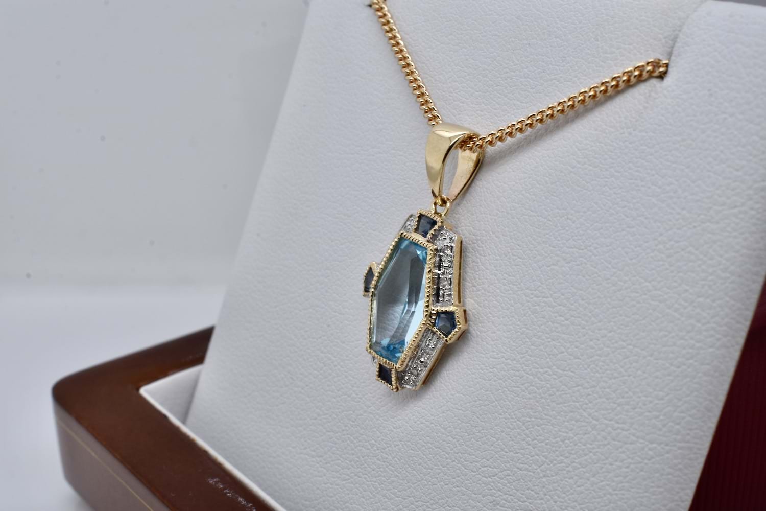 SOLD 9ct Yellow Gold Blue Topaz, Sapphire & Diamond Art Deco Style Pendant