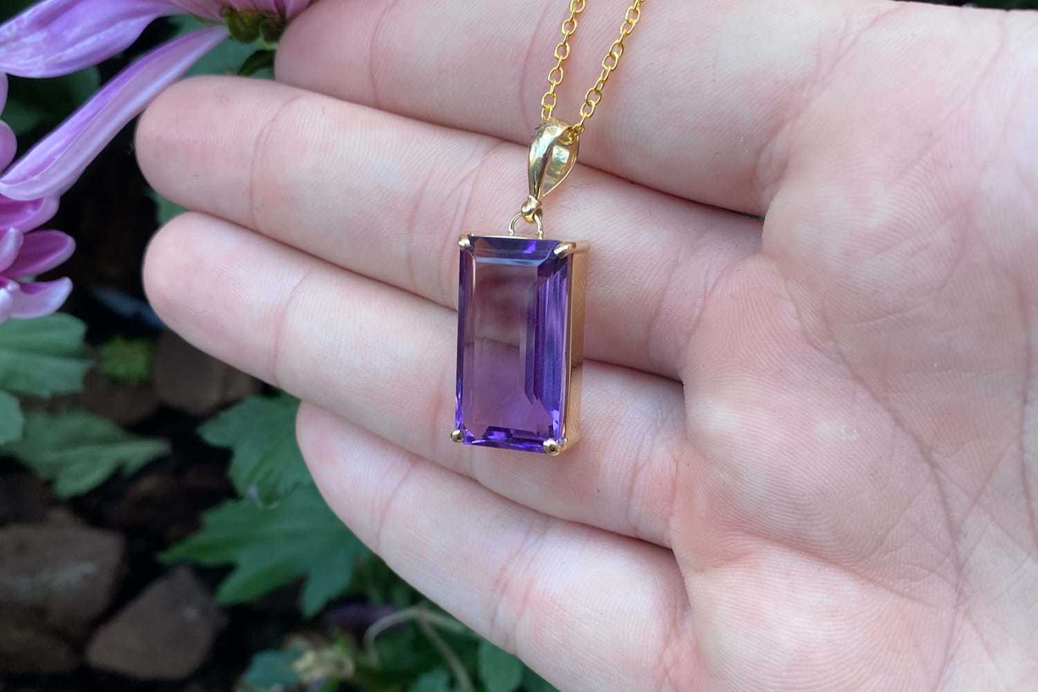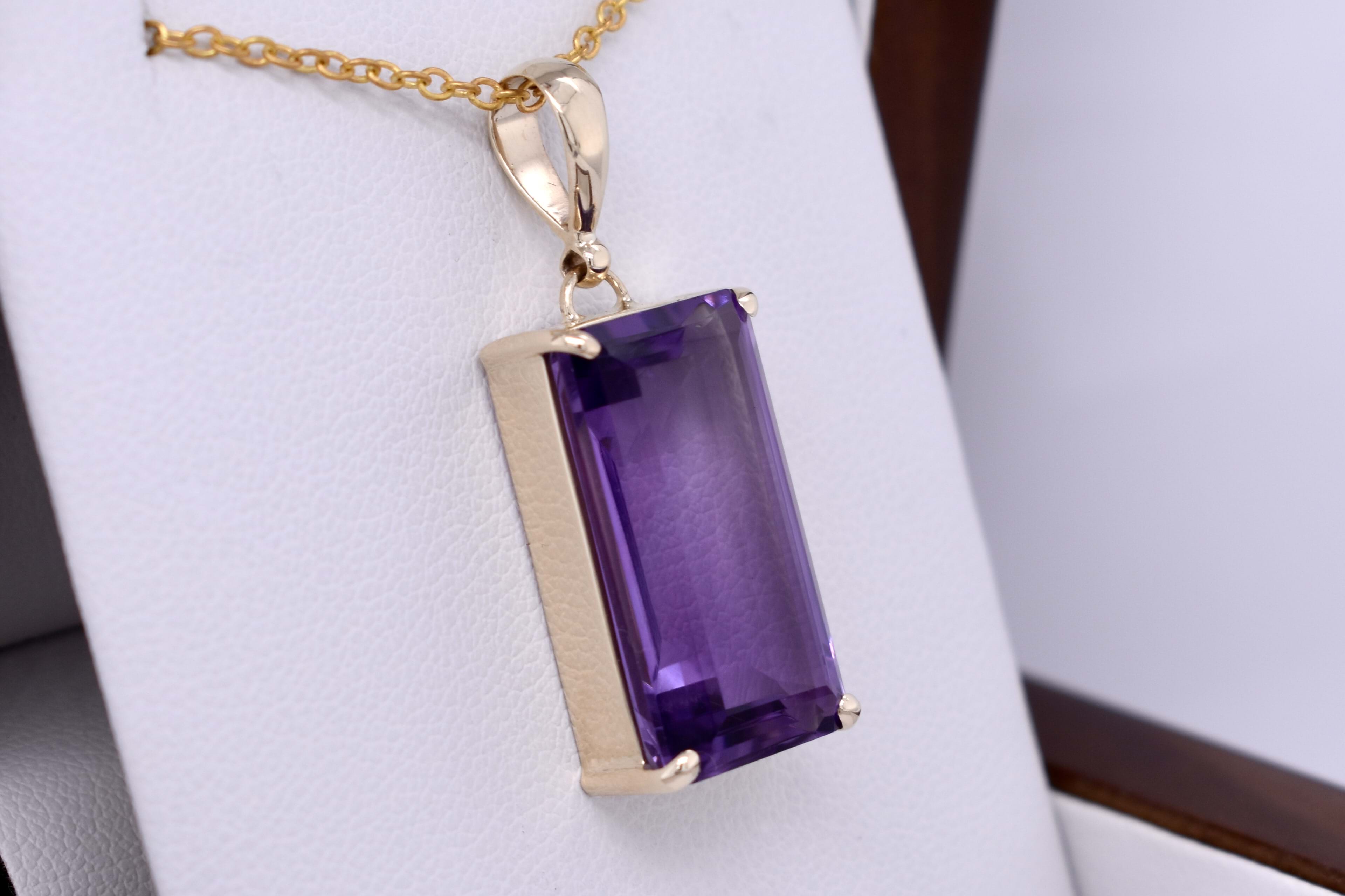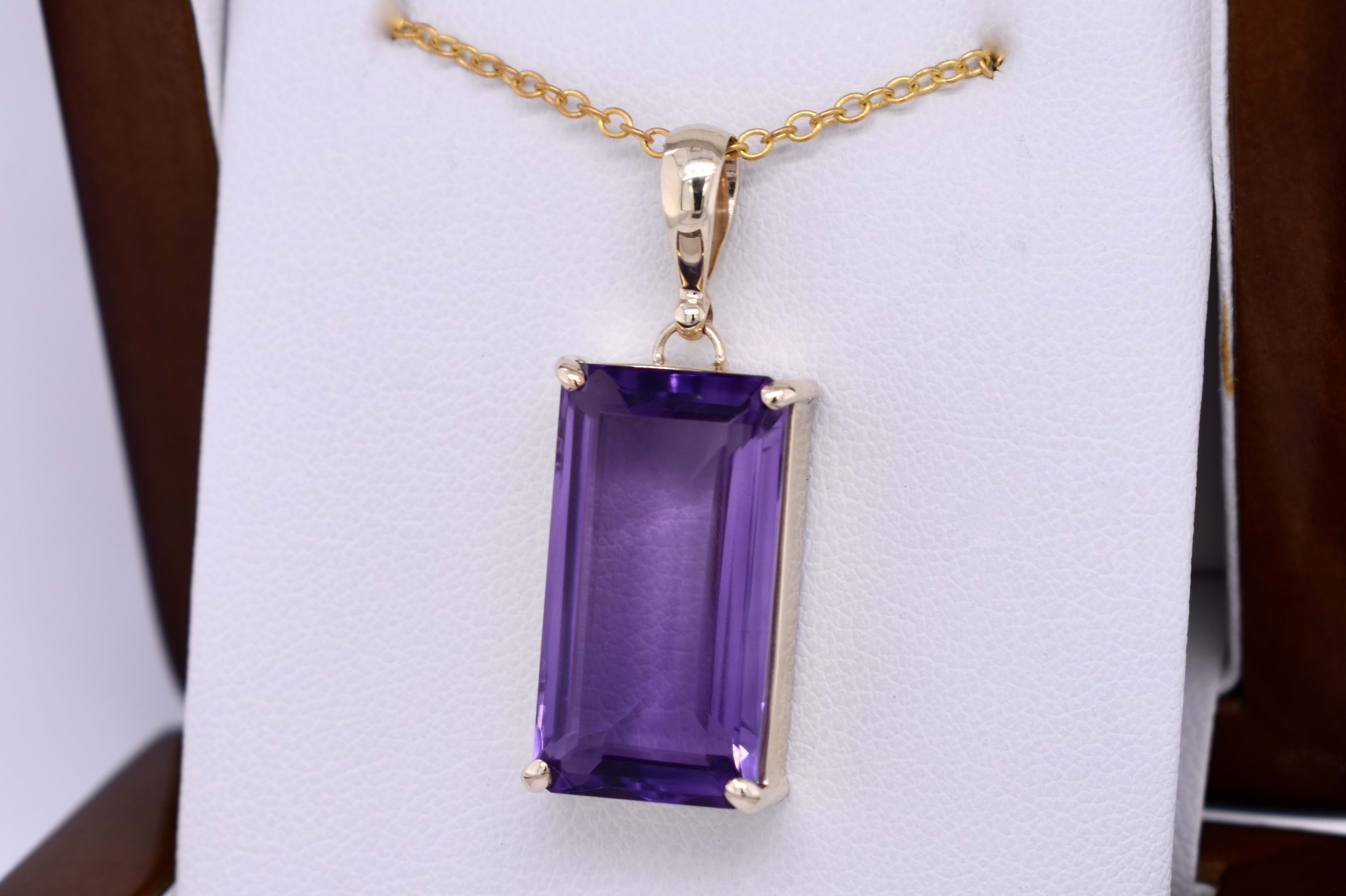 Lovely handmade emerald cut shaped amethyst pendant, four claw set in 9ct yellow gold with a plain pendant bale. Amethyst measures 21.93x11.68x7.26mm. Chains available for separate purchase. Independent Valuation Supplied