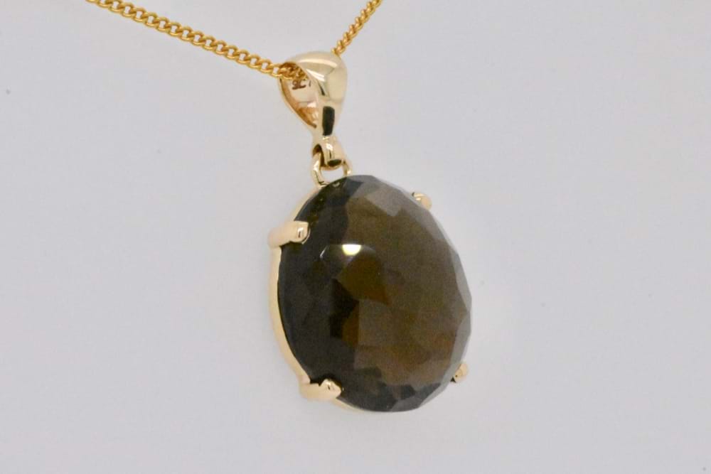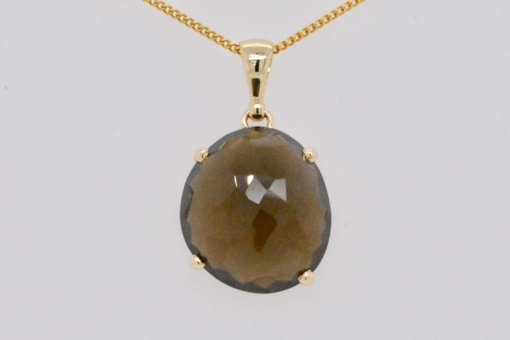 This checkerboard cut freeform smokey quartz has a checkerboard faceting and measures approx. 18x16mm set into a handmade 9ct yellow gold four claw setting with plain bale. Chains available for separate purchase