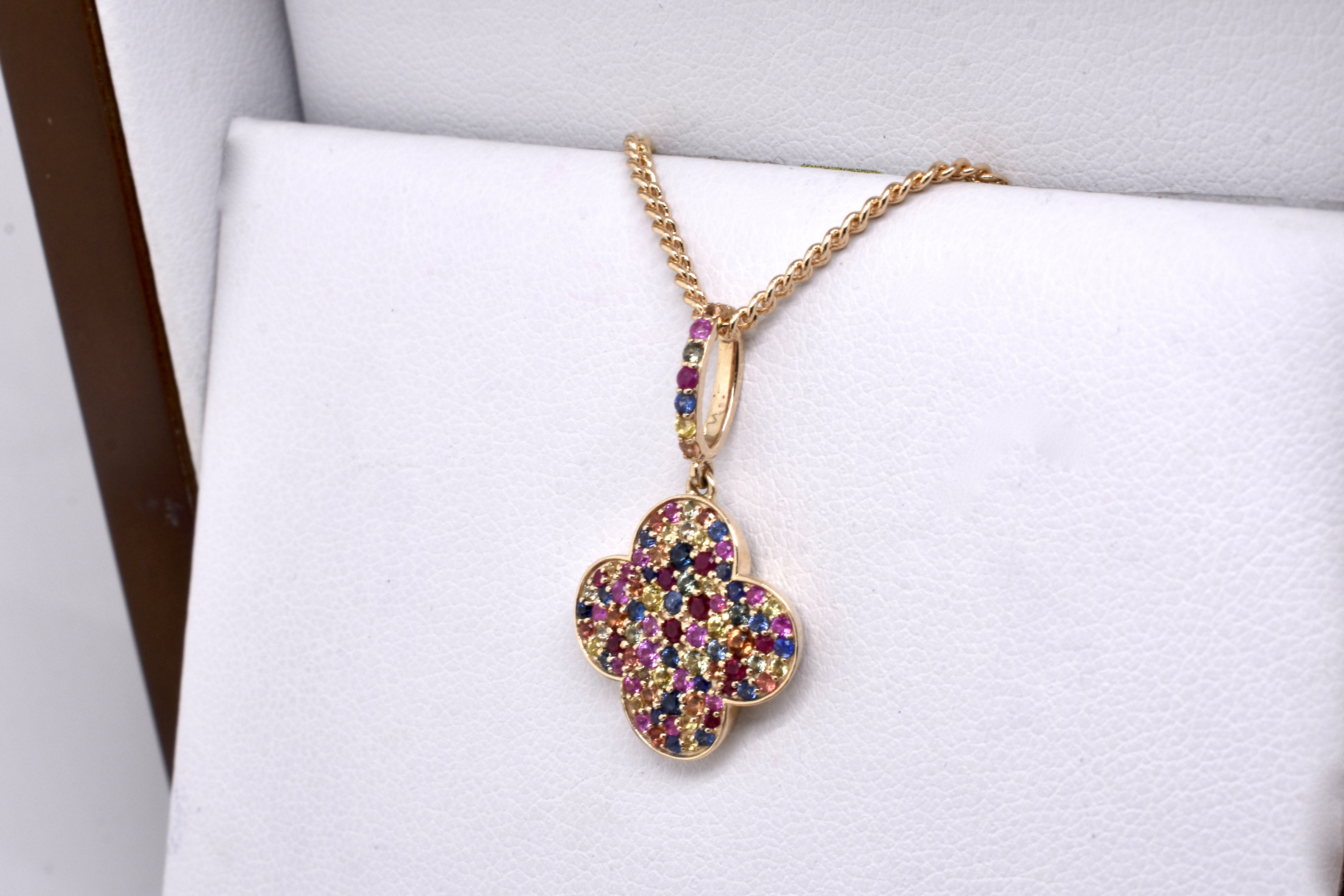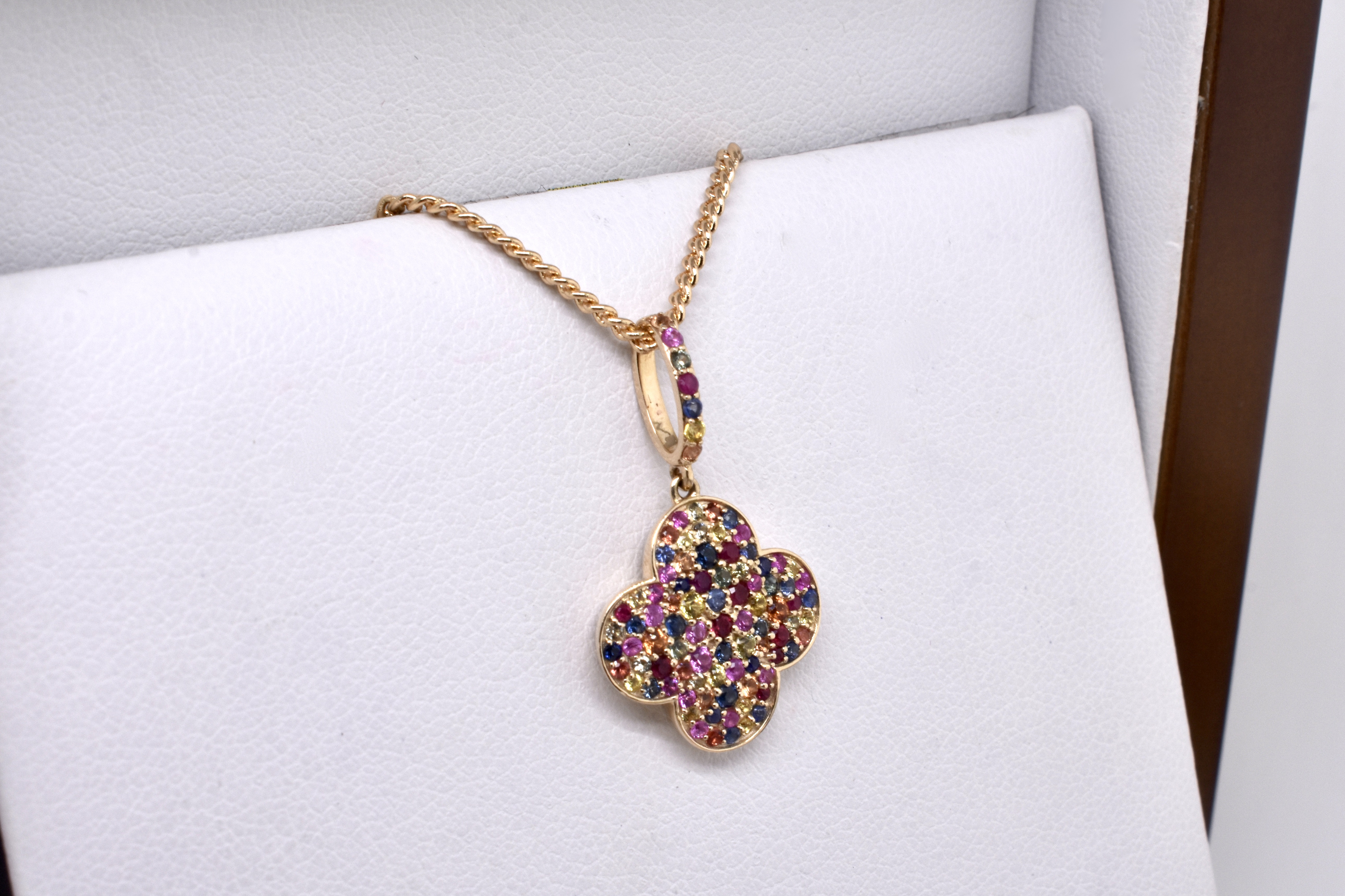 This charming and colourful pendant is crafted from 9ct yellow gold, in a clover shape style and pave set with multicoloured natural sapphires in tones of orange, yellow, green, blue and pink with gems continuing up the front of the bail. Clover measures approx. 15 x 15mm with 1.75ct of sapphires. Chains available for separate purchase