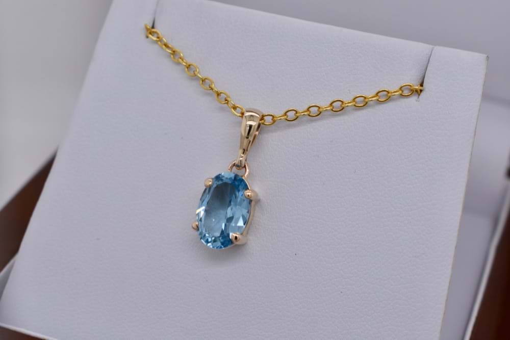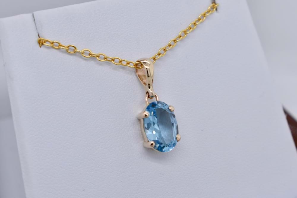 9ct yellow gold handmade pendant featuring one beautiful, oval, faceted, sky blue topaz four claw set with a plain bale. Stone measures 11.8x8mm. Chains available for separate purchase