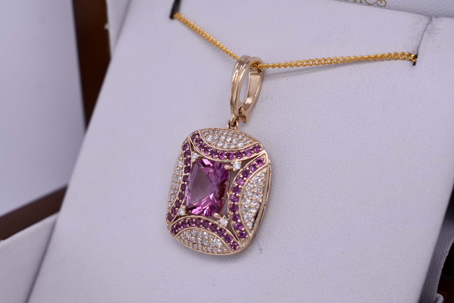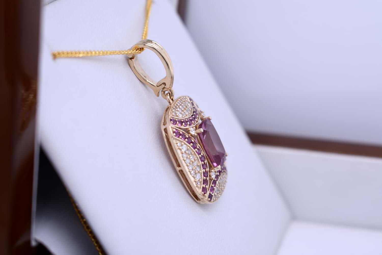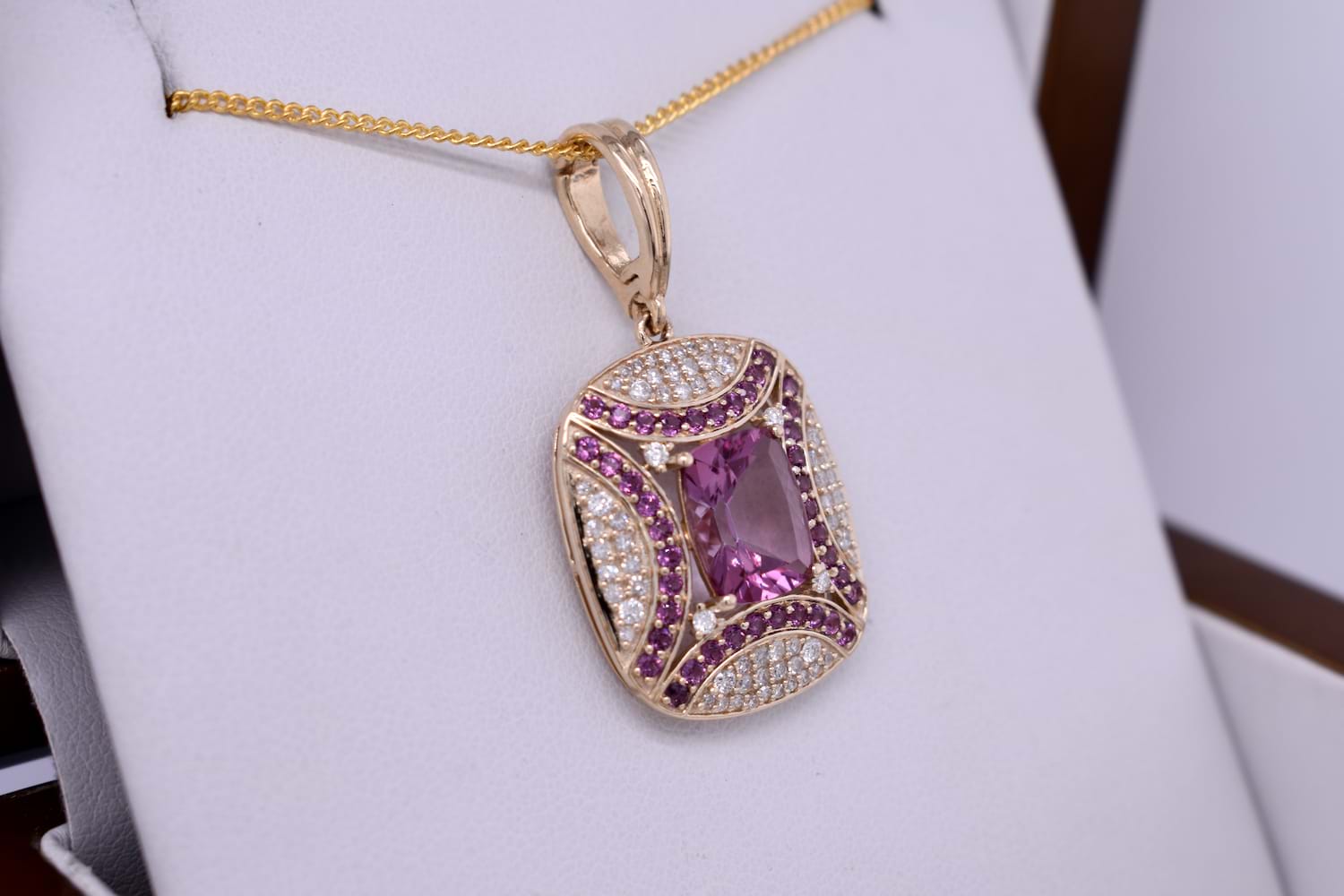 SOLD 9ct Yellow Gold Pink Topaz, Rhodolite Garnet & 0.41ct GH SI Diamond Enhancer