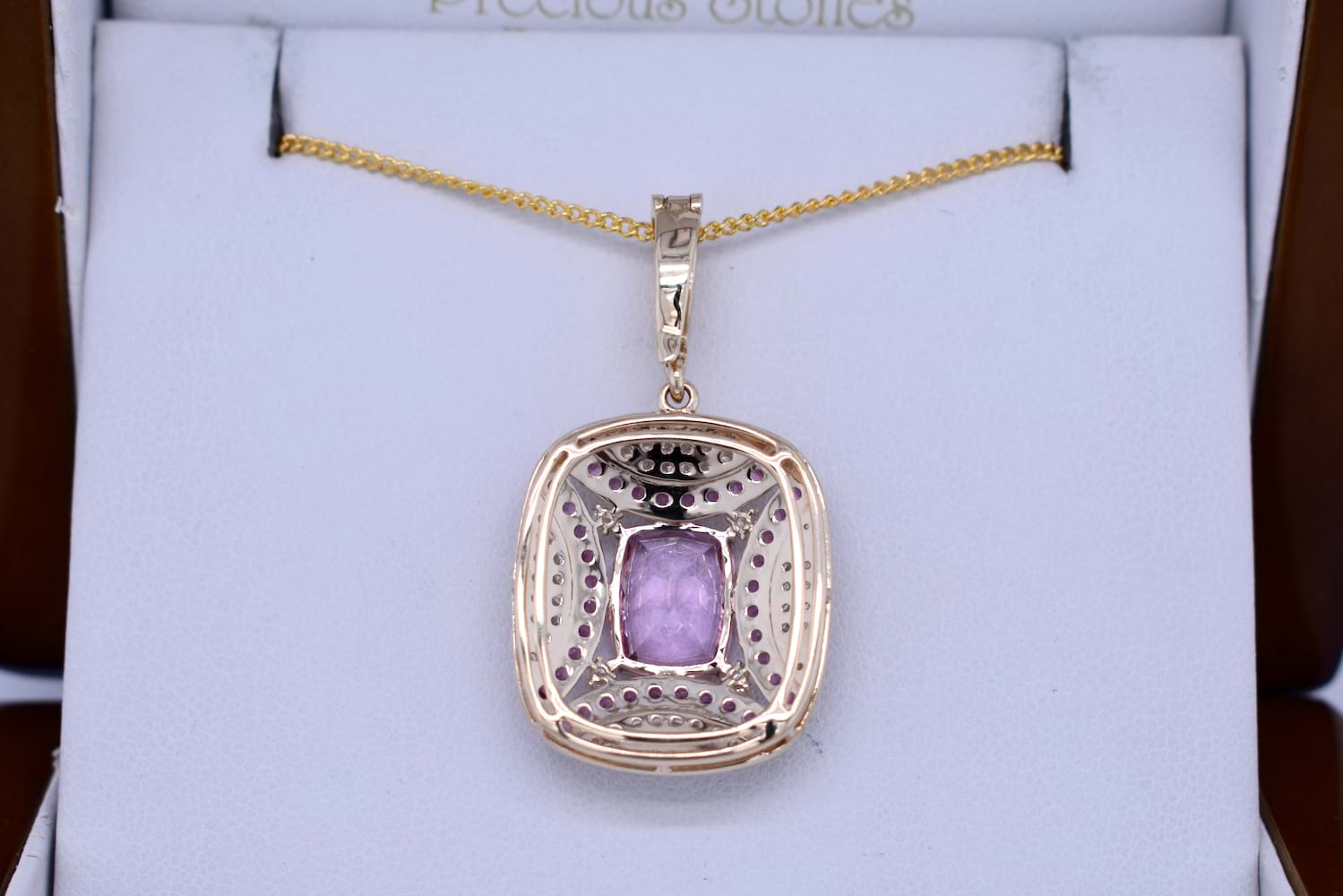 Crafted in 9ct yellow gold, the prettiest pink enhancer consists of a 10x8mm pink topaz surrounded by 1.5mm round garnets and round brilliant diamonds set in a cushion shaped pendant. Total diamond weight of 0.41ct GH SI. Complete with a 9ct yellow gold plain enhancer bale making it a versatile piece that can be clipped over various chains, strands of pearls or other necklets. Chains available for separate purchase. Complete the set with the matching earrings: 20390907