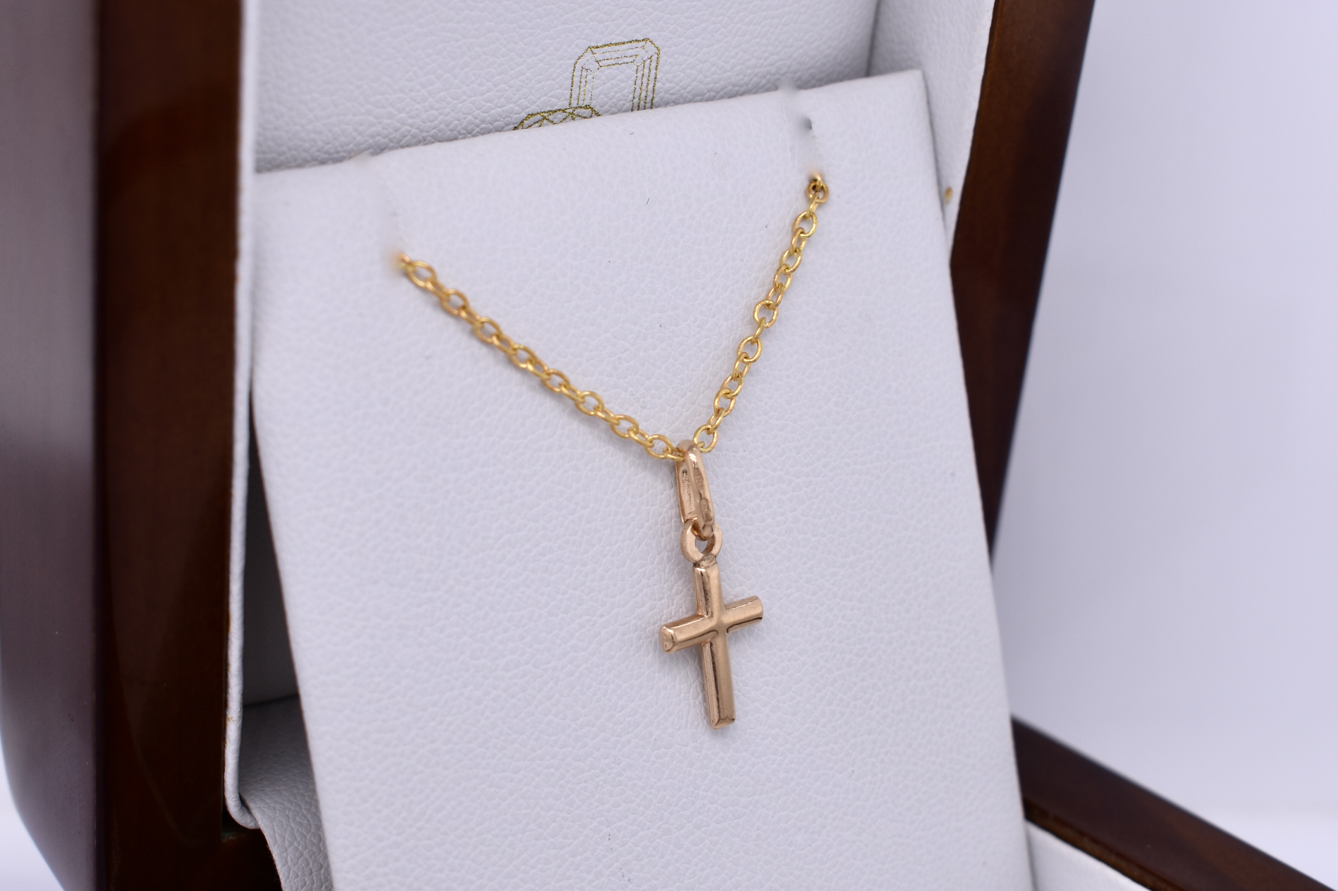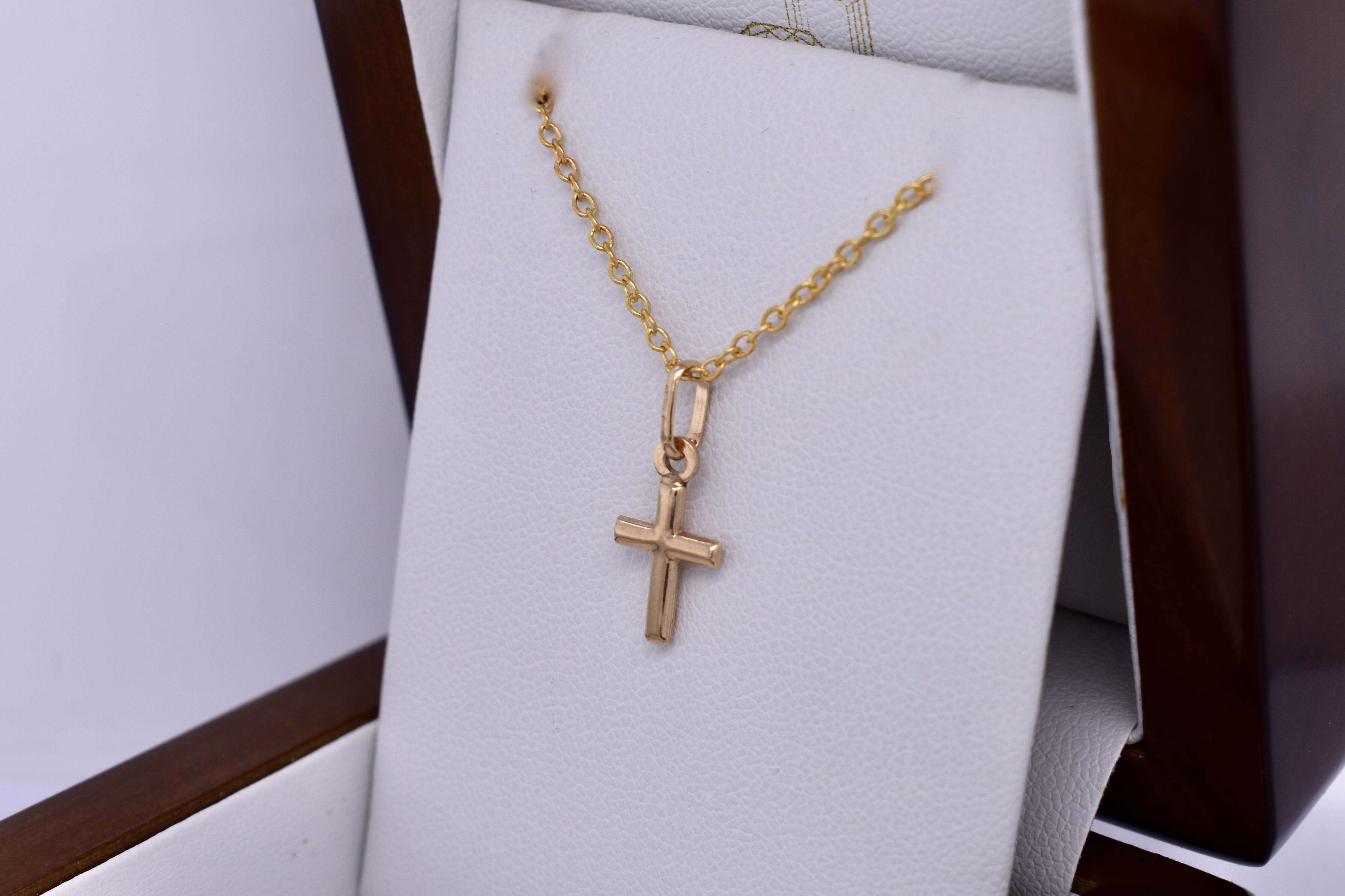 The sweetest 9ct yellow gold mini cross pendant, measuring 11.0x9.0mm with a plain pendant bale. Chains available for separate purchase.