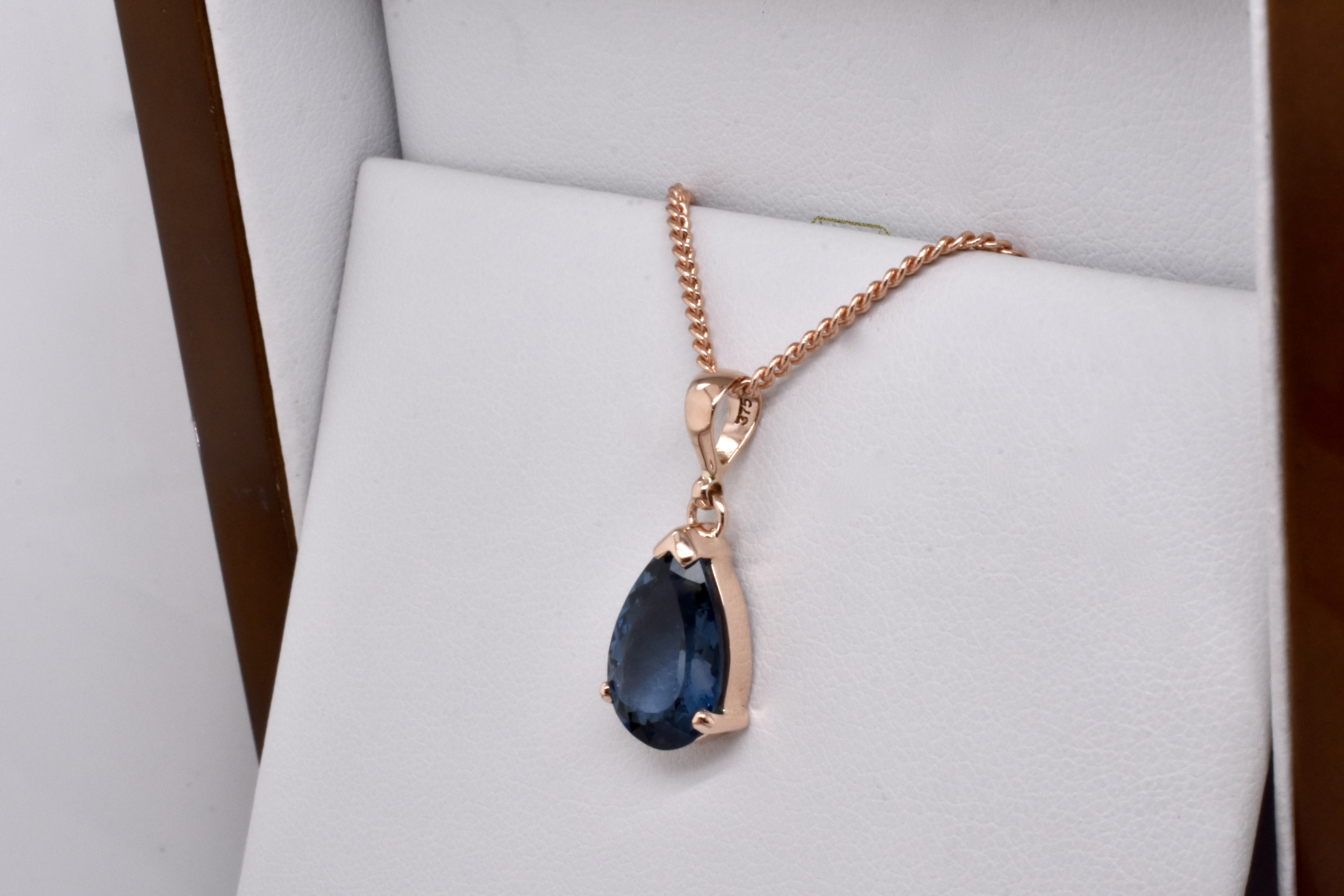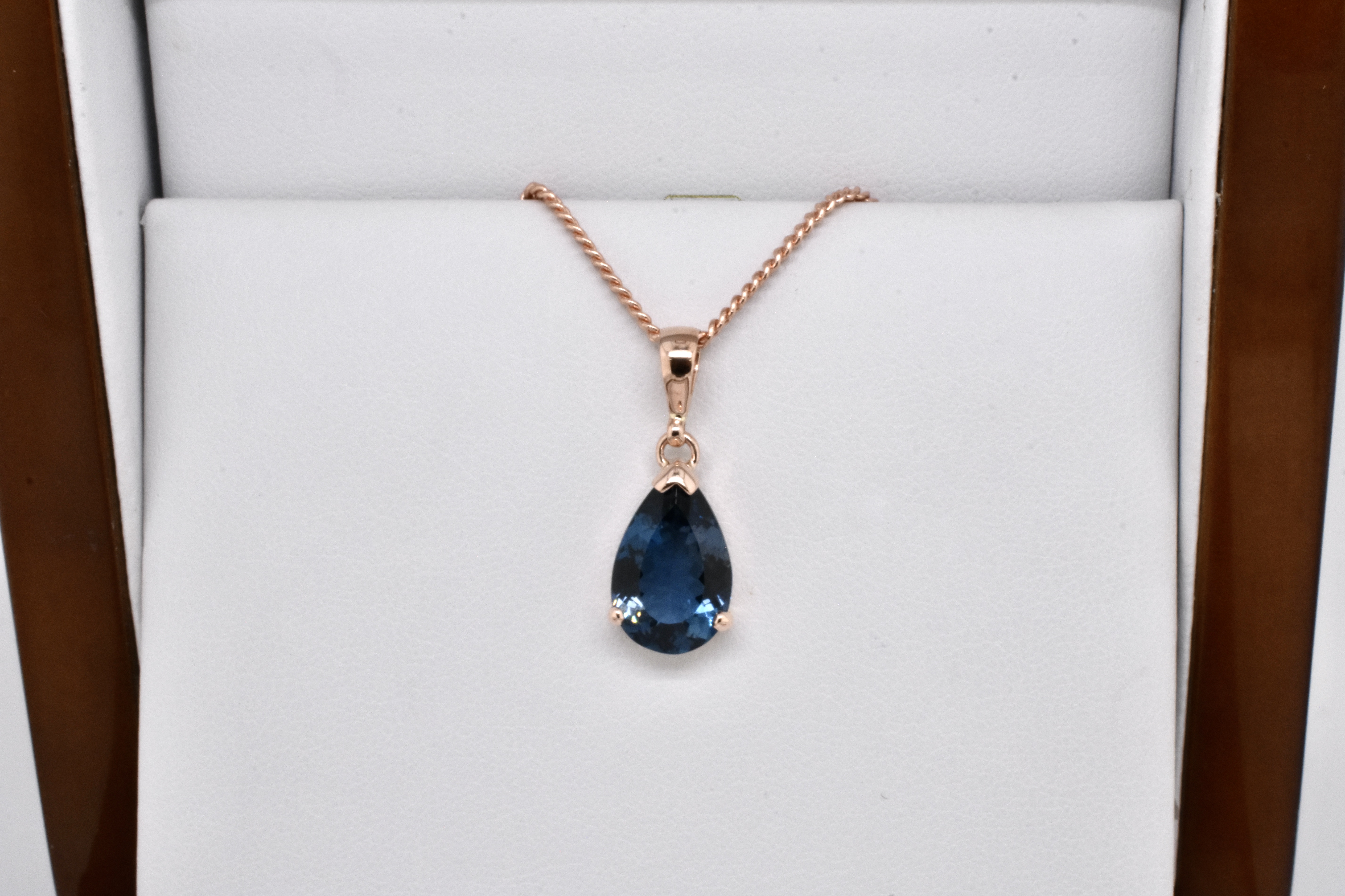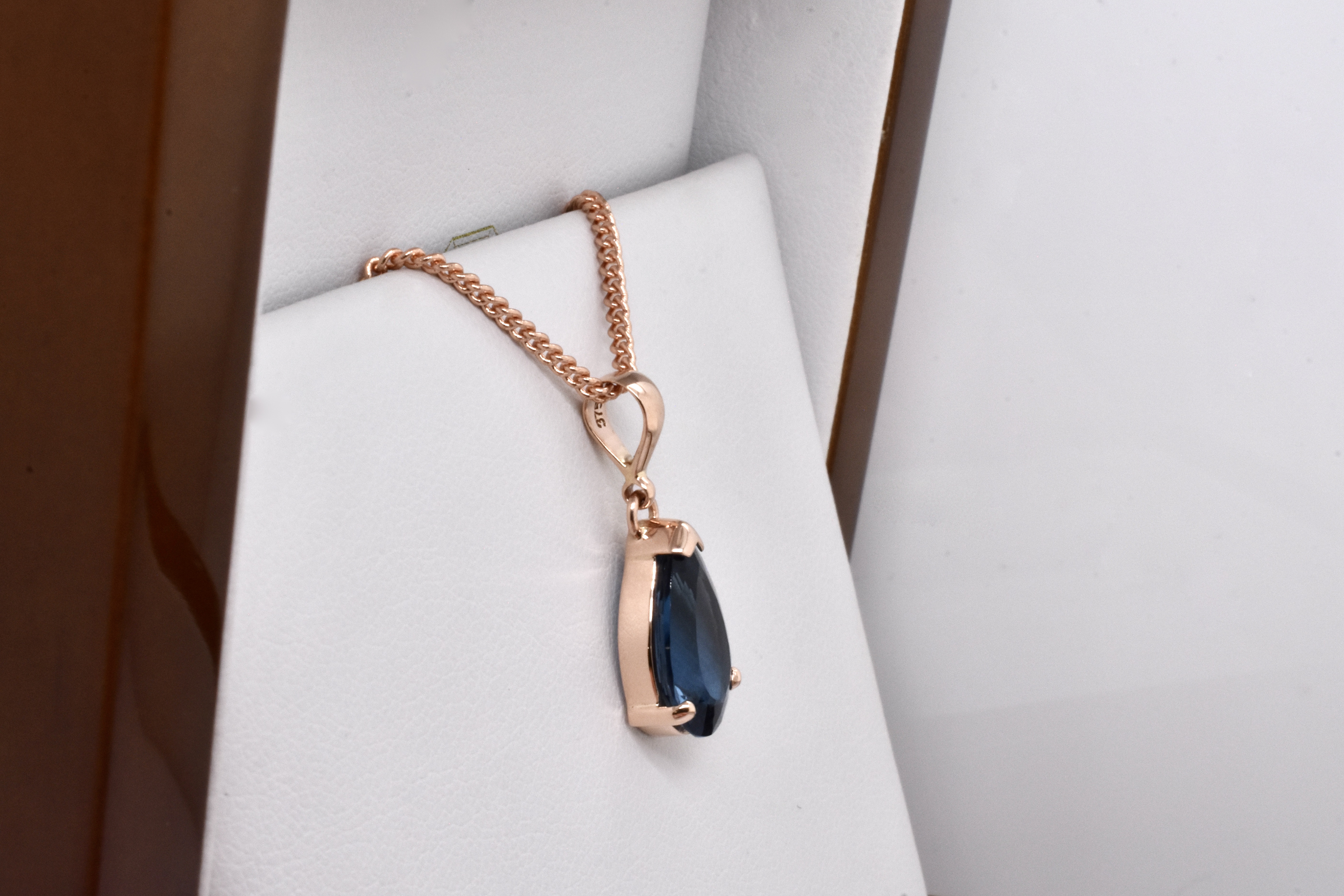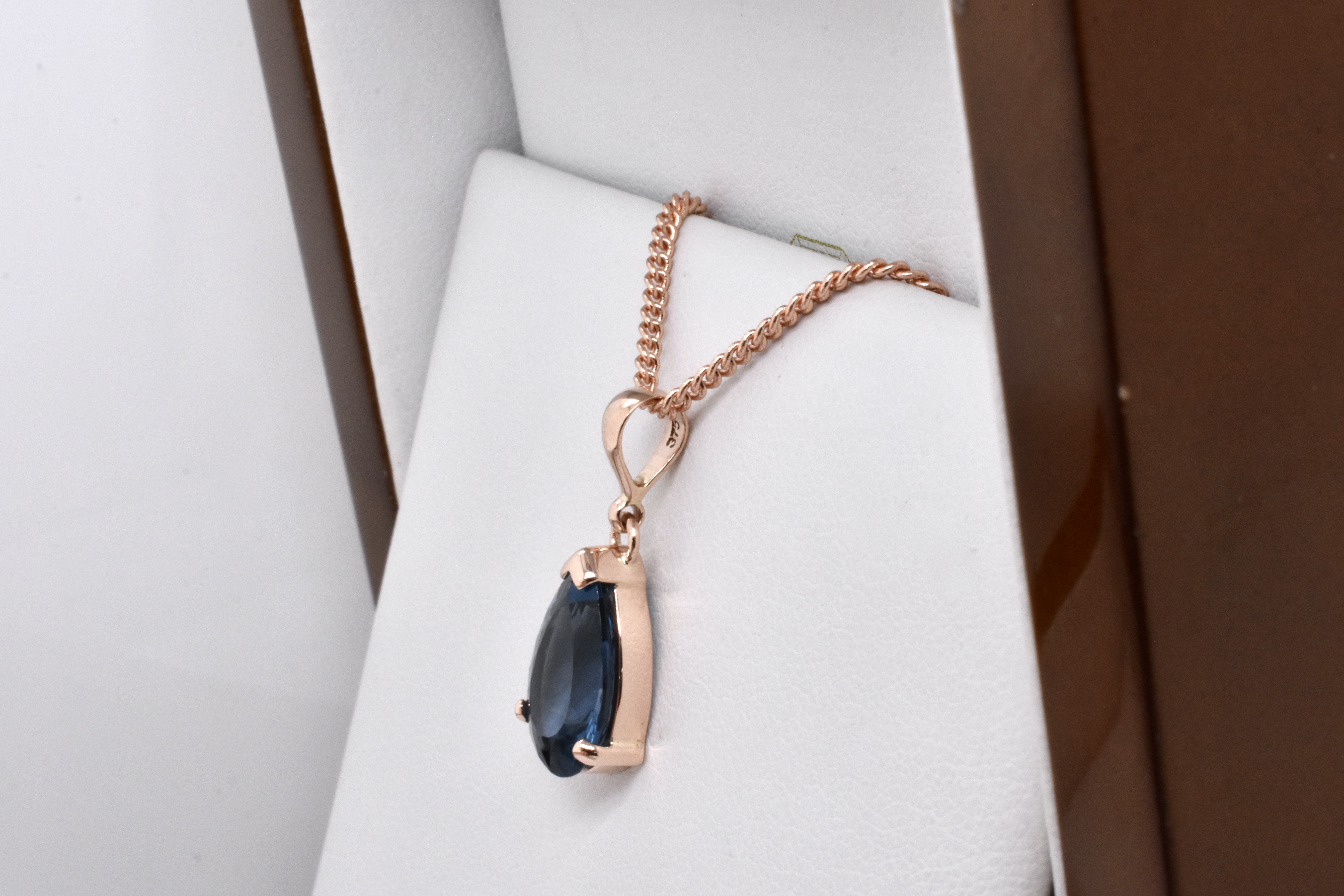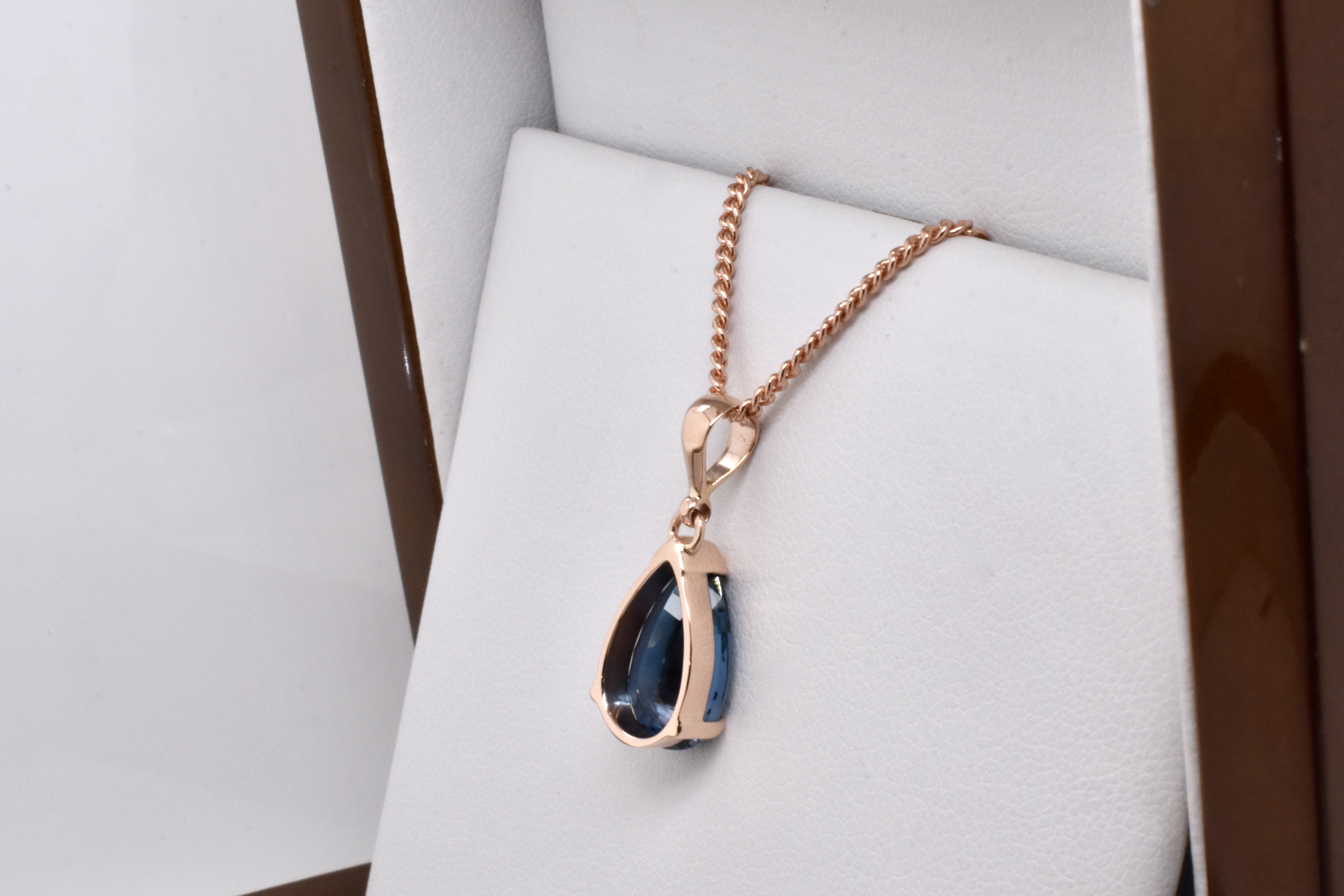 A lovely handmade 9ct rose gold pendant set with a gorgeously saturated London blue topaz, pear shape measuring approx. 14 x 10mm in a v cap and two claw setting, with plain tapered bail. Chains available for separate purchase