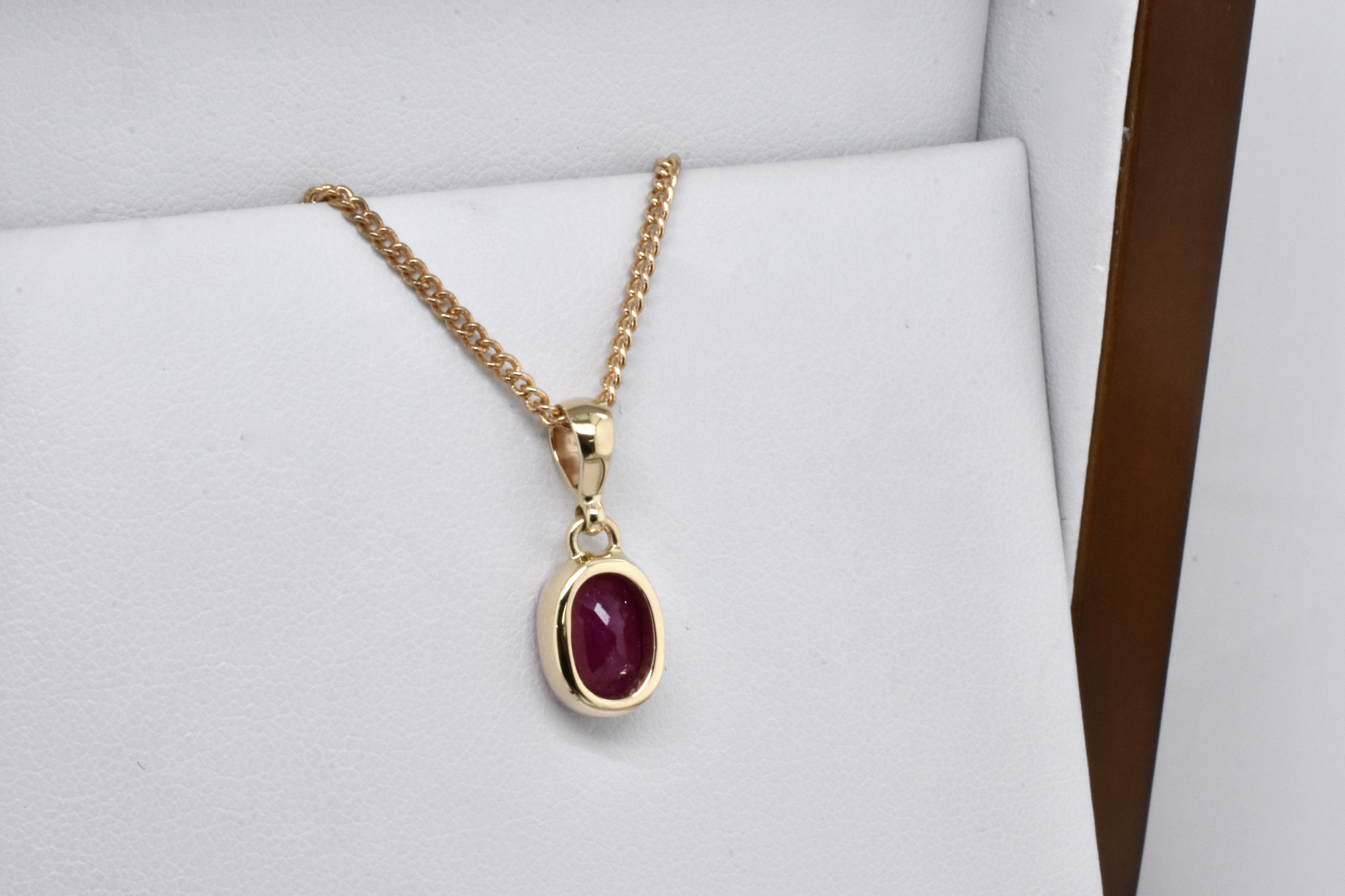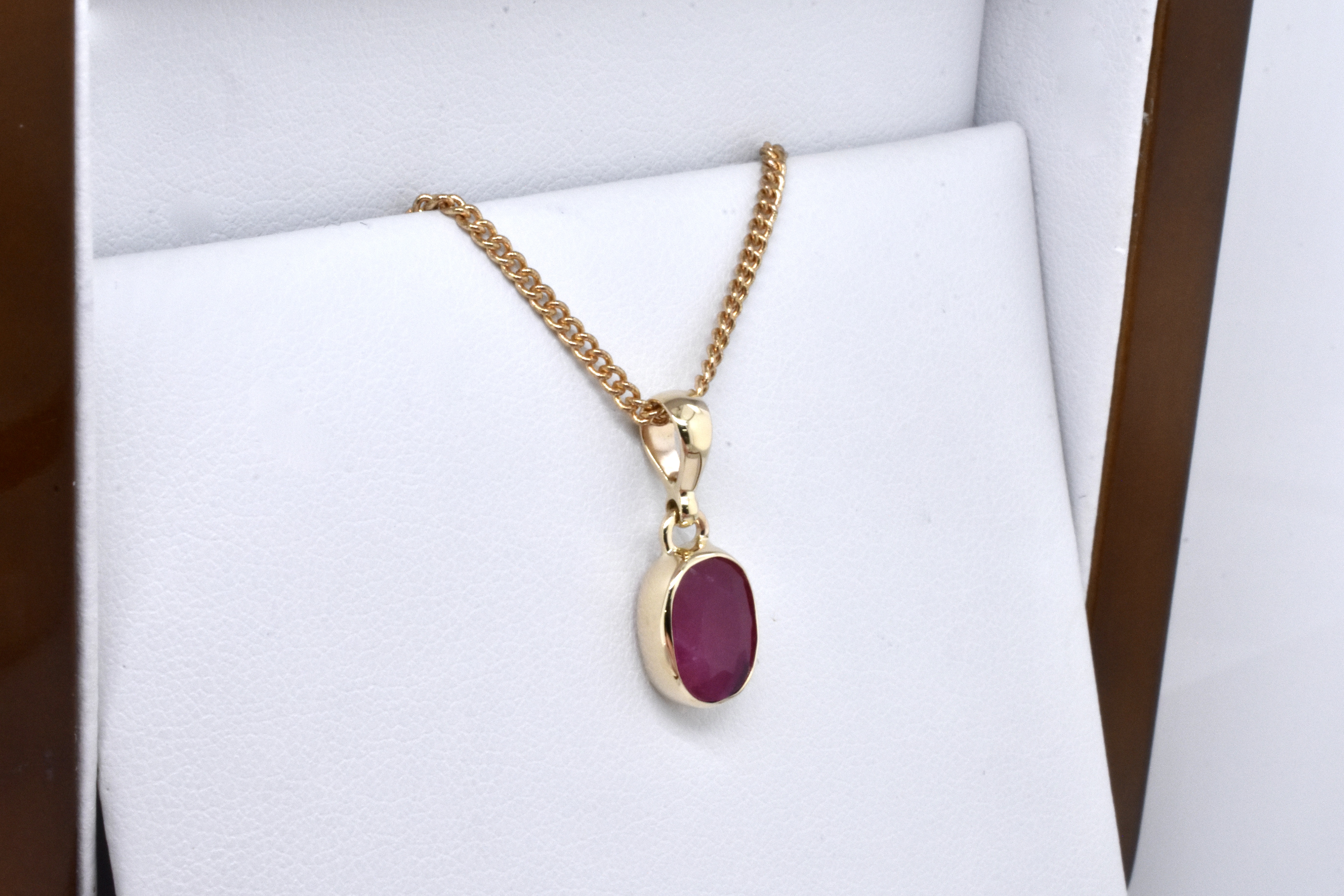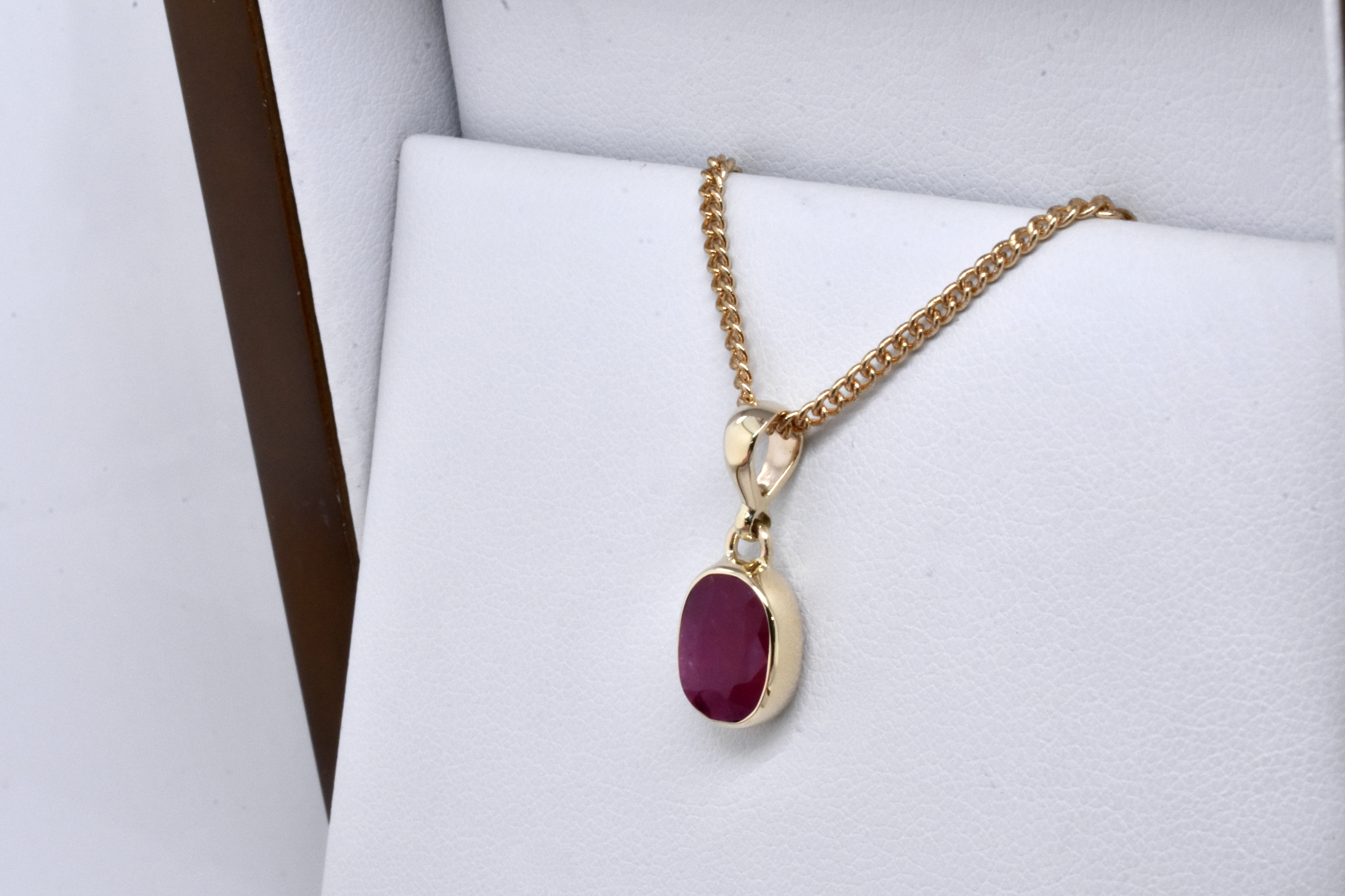 A lovely handmade pendant in 9ct yellow gold with an approx. 10 x 8mm oval natural ruby (heated), bezel set with a plain tapered bail. Chains available for separate purchase.