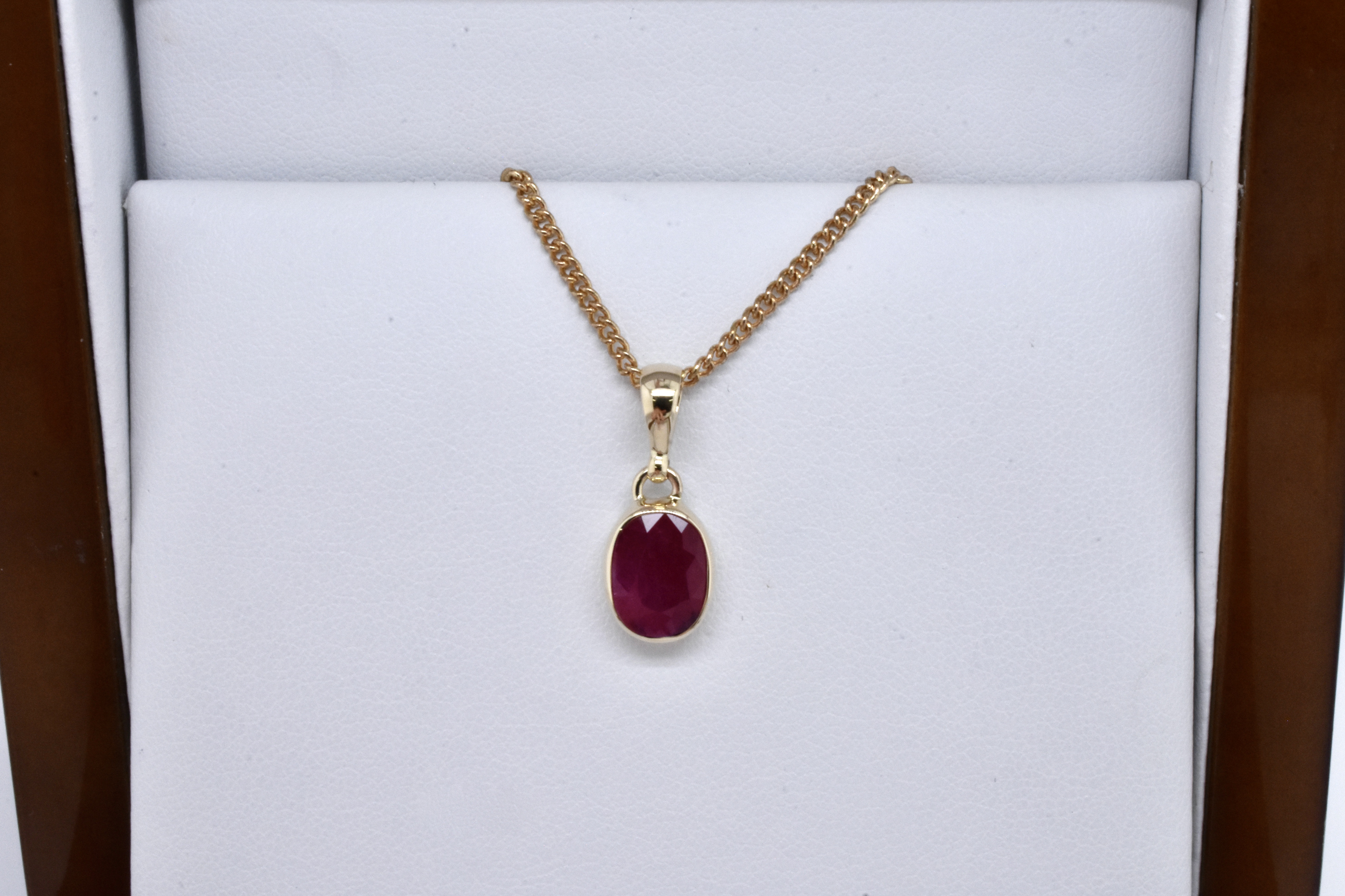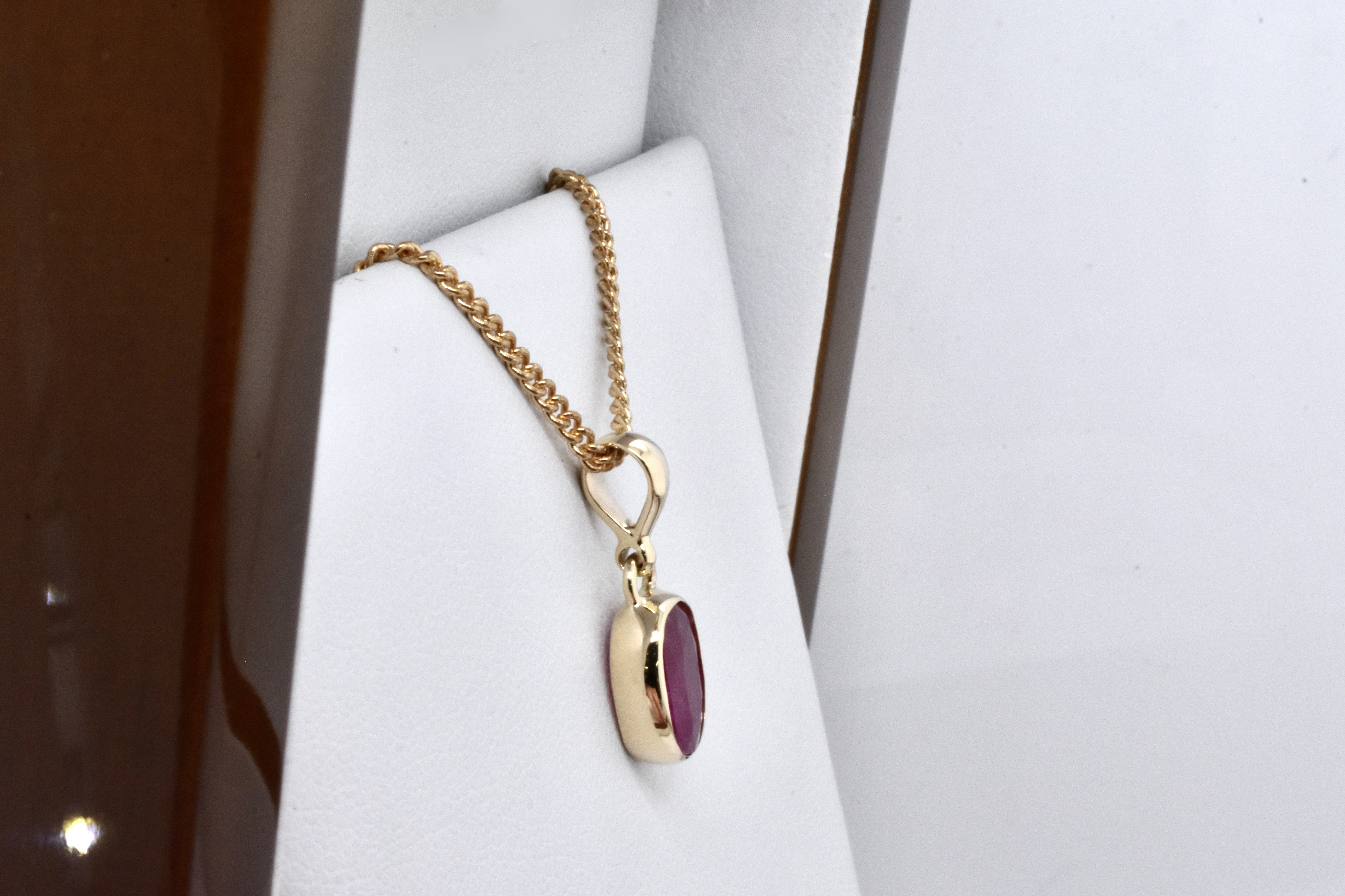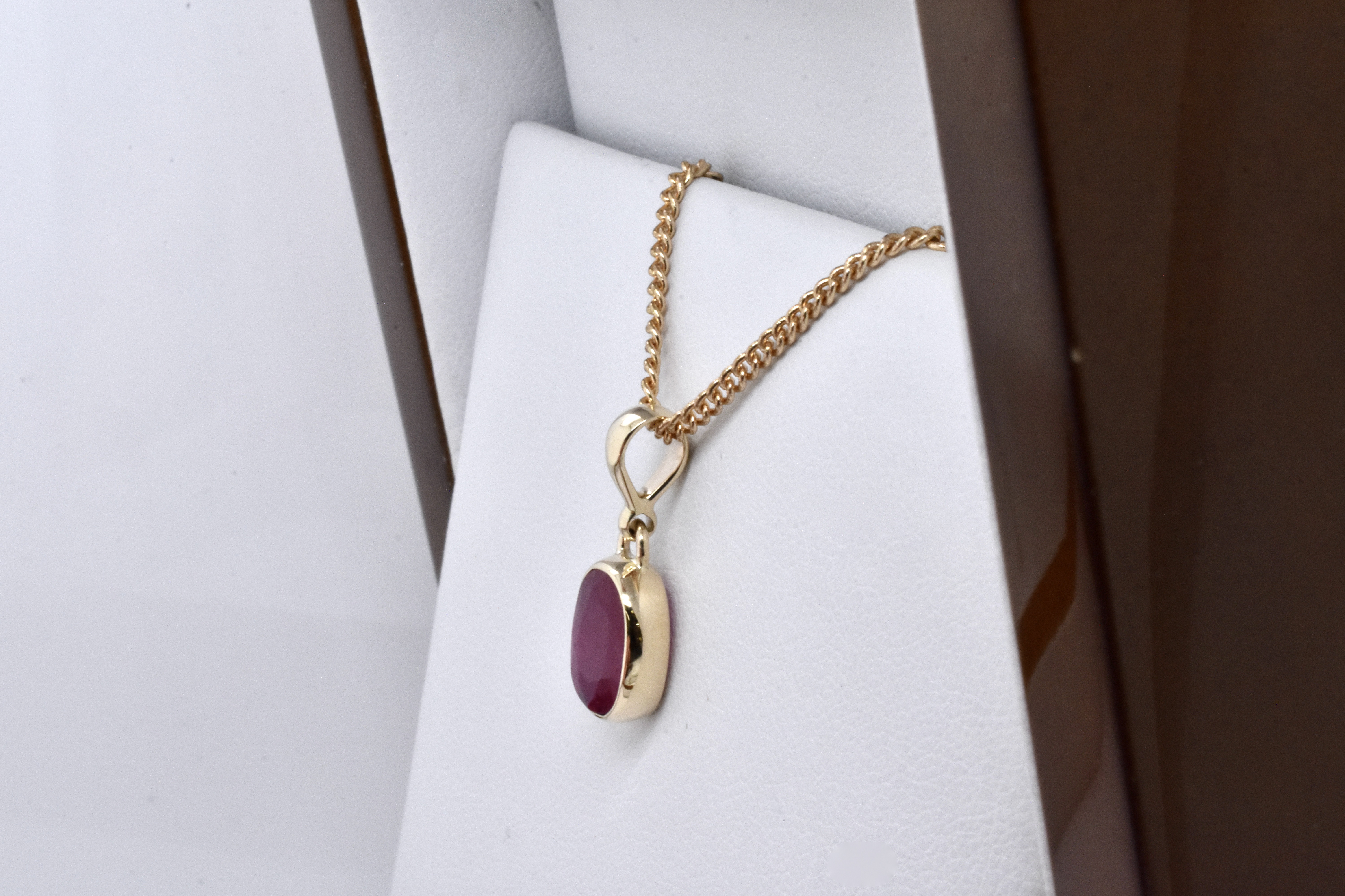 A lovely handmade pendant in 9ct yellow gold with an approx. 10 x 8mm oval natural ruby (heated), bezel set with a plain tapered bail. Chains available for separate purchase.