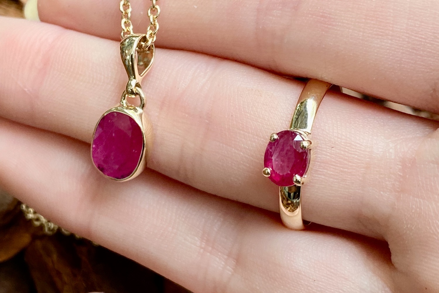 Pictured in natural light with handmade 9ct yellow gold oval ruby east/west ring (20335403) available for seperate purchase.