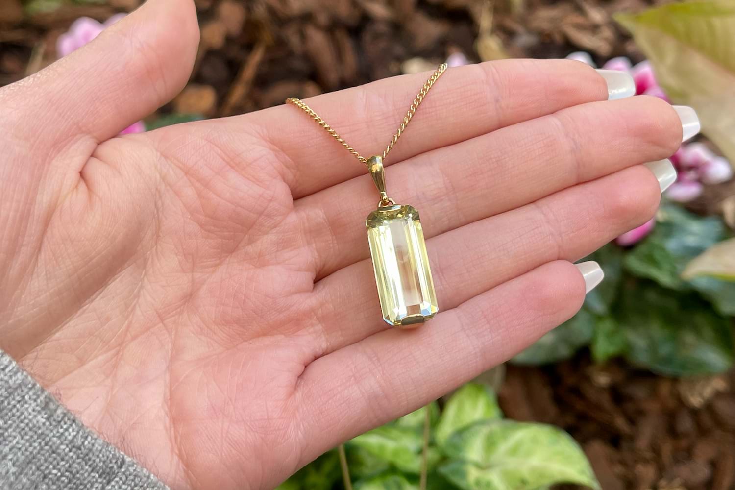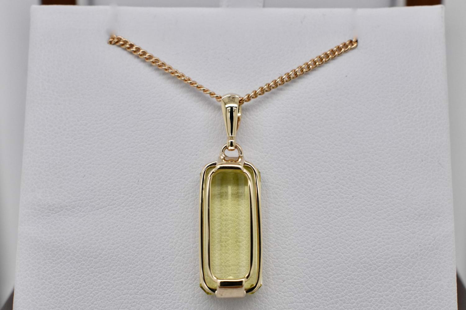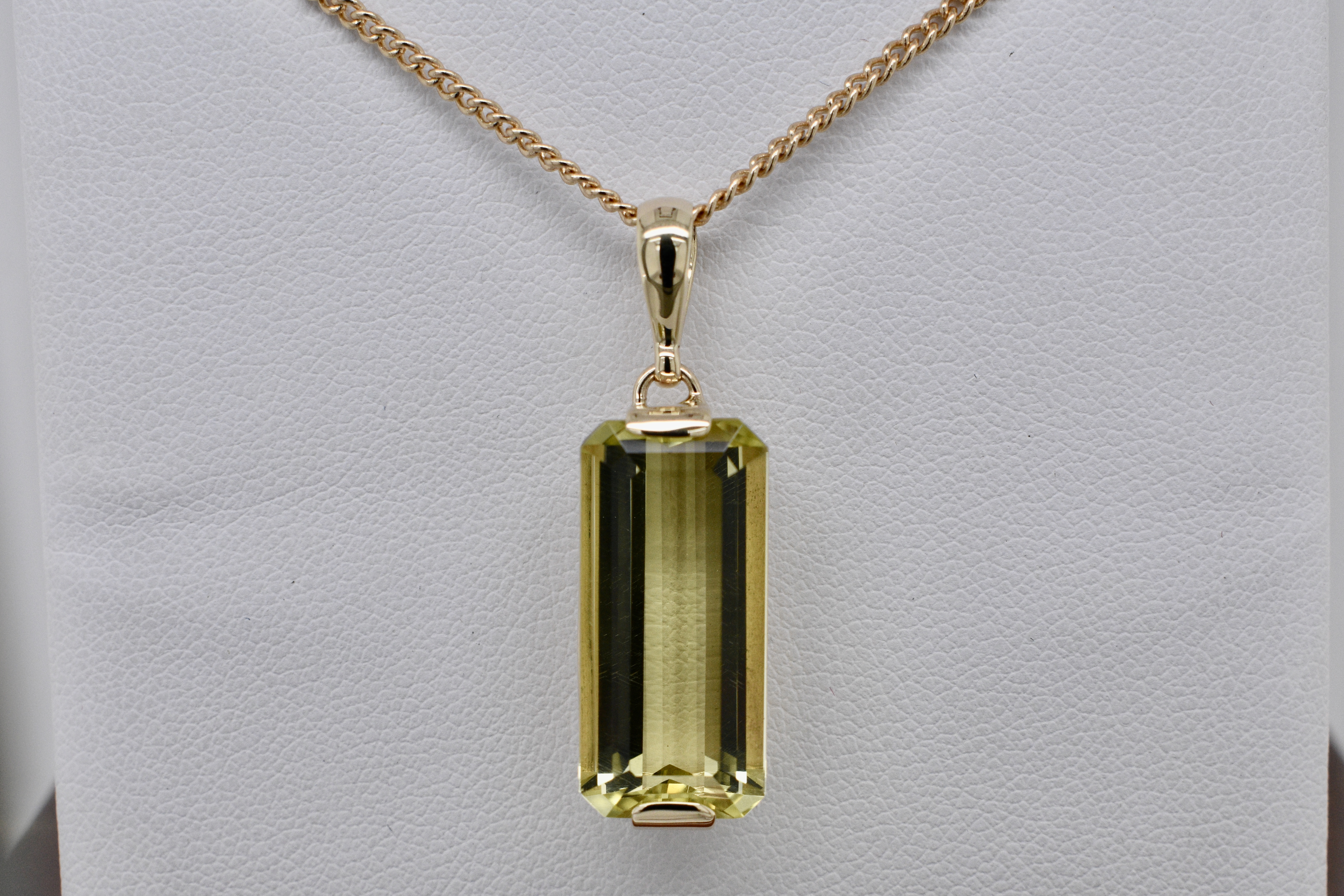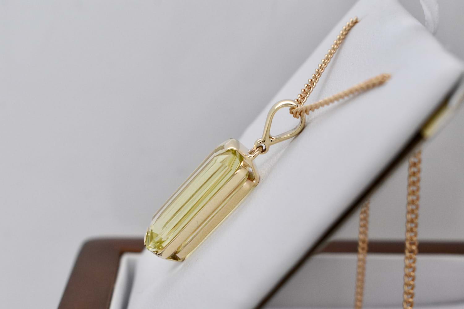 Stunning elongated emerald cut lemon quartz measuring approx. 23x10mm set into a handmade 9ct yellow gold semi bezel set with a plain bale. Chains are available for separate purchase