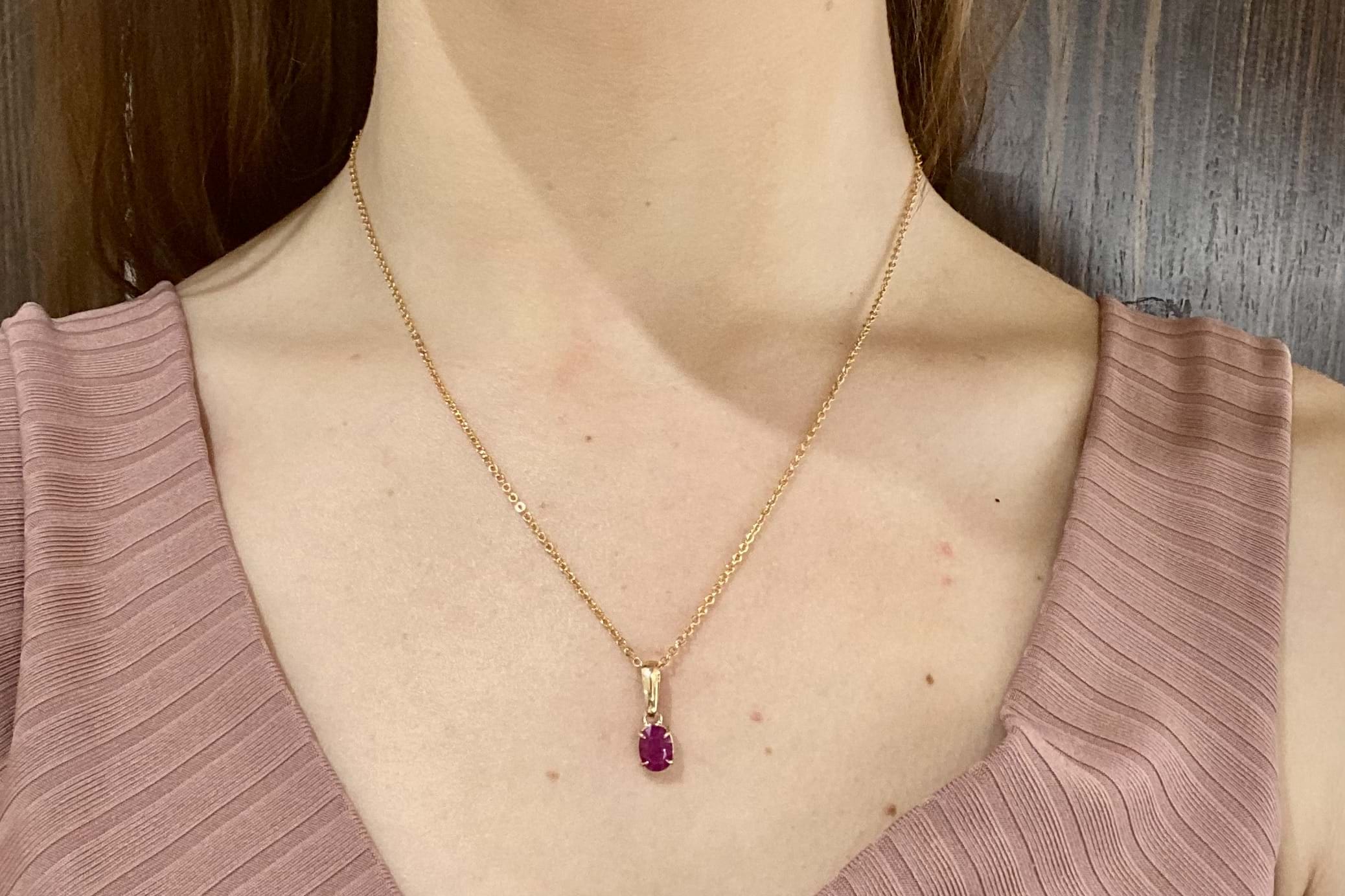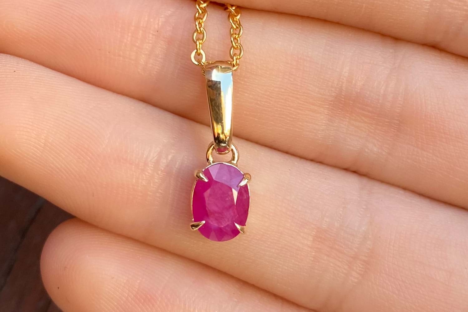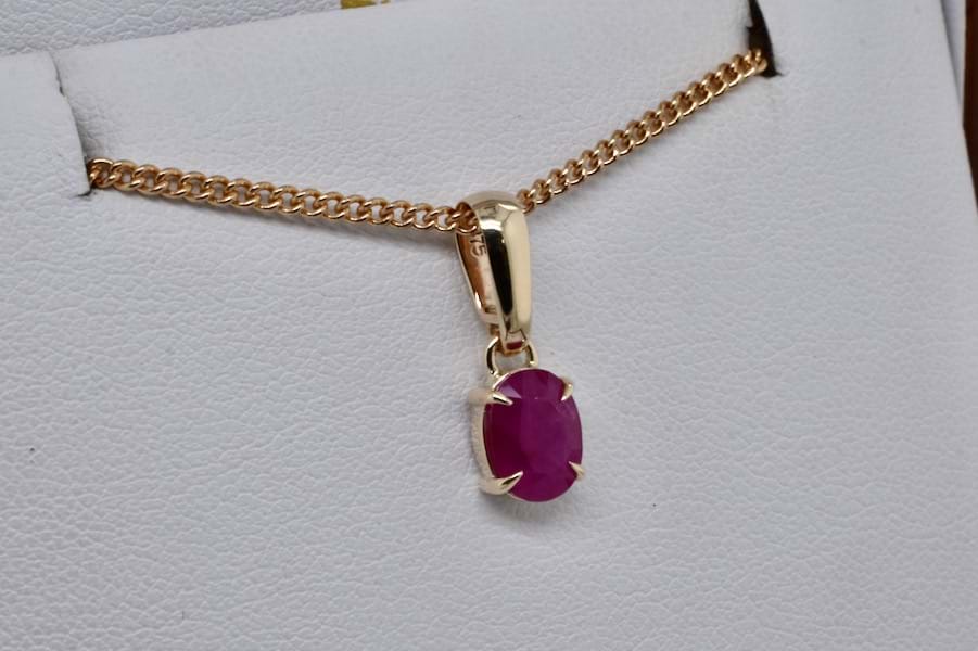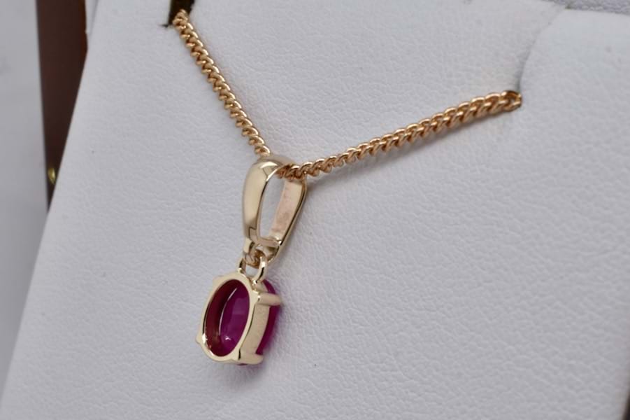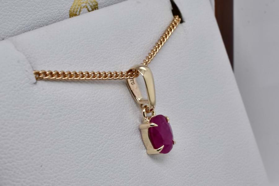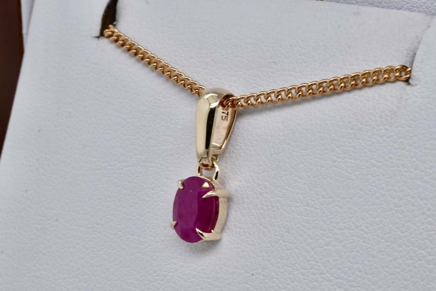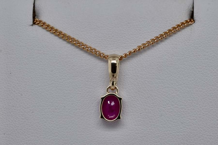 An elegant piece, this handmade 9ct yellow gold pendant features a single oval shape ruby measuring approx. 8 x 6mm with beautiful pinkish tones, in four fine talon claws with a plain bail. Chains available for separate purchase