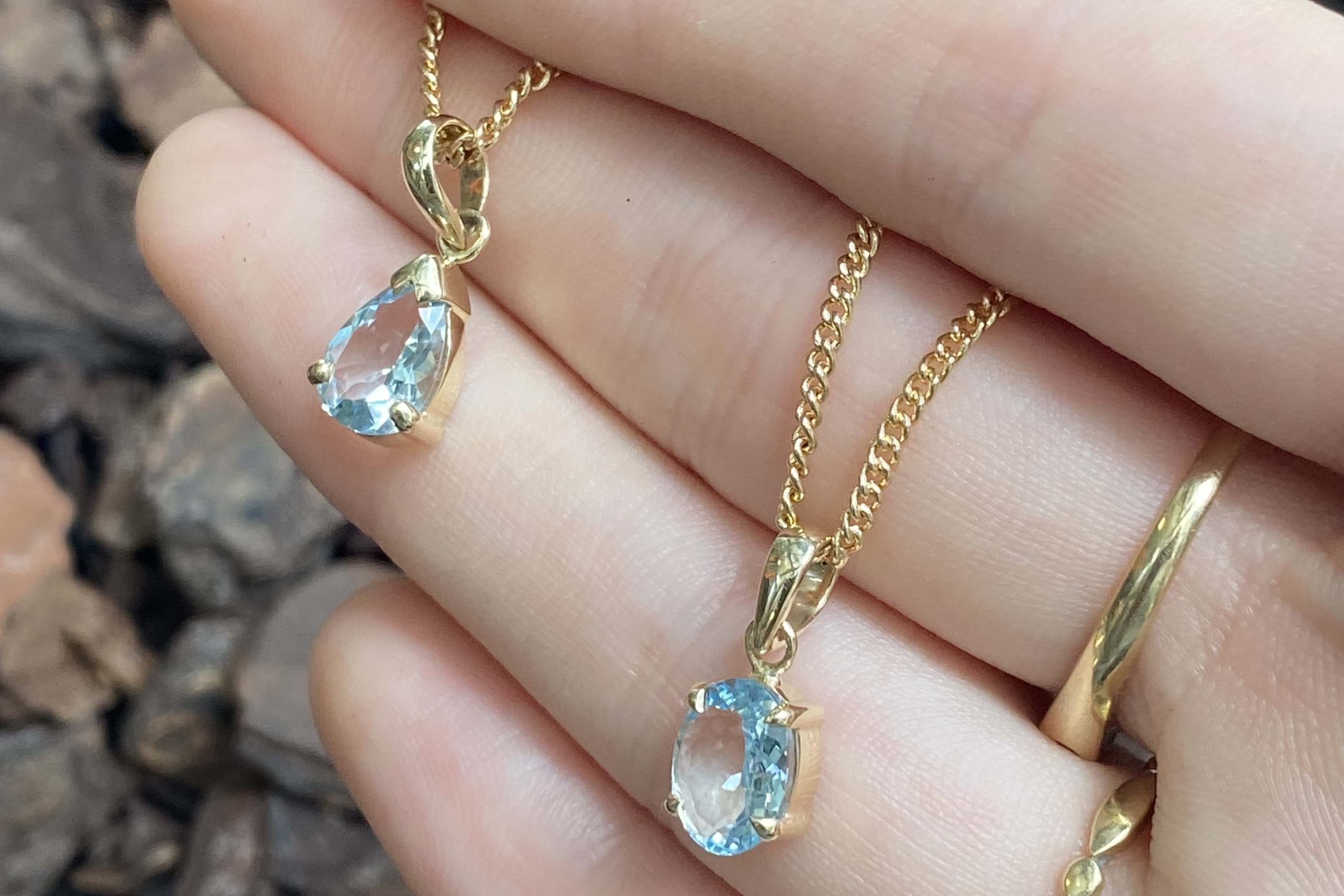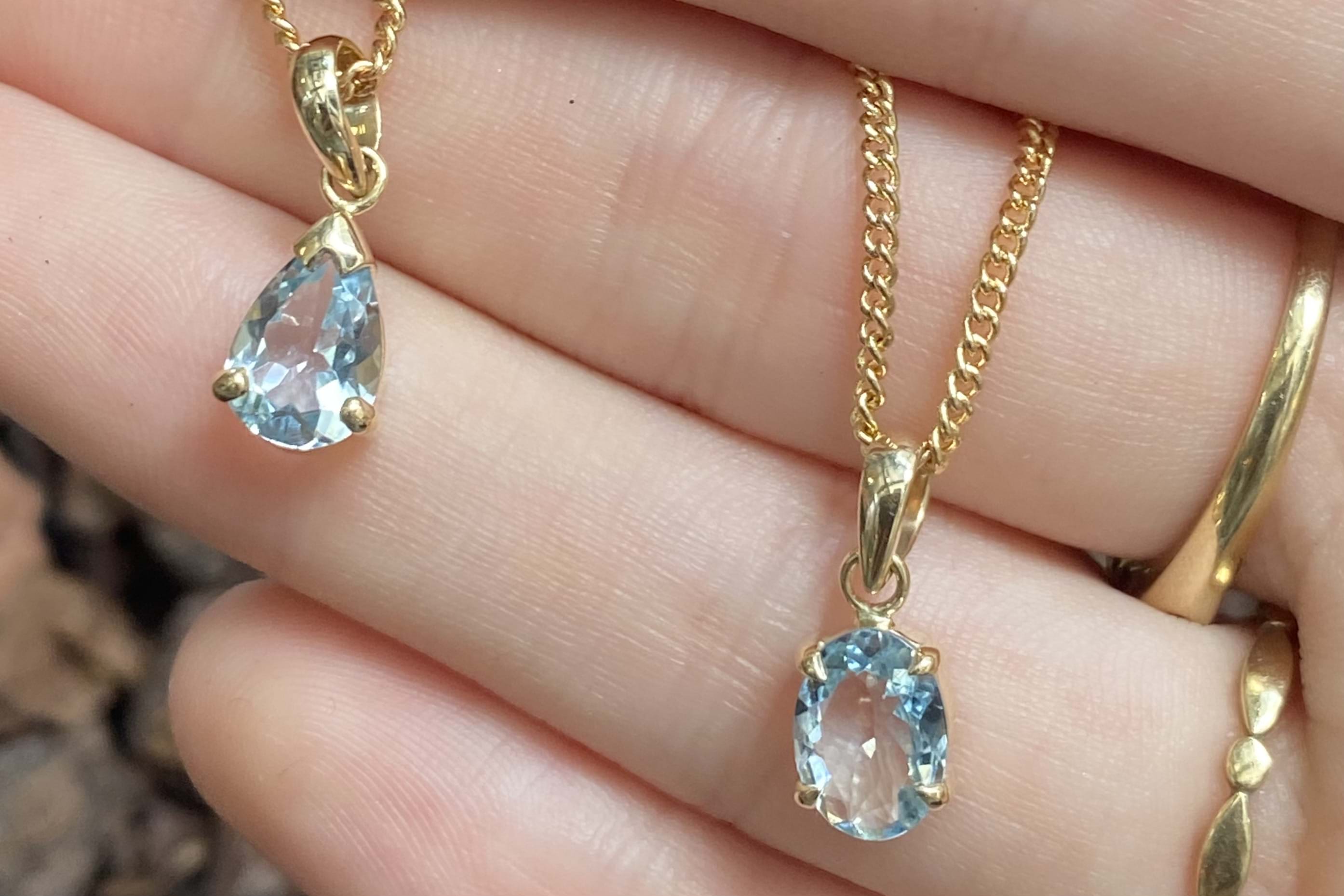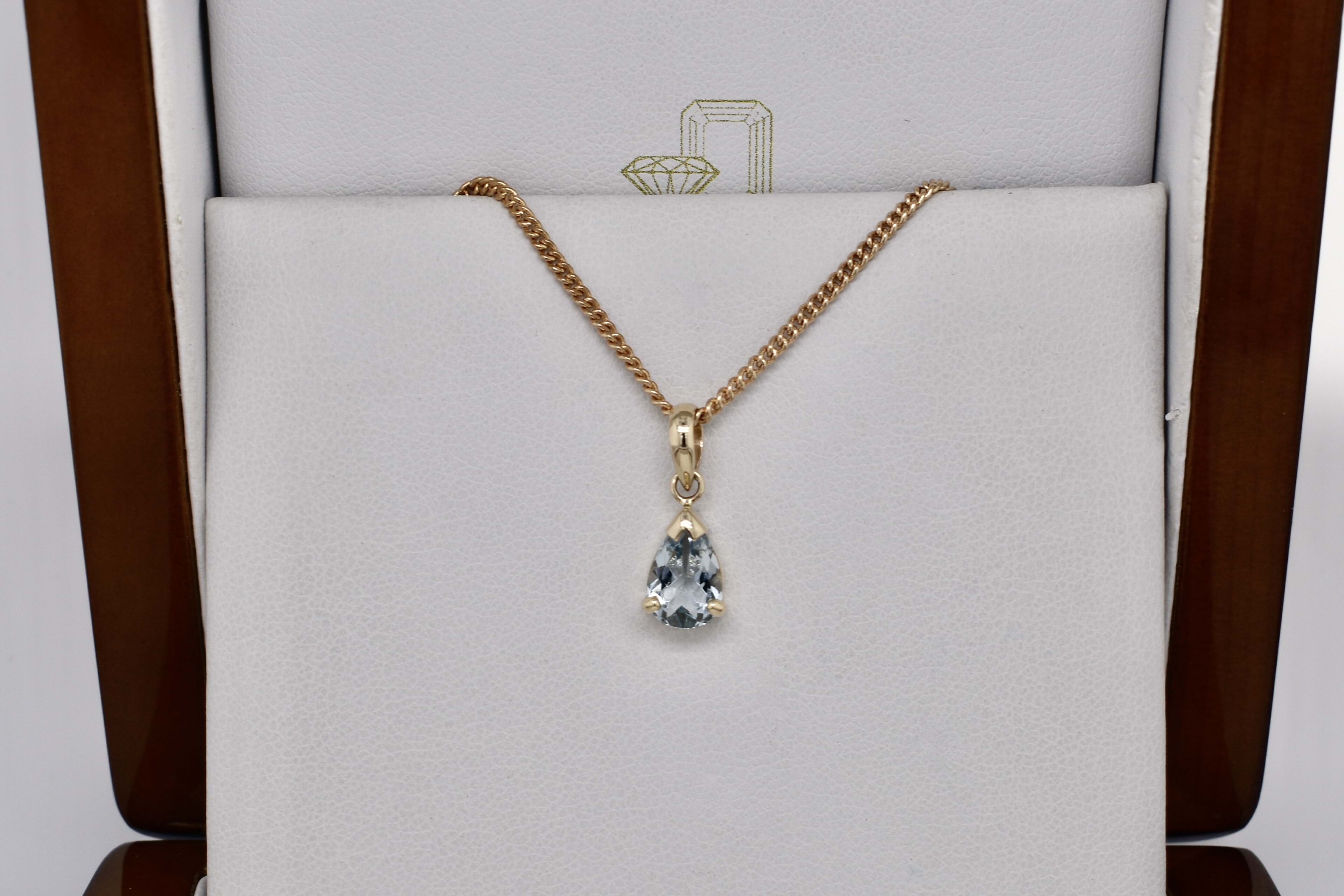 A pretty pearshape aquamarine measuring approx. 9.7x6.8mm set in a handmade 9ct yellow gold cap and two claw setting with a plain pendant bale. Chains are available for separate purchase.