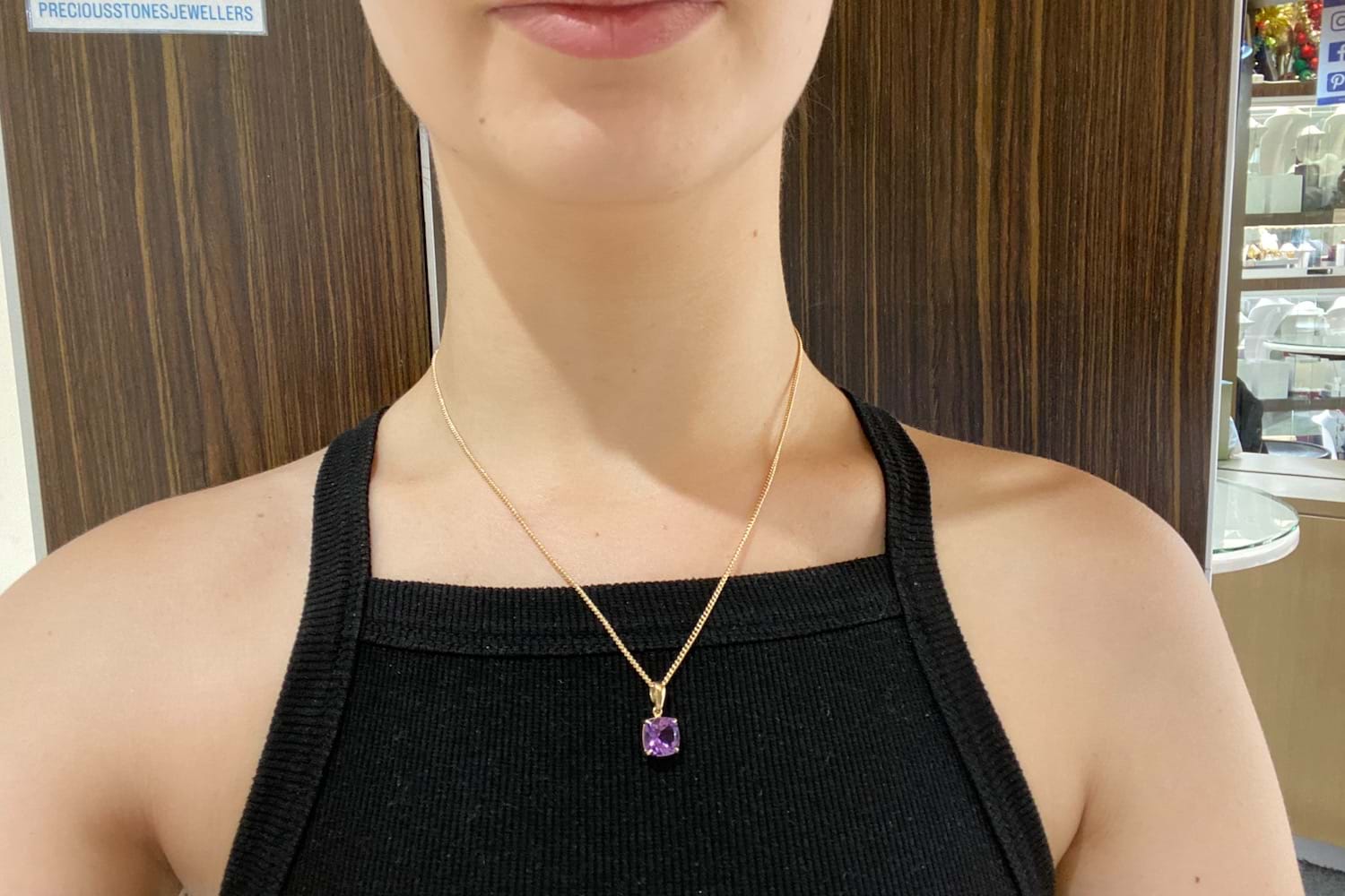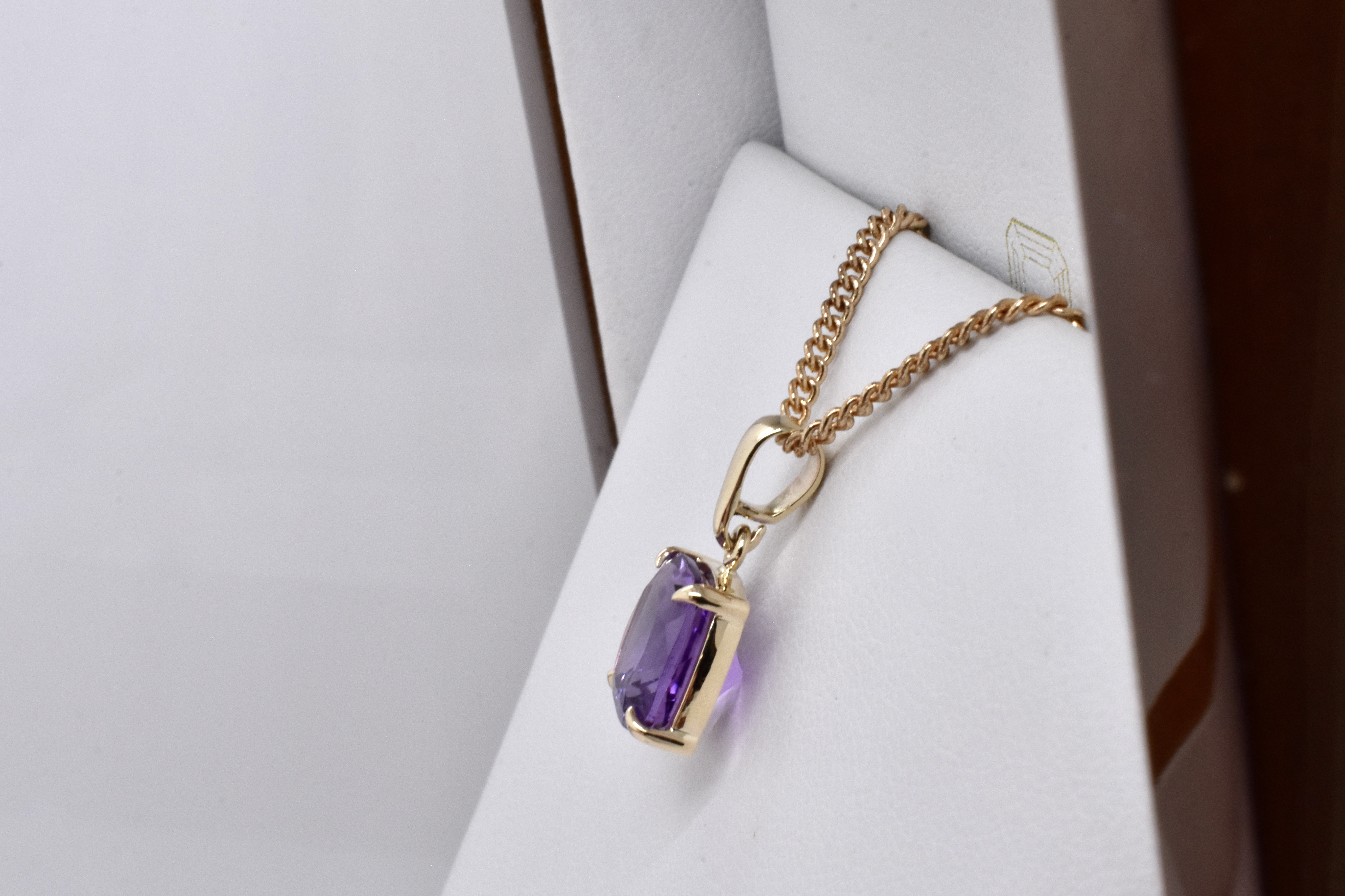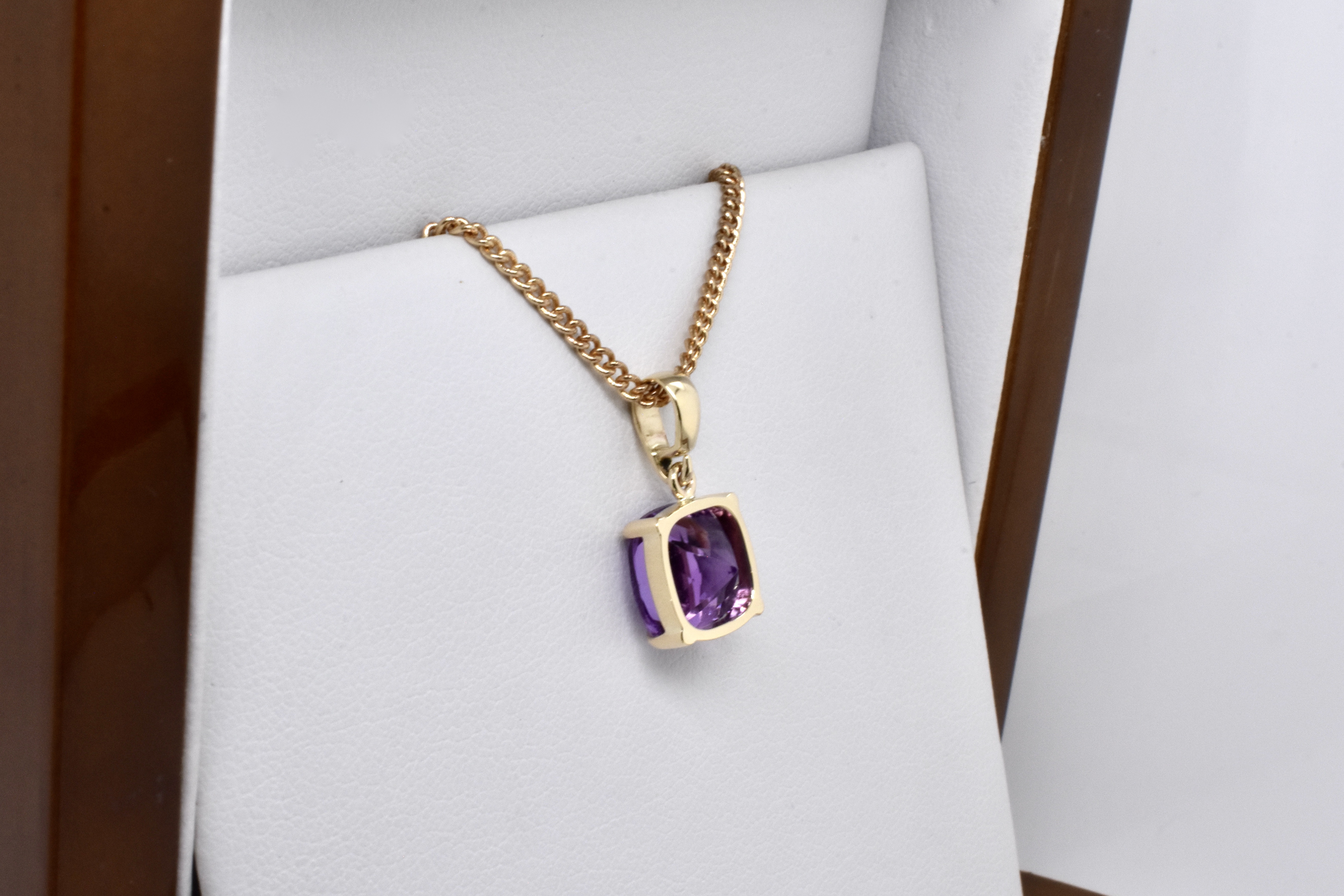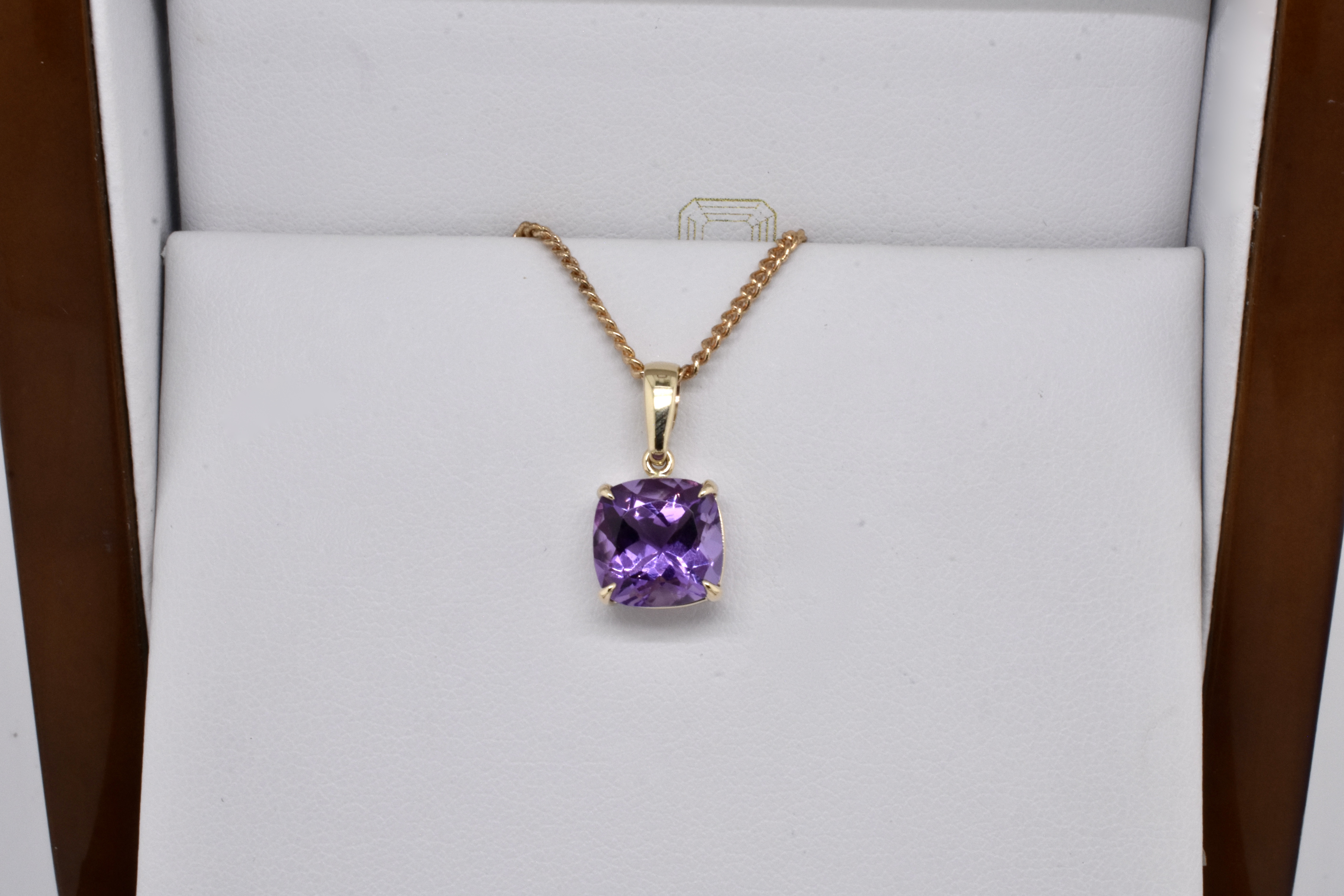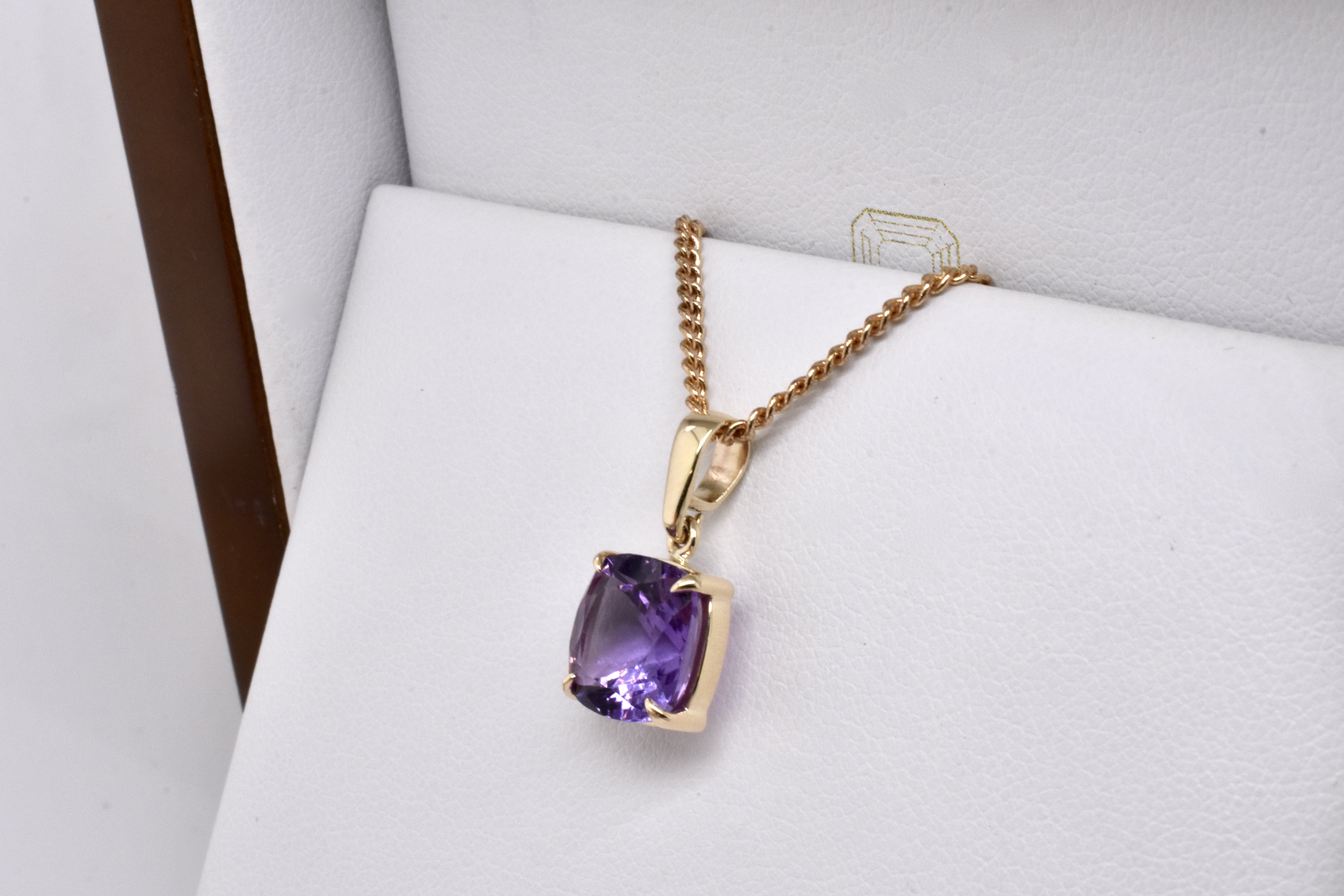 This lovely pendant is handmade in 9ct yellow gold and is set with an approx. 9mm cushion amethyst 4 claw set with plain bail. Chains available for separate purchase