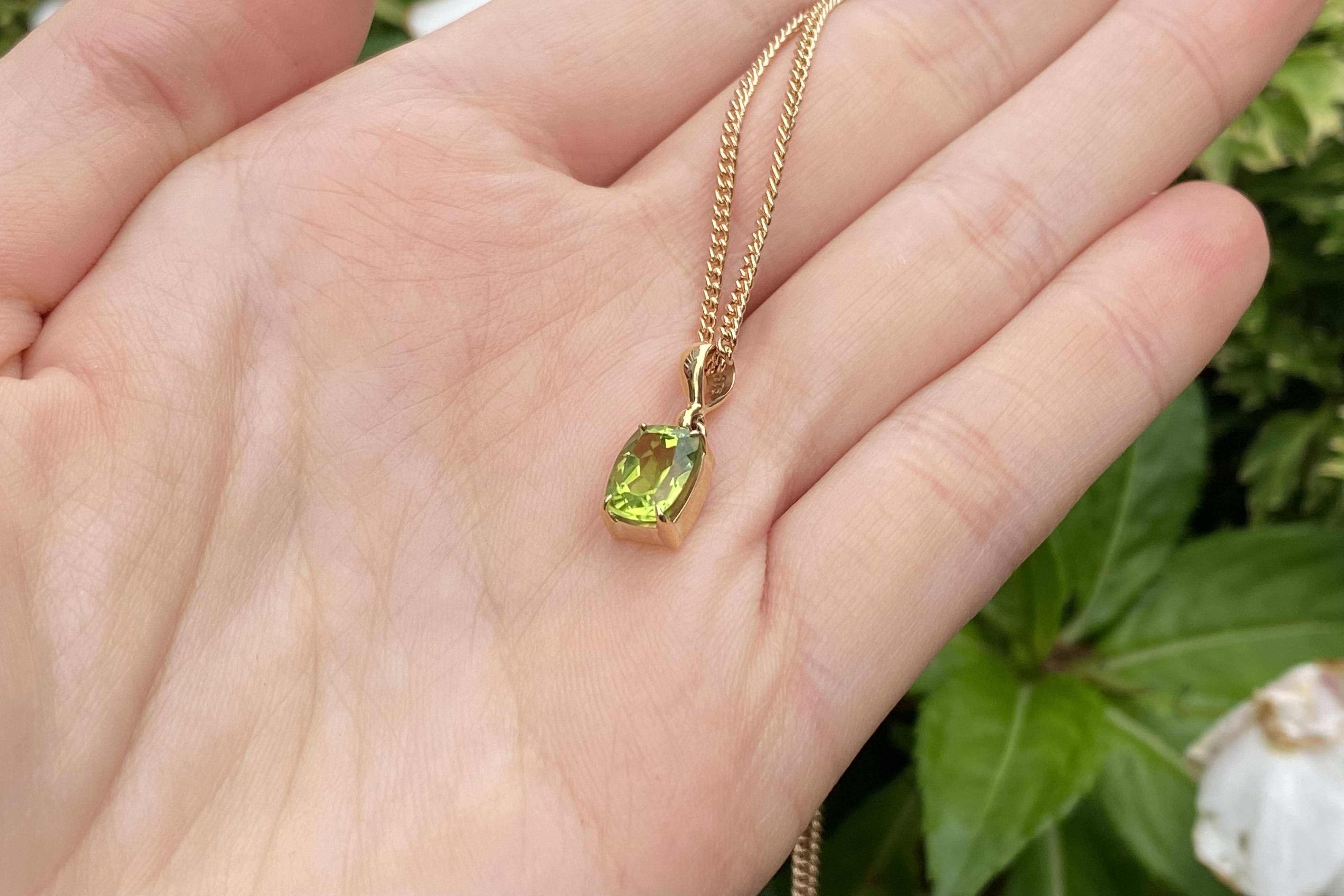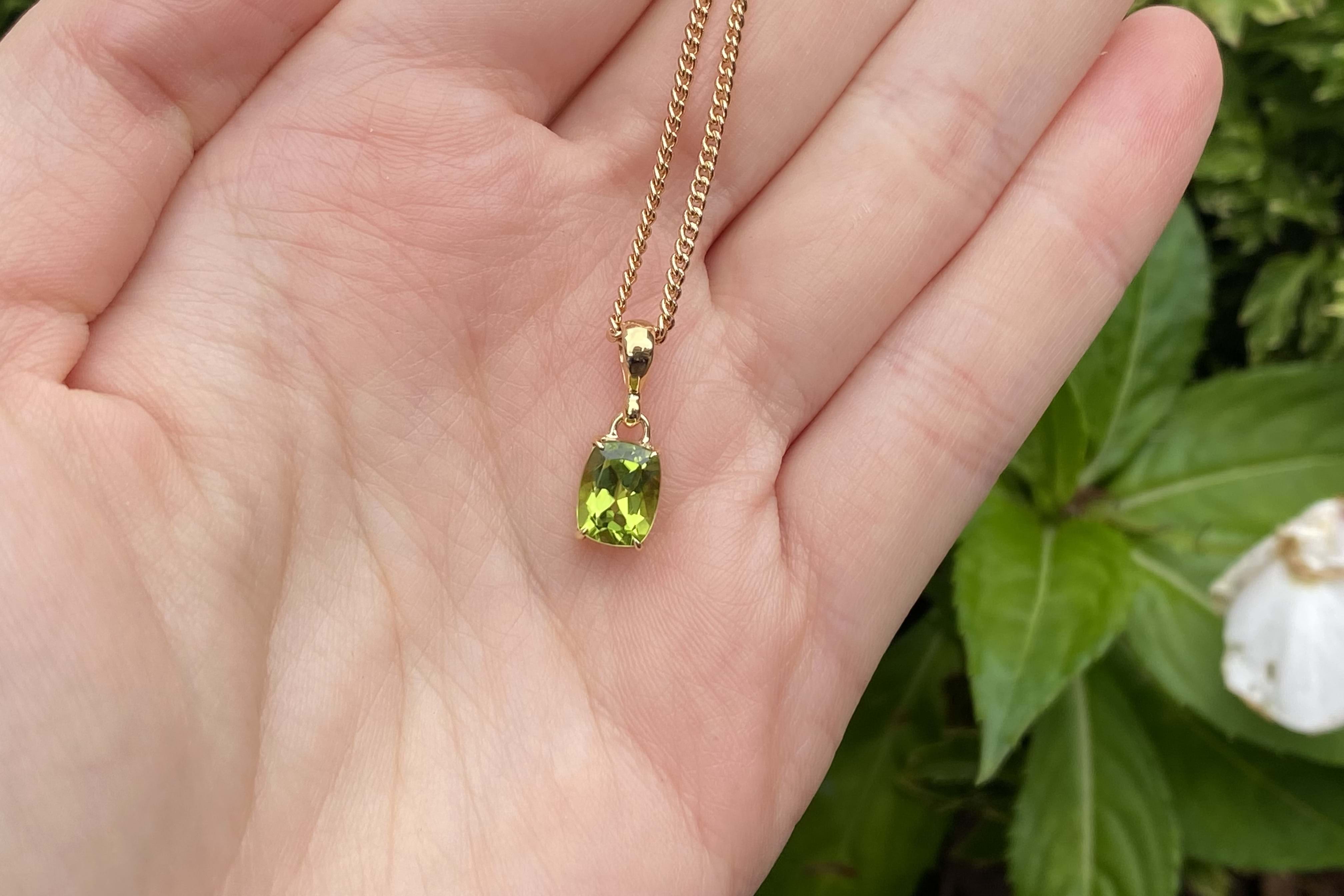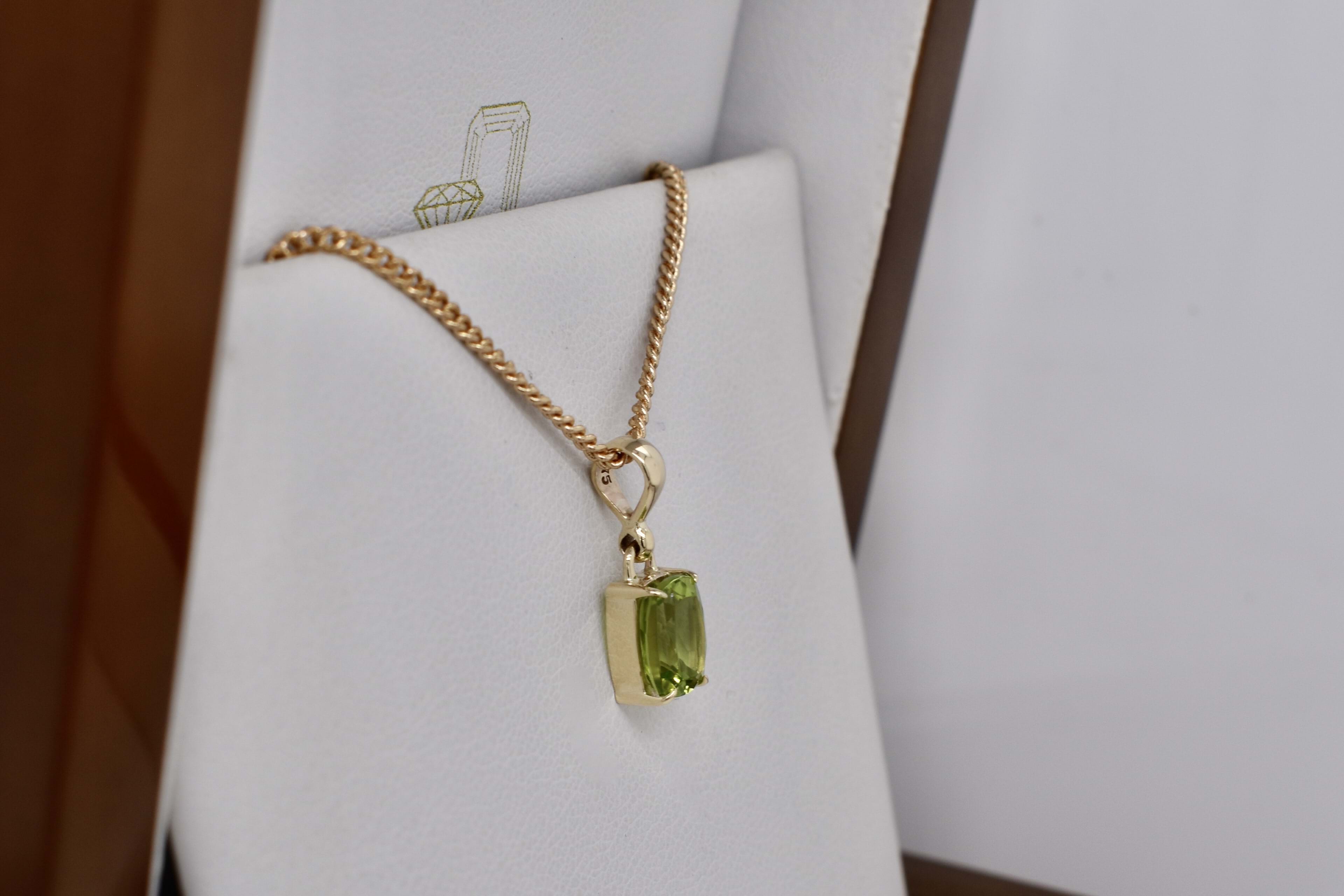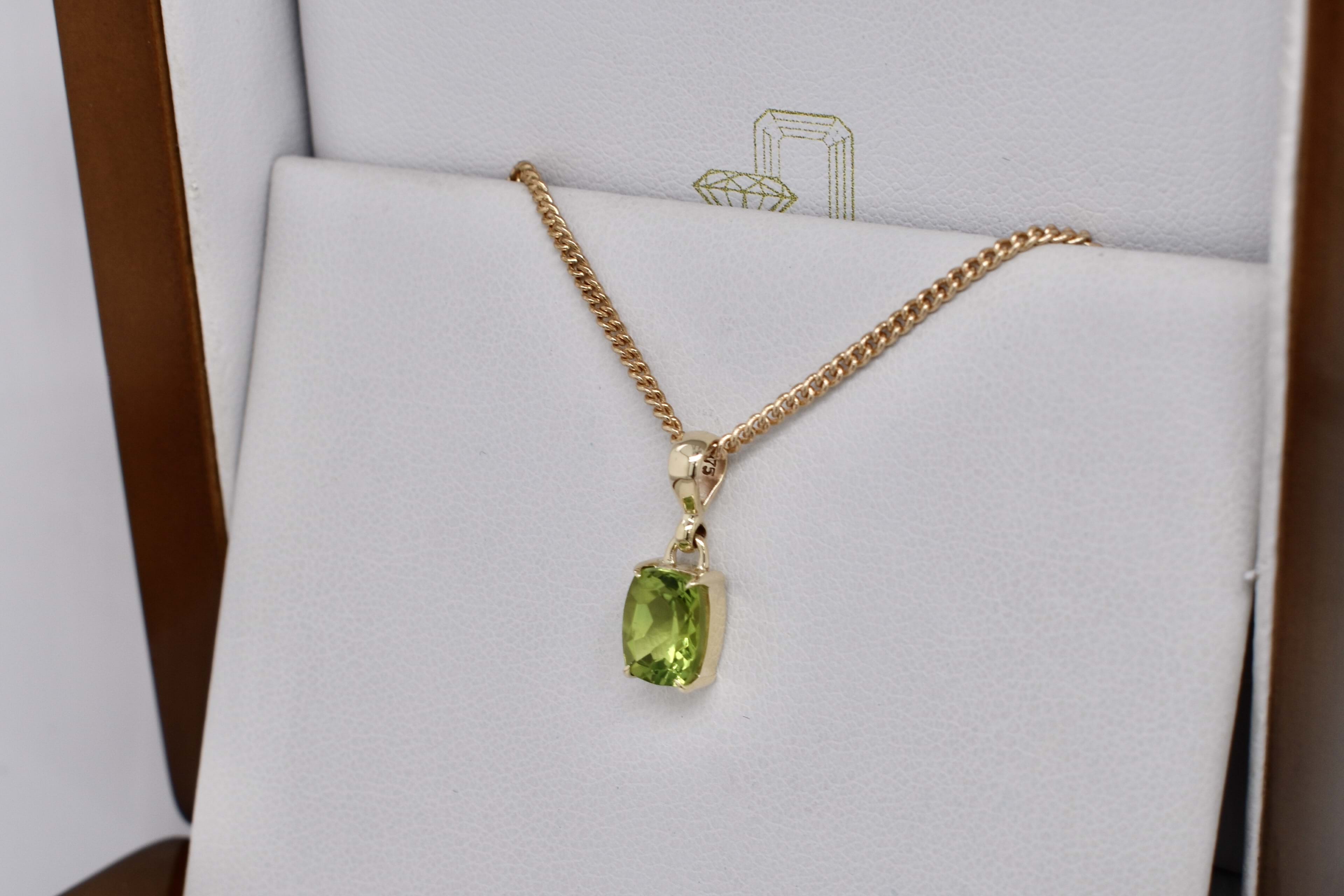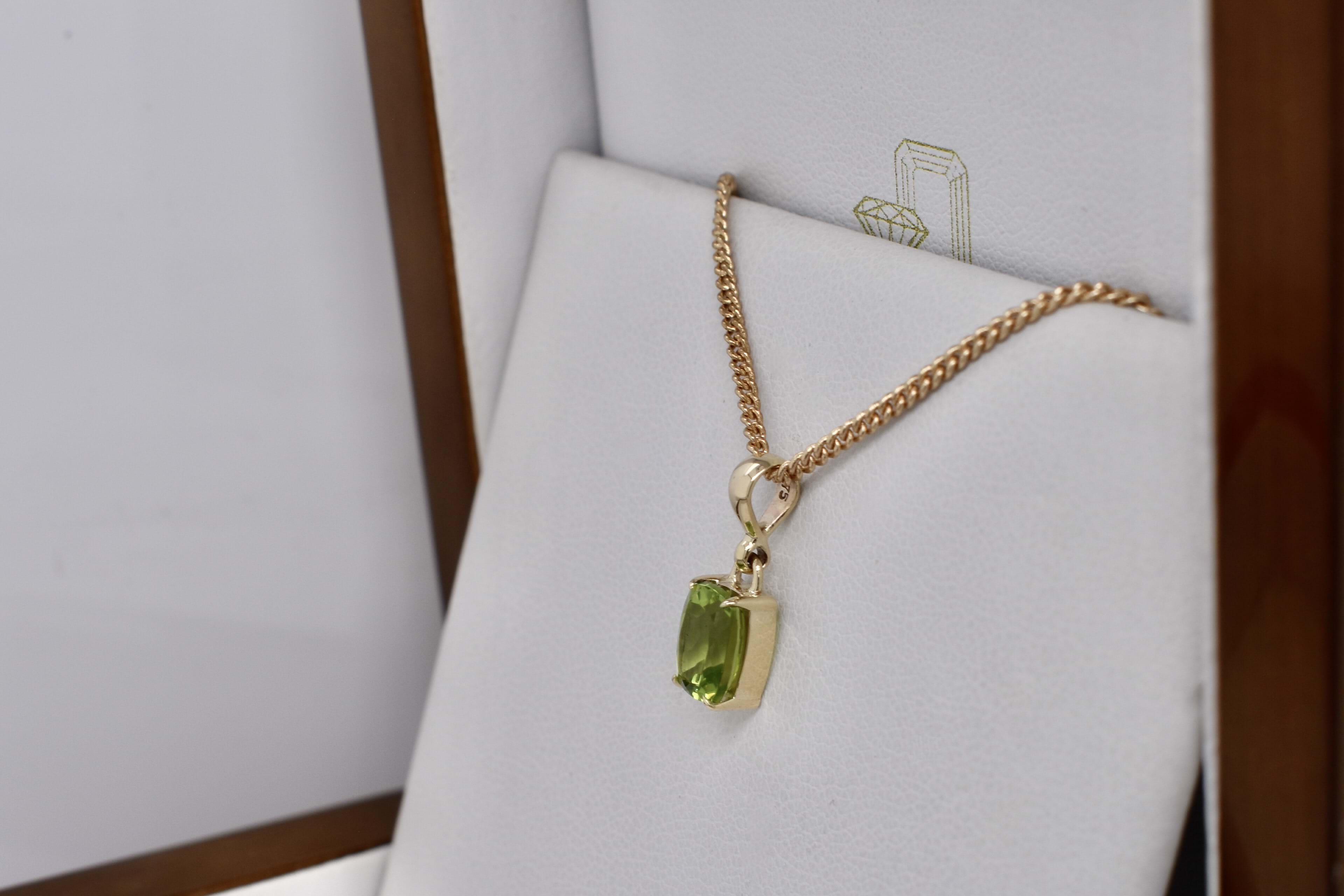 A stunning cushion shaped peridot pendant, four claw set, in 9ct yellow gold. This handmade pendant measures 8.1x6.1mm and is completed with a plain gold bale. Chains available for separate purchase.