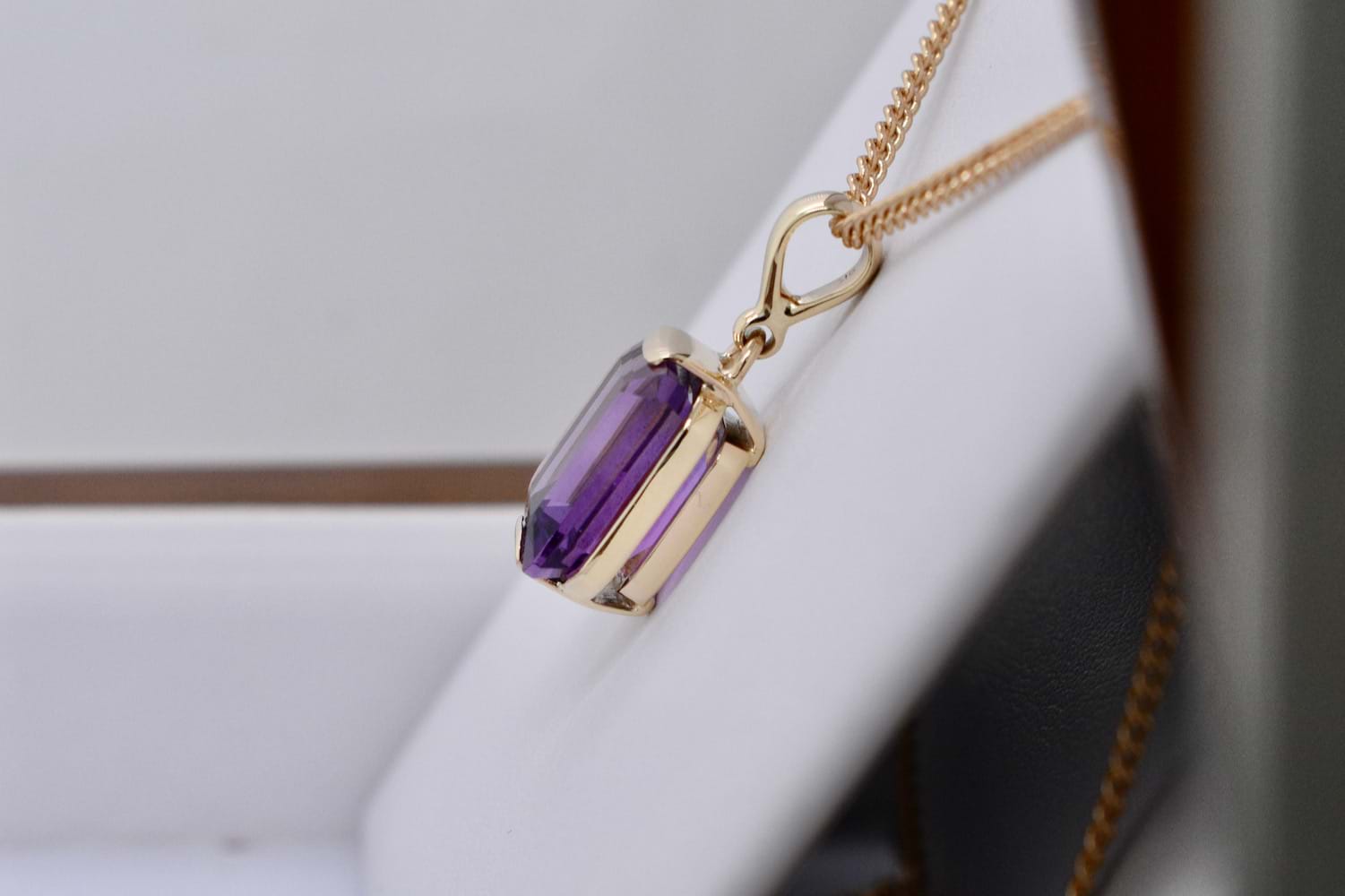 A stunning 15x10mm emerald cut amethyst in a mid-dark colour semi-bezel set in a handmade 9ct yellow gold pendant setting with a plain bale. Chains are available for separate purchase