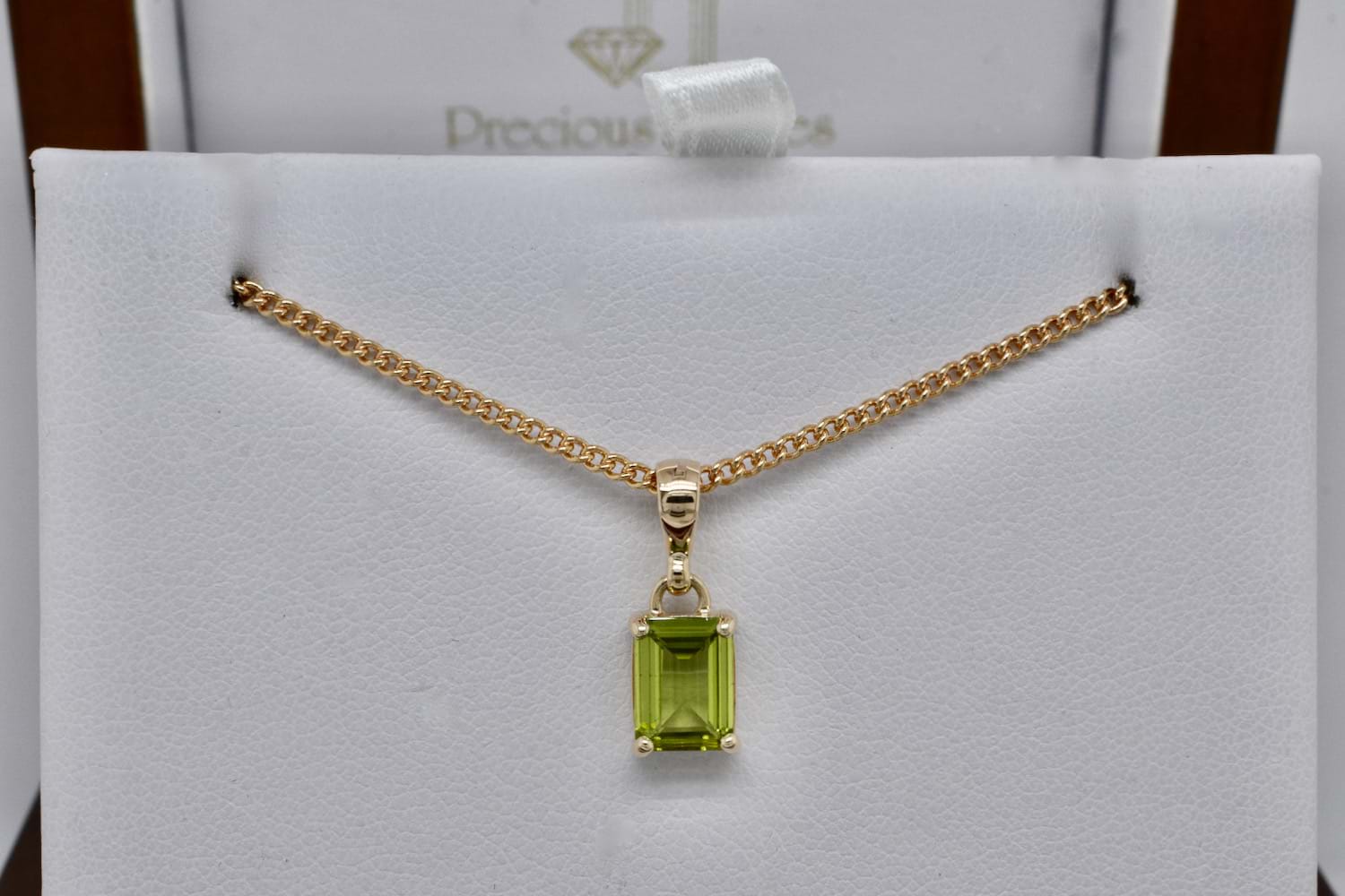 Simple handmade 9ct yellow gold pendant featuring an emerald cut peridot measuring approx. 8.5x6.5mm four claw set with a plain bale. Chains are available for separate purchase