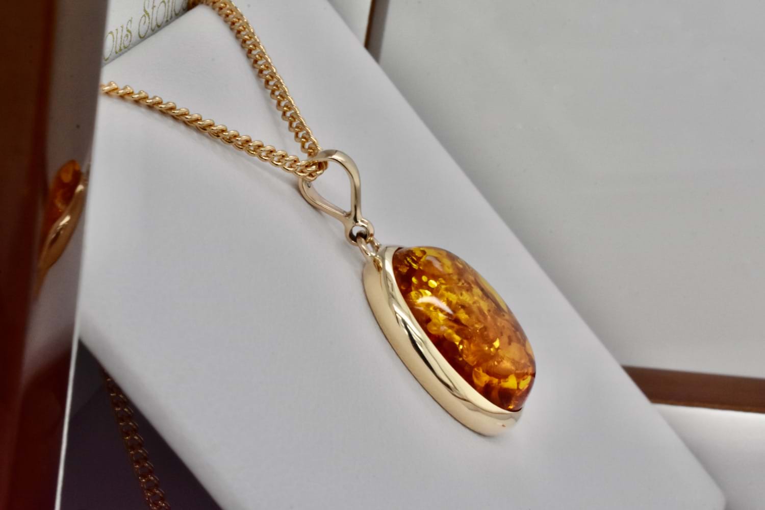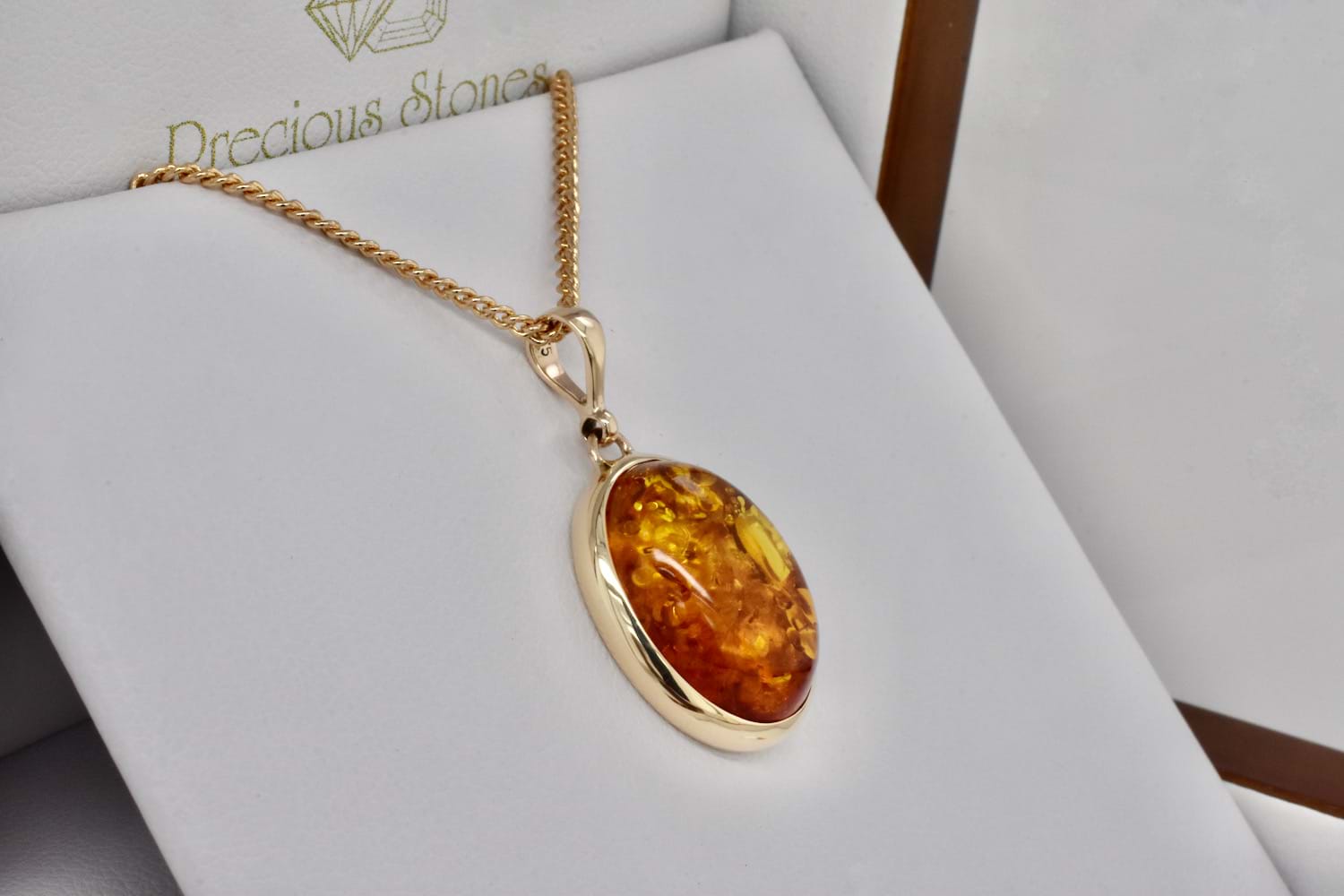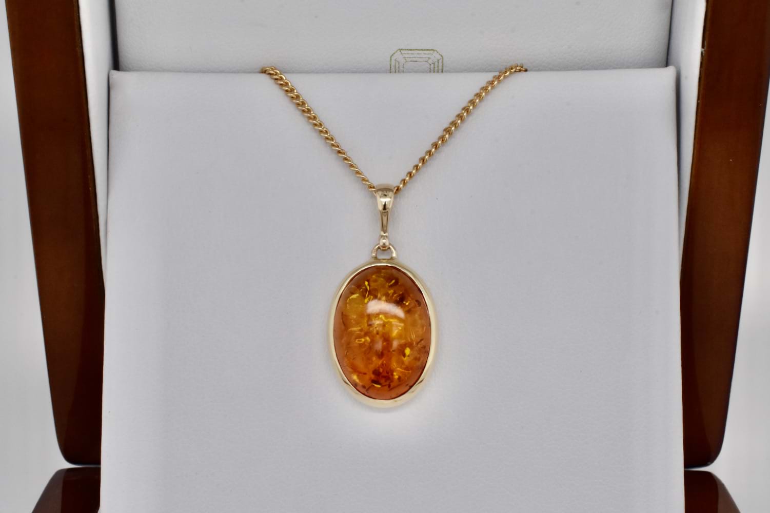 Classic and timeless handmade 9ct yellow gold bezel set pendant featuring an oval piece of Baltic amber measuring approx. 17.5x14.9mm with a plain bale top. Chains are available for separate purchase