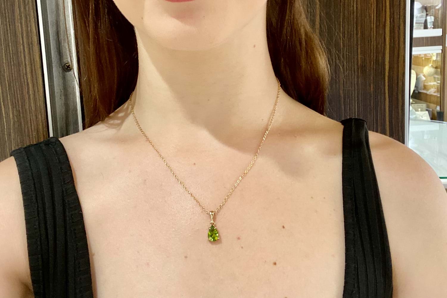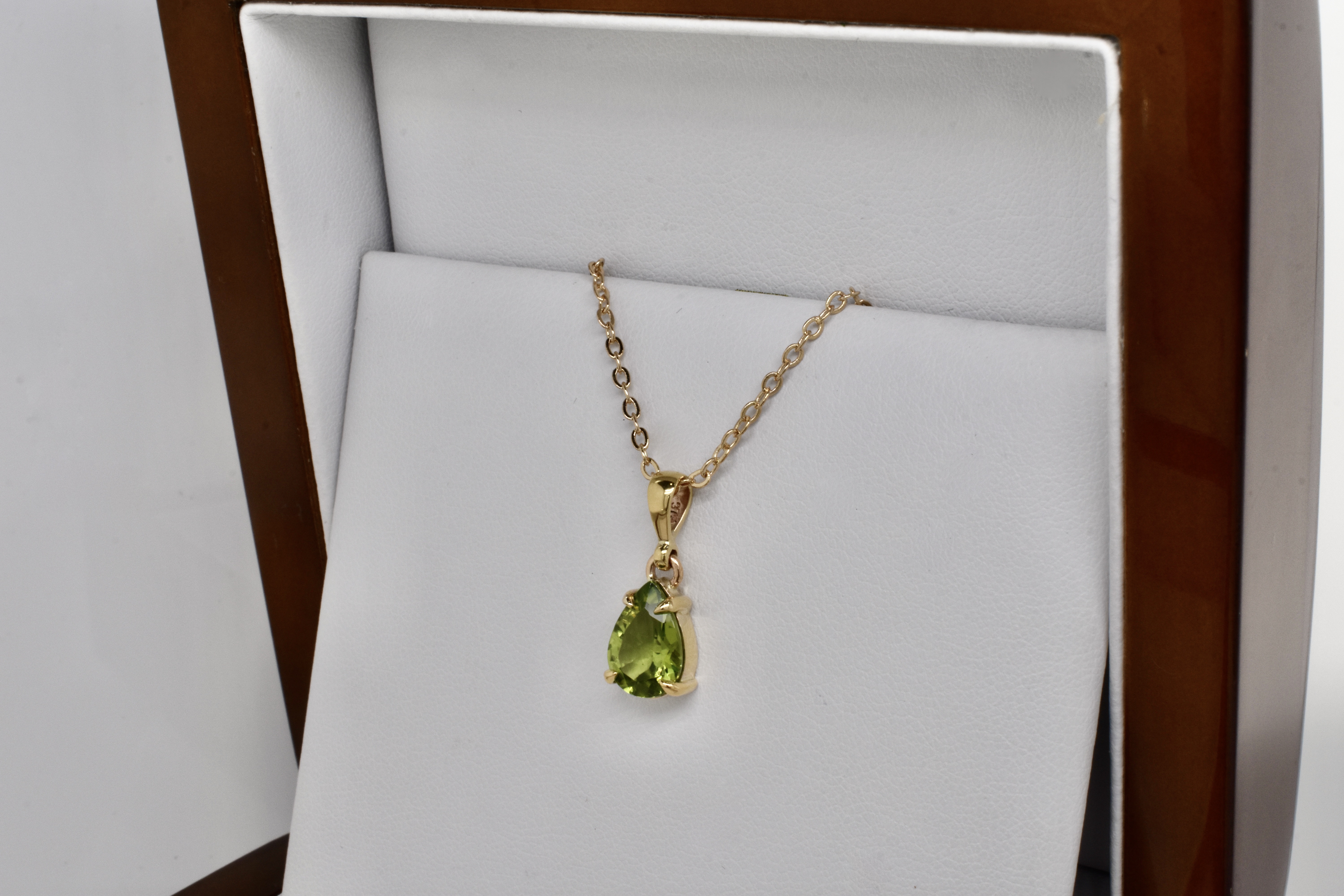This lovely and dainty handmade pendant is crafted in 9ct yellow gold with a bright pear shape peridot measuring approximately 10 x 7.5mm, 4 claw set with a plain bail. Chains available for separate purchase