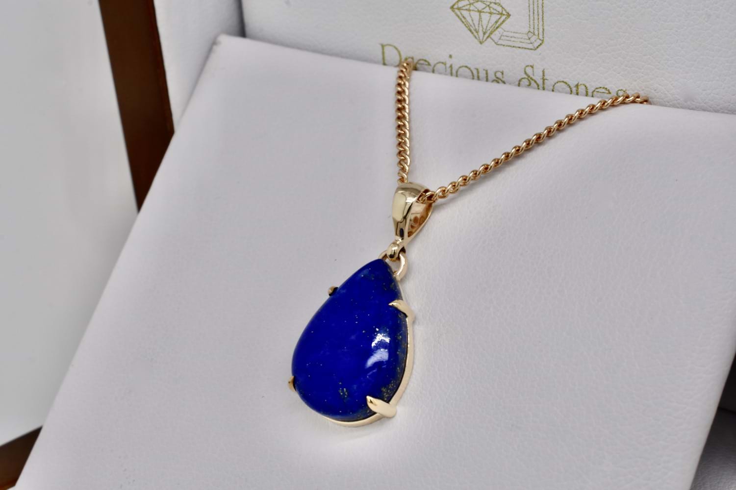Striking pearshape cabochon lapis measuring approx. 18x13mm set into a handmade 9ct yellow gold four claw pendant. Chains are available for separate purchase