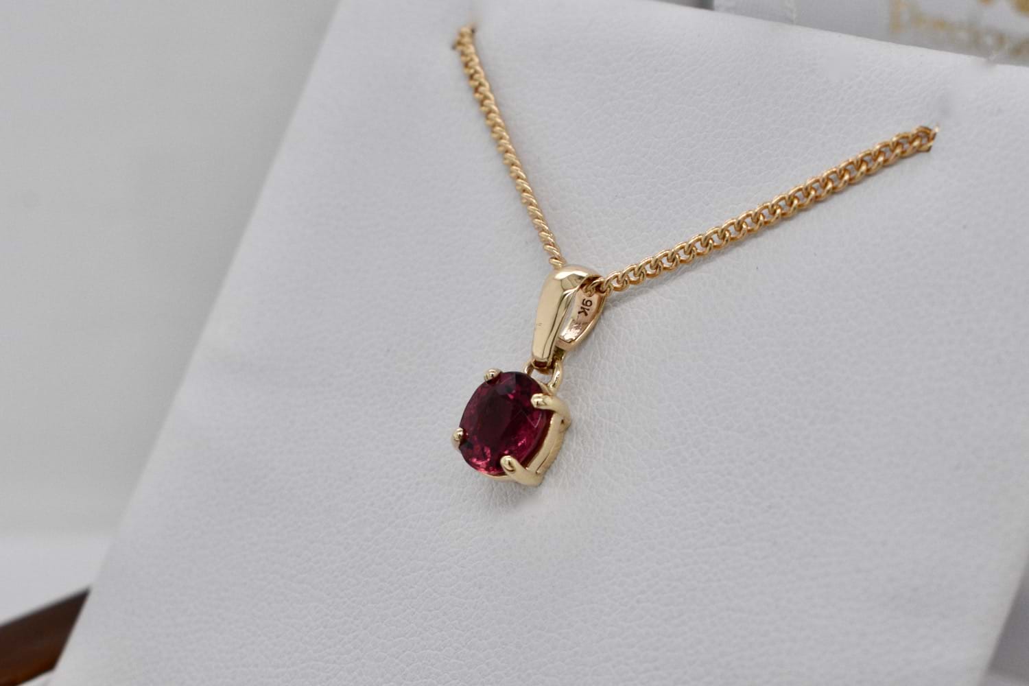 A faceted 5.5mm round dark pink tourmaline set into a simple and timeless handmade 9ct yellow gold four claw setting with a plain bale. Chains are available for separate purchase
