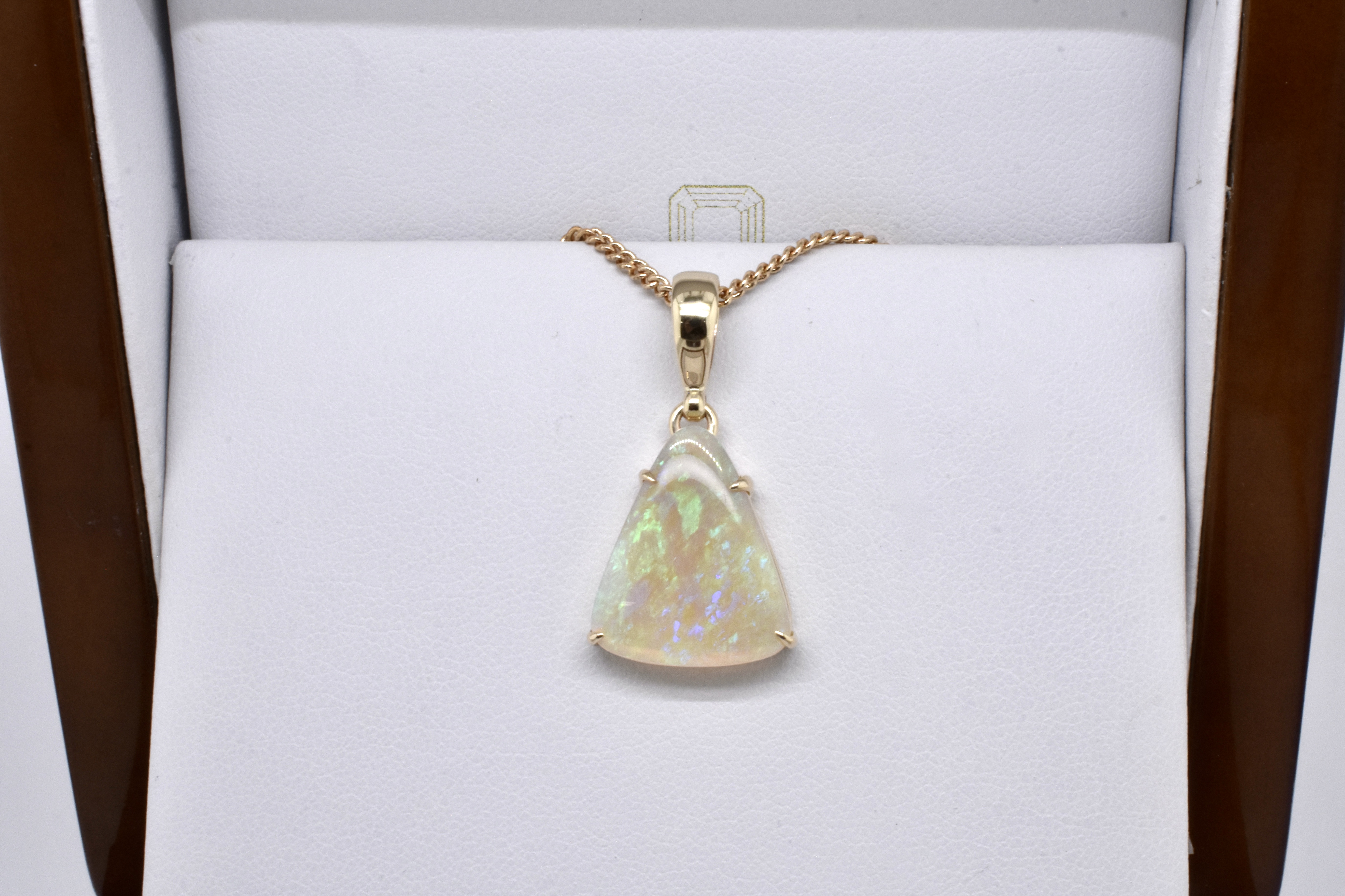 A stunning piece of solid, white Mintabie (South Australian origin) opal in a trilliant shape measuring approx. 17.5 x 15.5mm with green and blue flashes in 4 talon claw settings with a plain tapered bail. Chains available for separate purchase