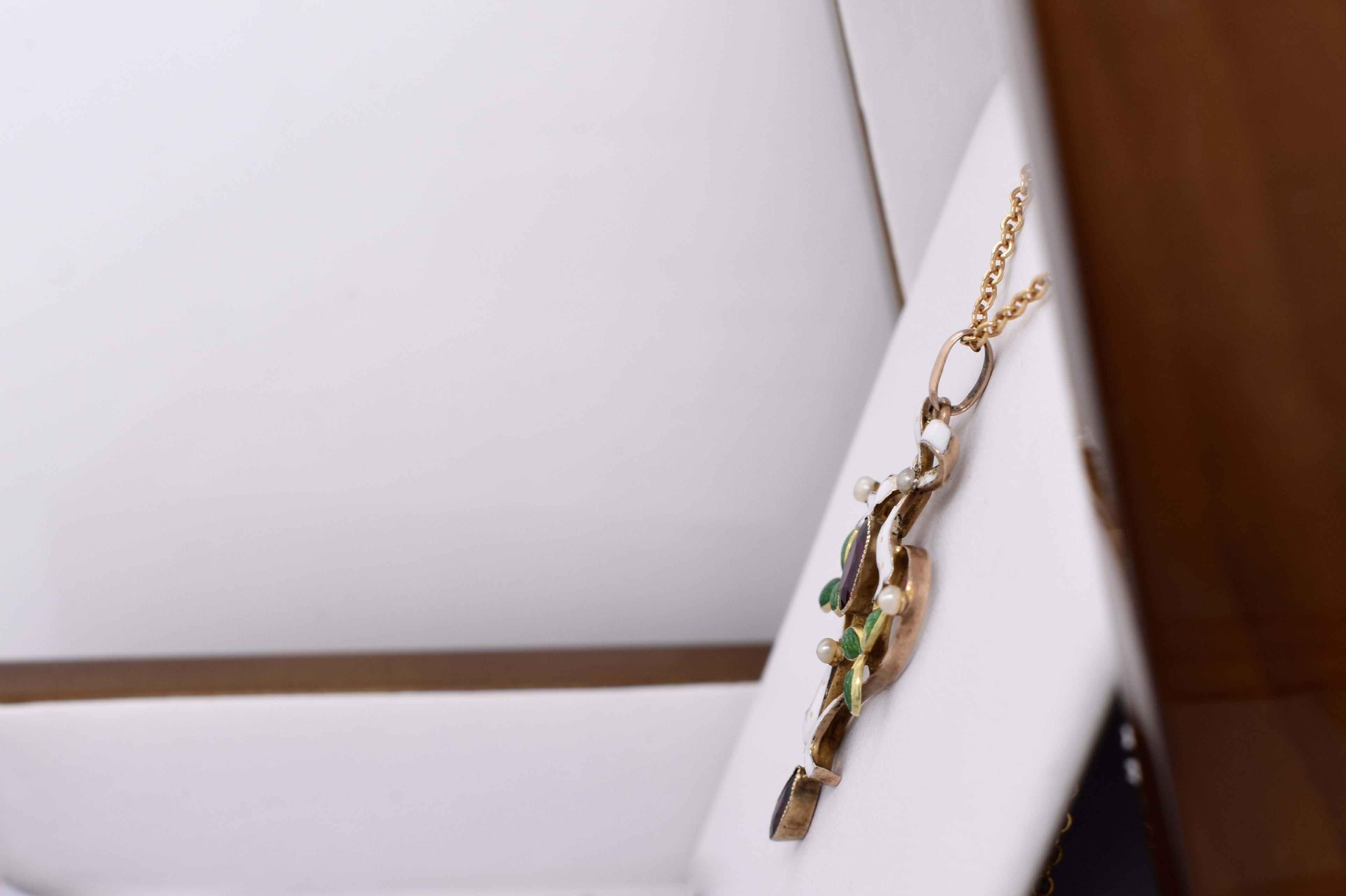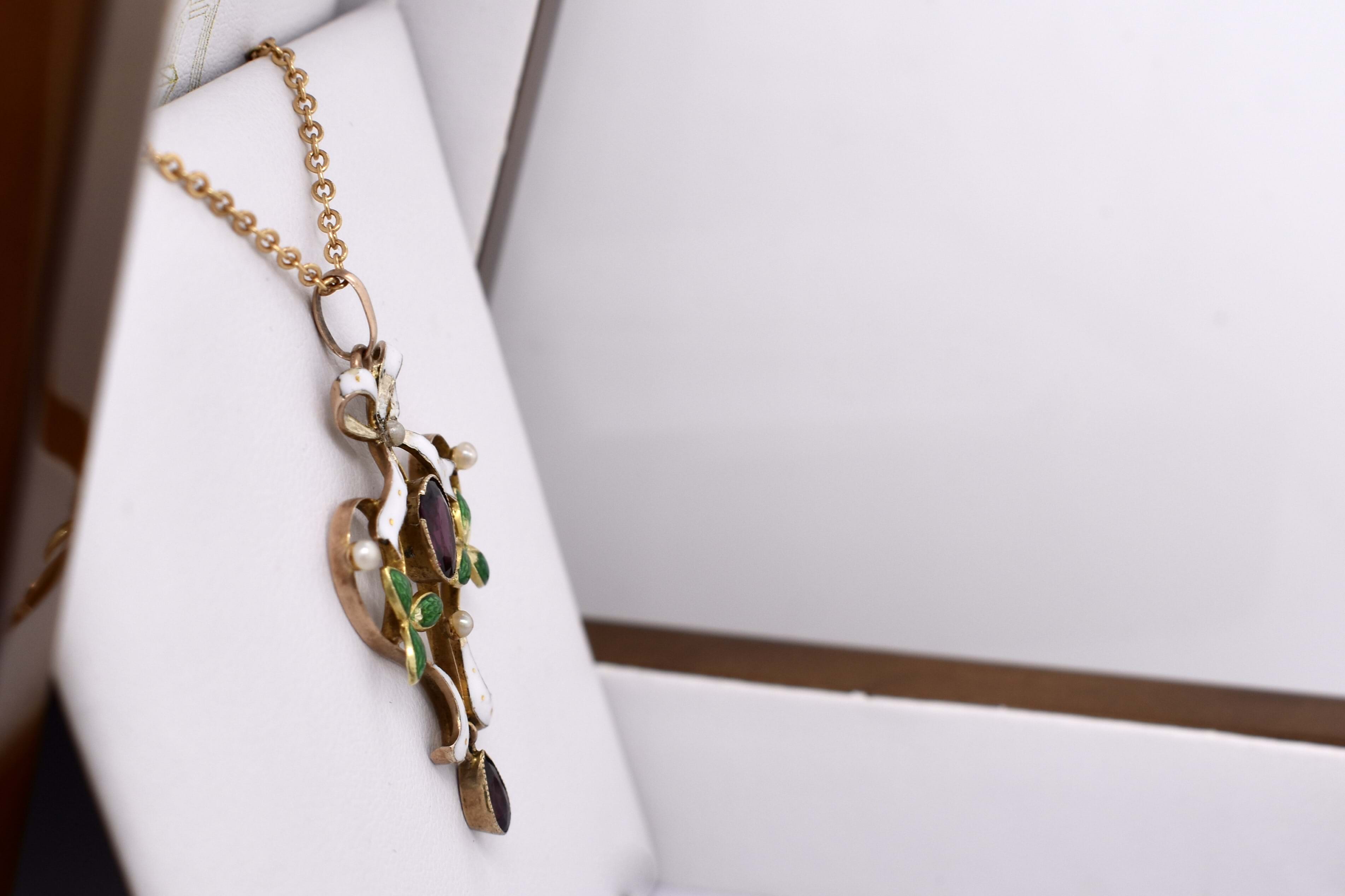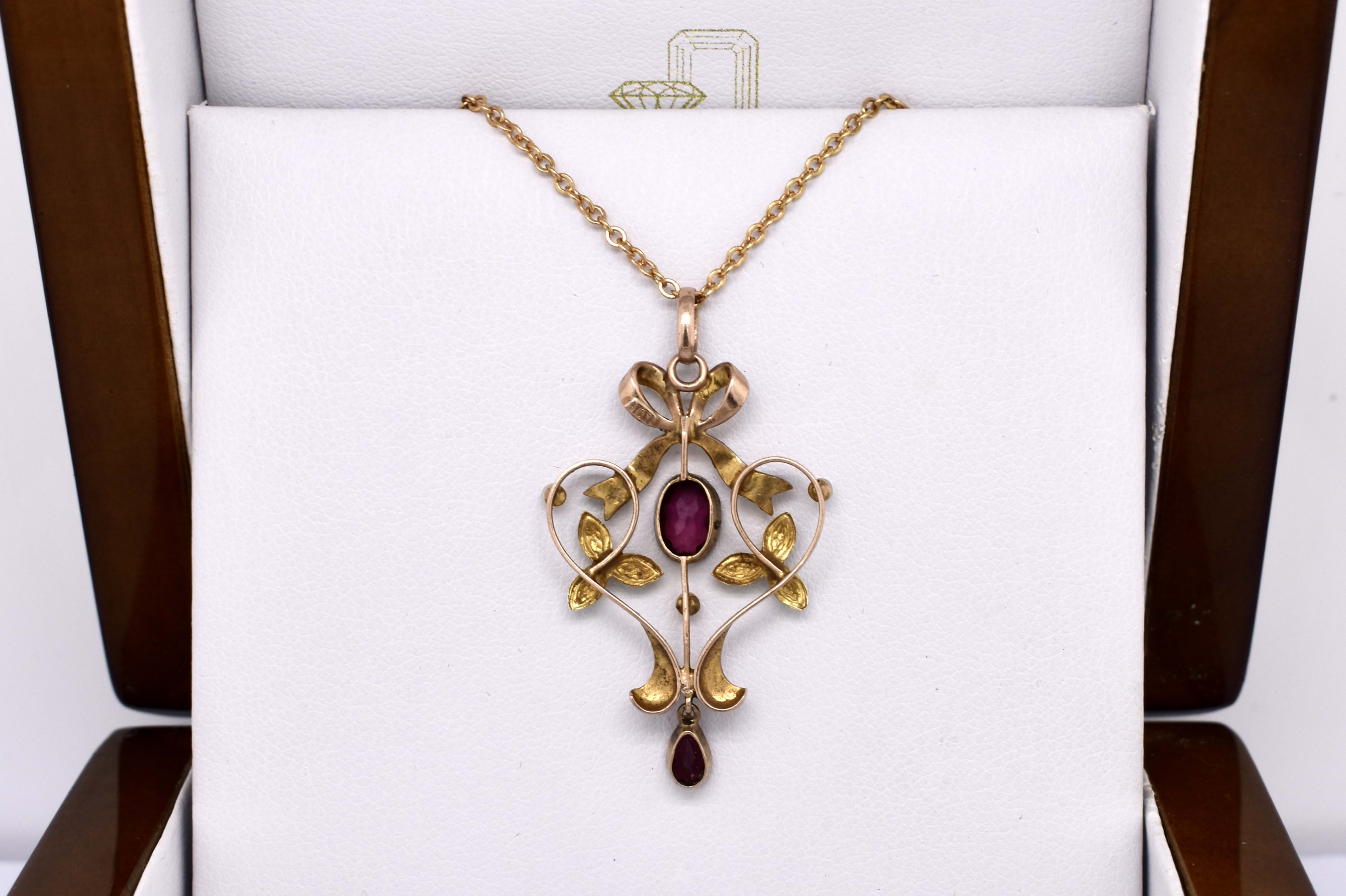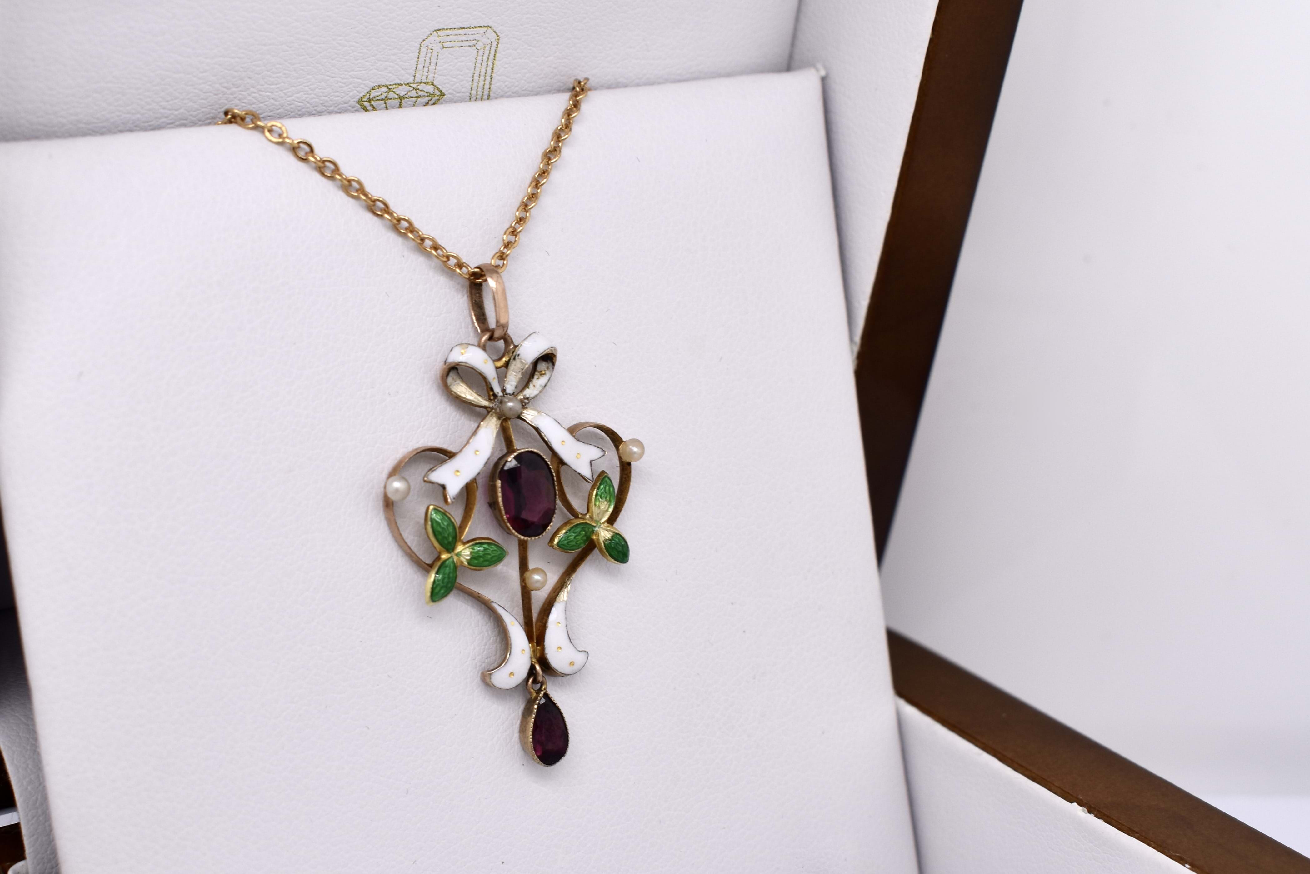 Beautiful and sentimental, this antique pendant has been hand crafted in 9ct yellow gold, dated circa 1900s. It features a lovely bow, scroll and leaf design with green and white enamel detailing and is set with four 1.85mm seed pearls and two gorgeous purple garnets. The centre garnet is an oval measuring 7.00x5.00x2.34mm, weight of 0.65ct and another pear shaped garnet at the bottom measuring 5.70x3.50x2.10mm, equalling 0.30ct. Completed with a plain gold bale.